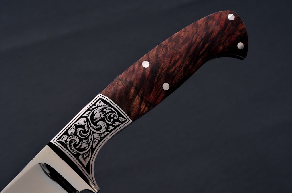 Custom Fixed Blade Knife, by Robert Crowder, Thompson Falls, Montana, with sheath, 3.6'' mirror polished drop point blade, ATS-34 steel, 7.75'' overall, tapered tang, burl wood handle, with nickel silver pins, and scroll engraved bolsters. In an unmarked black leather sheath. Condition is excellent overall, never carried or sharpened. Blade with a few slight scratches near the tip. Tang shows a few light marks from handling. Sheath shows moderate rub marks and wear. Est.: $300-$500.