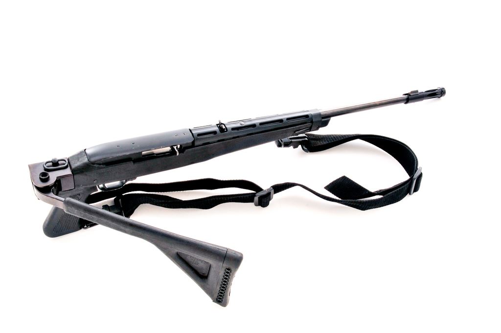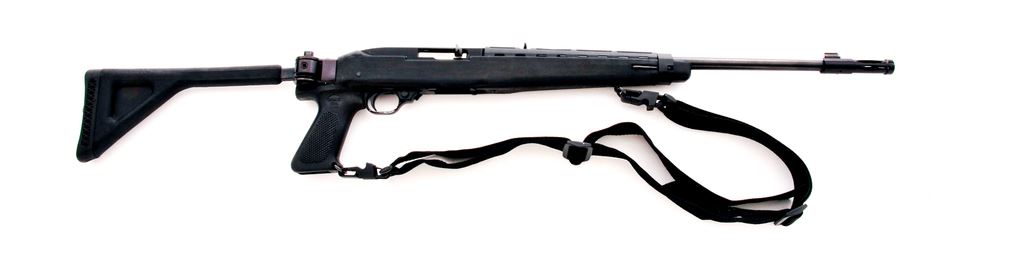 Ruger 10/22 Semi-Automatic Rifle, #125-40224, .22 LR cal., 18.5'' blue barrel with flash hider, receiver with black finish, original stock has been replaced with a Choate Tool Corp. black synthetic folding stock with full pistol grip and nylon Cordura sling. Rifle features a fixed front sight with brass bead and a folding rear sight. No magazine. Condition is very good. Metal with a majority of the original metal finishes. Receiver and triggerguard with scattered light scratches and edgewear. Stock shows normal light scuffs, folding stock functions properly. Action is smooth with an excellent bore. Est.: $150-$300. (Modern) (Paul Hantke collection)