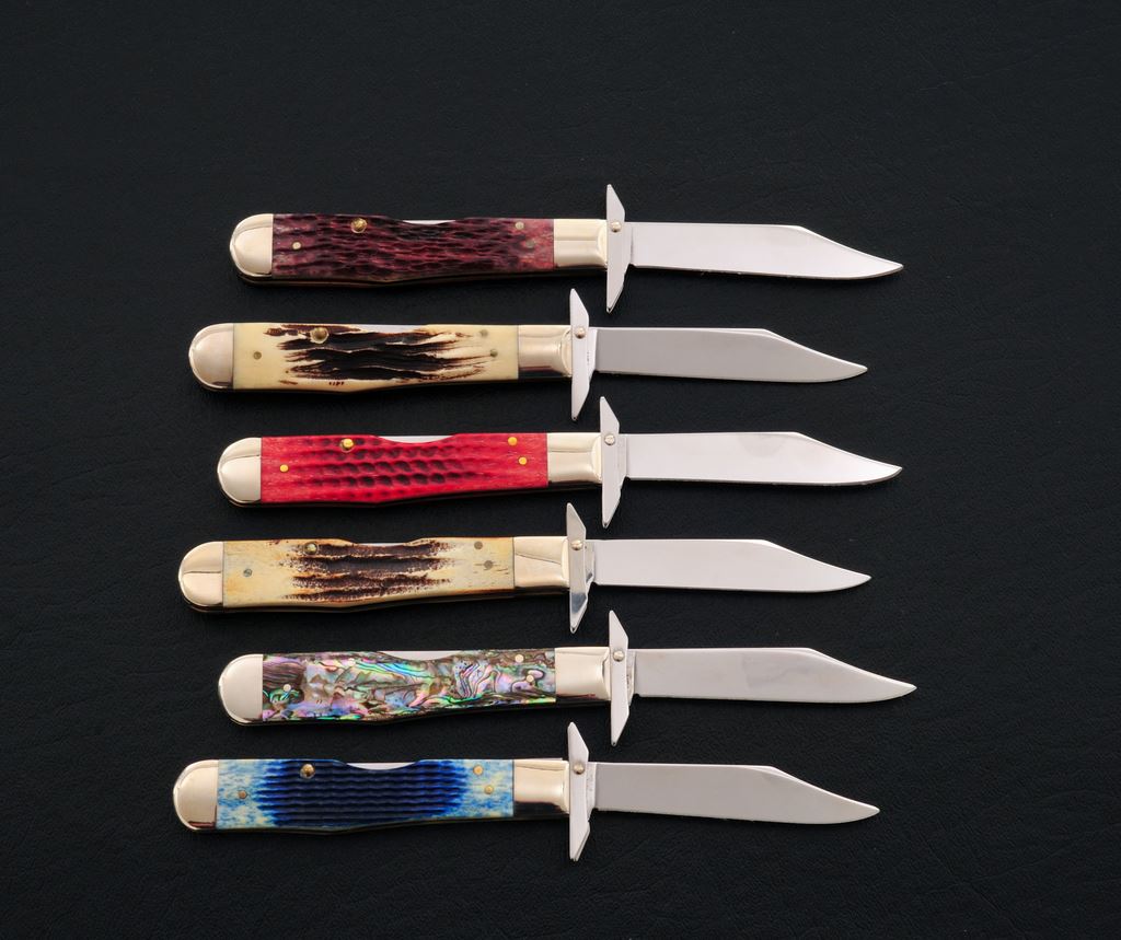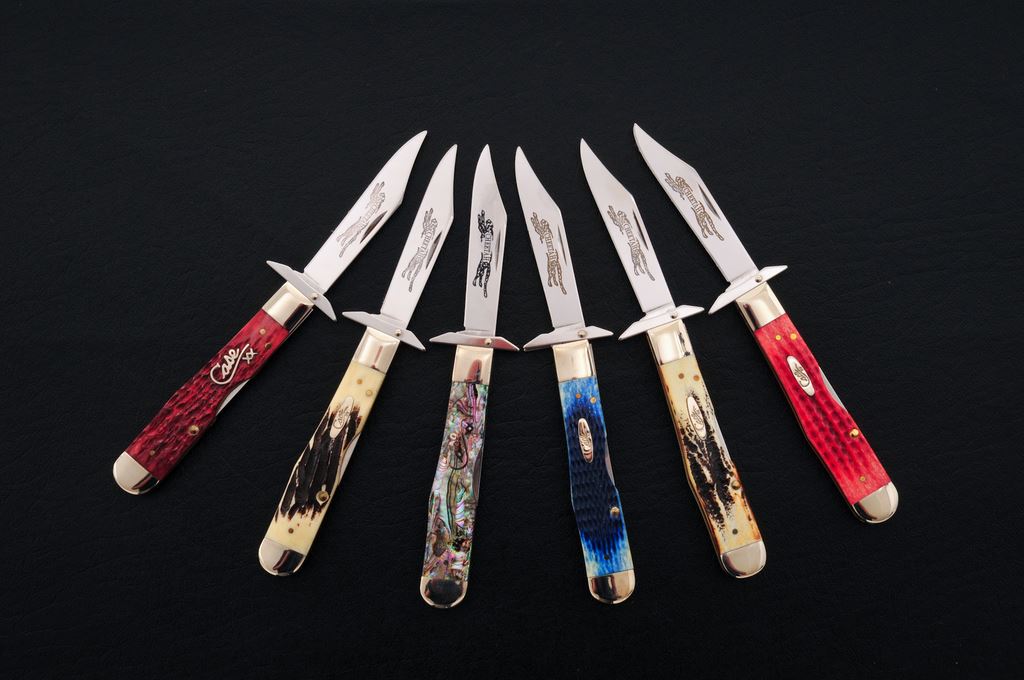 Lot of Six (6) New-in-the-Box Case ''Cheetah'' Folding Knives, including the following models and handle material: Beautiful Model #8111 1/2L SS, with abalone handles. In original black clamshell case with correct slip cover. Also included is one ''Pocket Worn'' knife, Model #6111 1/2L SS, with ''Old Red'' bone handles, as well as the following: #6.5111 1/2L SS, bone stag; #V6111 1/2L SS, vintage bone; #6111 « SS, blue bone; and #6111 1/2L SS, with cranberry bone handles. Each of the last five (5) knives comes in its original box with folding pamphlet and brown tissue paper. Mfg'd ca. 2002-2003. All are in excellent as new condition, never carried or sharpened. Est.: $300-$500/lot.