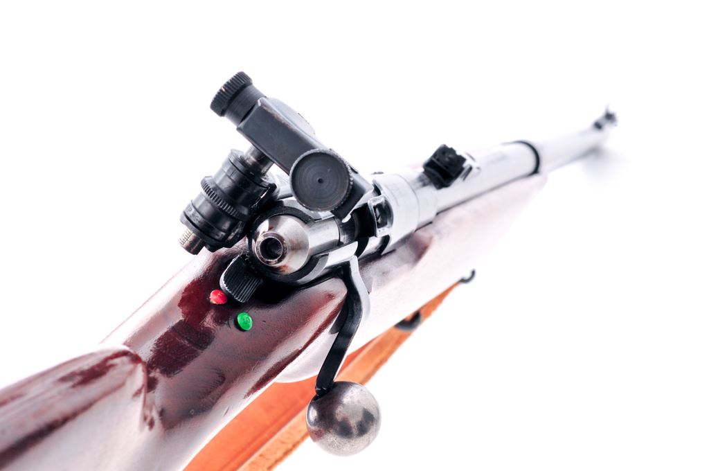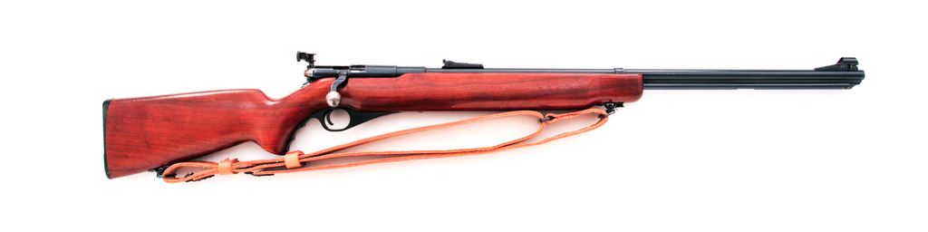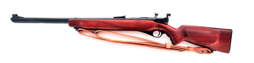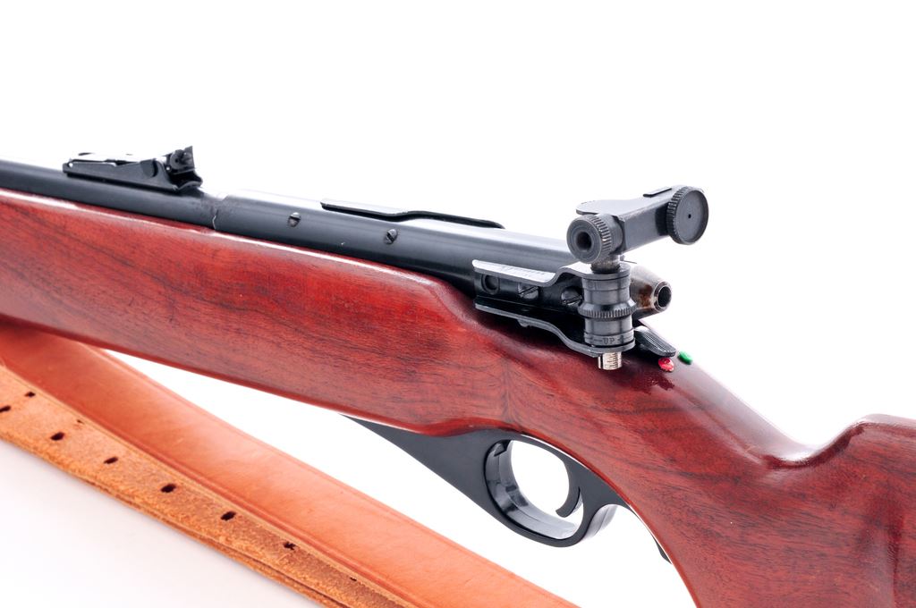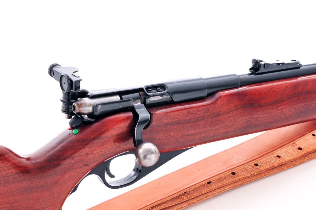 Mossberg Model 46B Bolt Action Rifle, NVSN, .22 S-L-LR cal., 26'' barrel, blue finish, pistol-grip walnut stock with cheekpiece, black plastic buttplate, finger grooved black plastic triggerguard, and tan leather sling marked ''MRT''. Rifle also features a hooded front sight, adjustable ''V''-notched rear sight, and an original receiver mounted Mossberg S-130 aperture sight. Condition is very good overall with approx. 97% original blue. Top of barrel and receiver behind the rear sight with an area of light surface rust. Wood shows scattered shallow scratches and marks from handling; most of the finish remains. Action and bore are both excellent. Est.: $150-$250. (C&R)