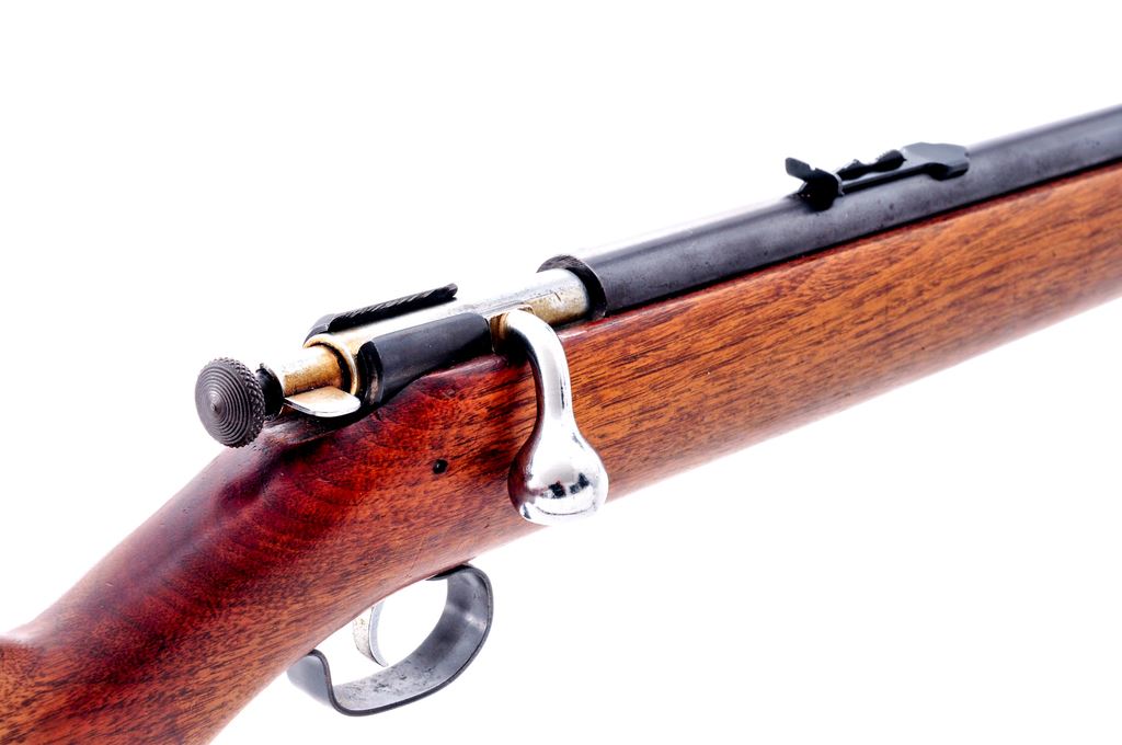 Lot of Two (2) .22 Caliber Winchester Bolt Action Single Shot Rifles: 1.) Model 67, NVSN, .22 S-L-LR, 27'' barrel, blue finish, pistol-grip walnut stock, hard rubber Winchester buttplate, dovetailed silver bead front sight, notched rear sight with elevator. Condition is good. Metal retains approx. 97% moderately toning blue with some speckled oxidation. Barrel address is clear. Wood with small scuffs and scratches; finish has thinned at the forend and wrist. Fine action and bore. 2.) Model 68, NVSN, .22 S-L-LR, 27'' barrel, blue finish, pistol grip walnut stock, hard rubber Winchester buttplate, hooded front sight on ramped base, and rear peep sight. Condition is very good. Metal retains approx. 97% moderately toning blue, also with some speckled oxidation. Barrel address is clear. Wood with an added coat of finish, scattered dings and scratches. Fine action and bore. Est.: $200-$350/lot. (Both/C&R)