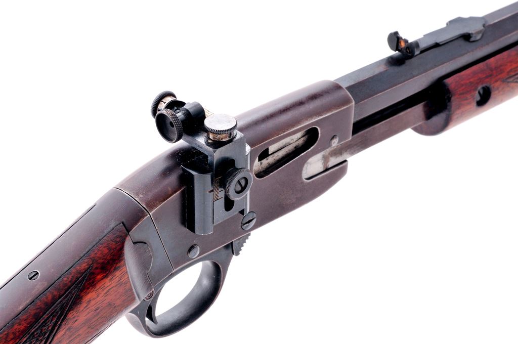 Pre-War Savage Model 29 Pump Action Rifle, #134994, .22 S-L-LR cal., 24'' octagon barrel, blue finish, pistol-grip walnut stock with checkering at the wrist and forend, with a black composition ''SVG'' buttplate, and dovetailed brass bead Marble's No. 5 front sight, Marble's rear sight, and Lyman #56 peep sight mounted to right side of receiver. Condition is good. Receiver with a mostly dark brown and slightly plum colored patina; barrel and magazine tube are a combination brown patina and darkened blue finish with thinning to the highpoints. Barrel address is clear and well defined. Wood shows age and wear consistent with the rest of the rifle including general shallow scratches and small chip at the toe, as well as an older coat of added finish. All sights are later replacements/additions and retain most of their original blue. Action is smooth and crisp with a very good bore. Est.: $150-$300. (C&R)(Joe Poyer collection)