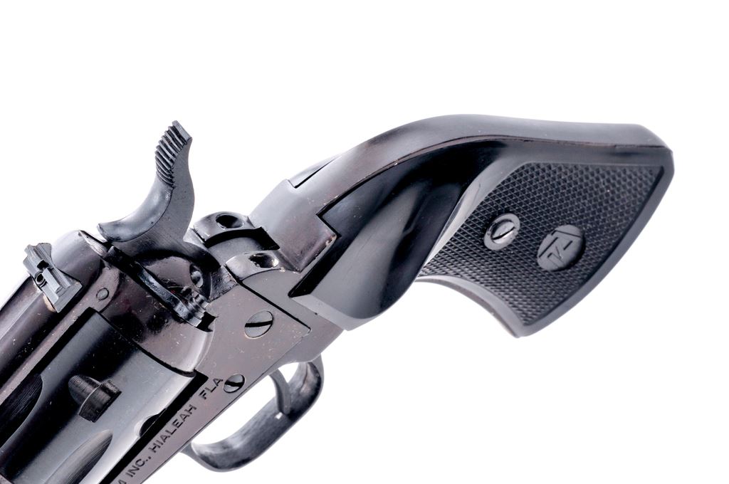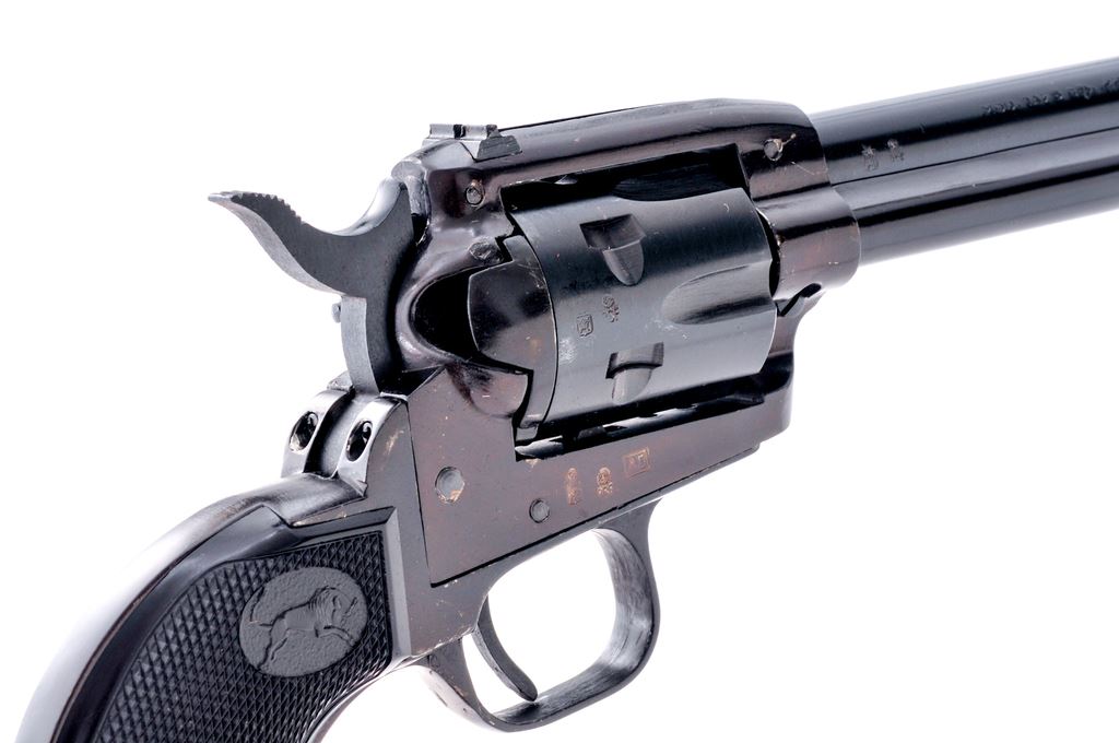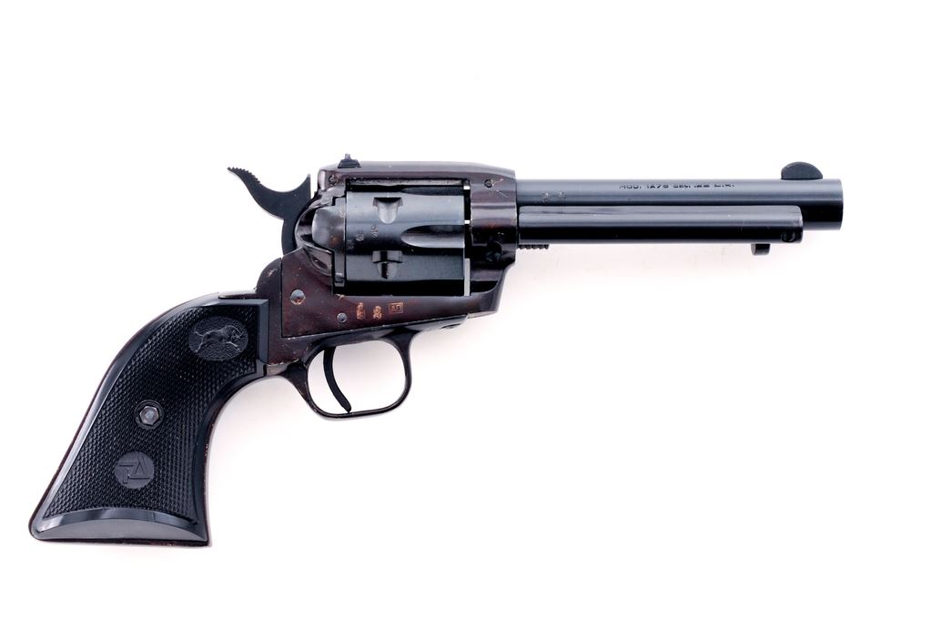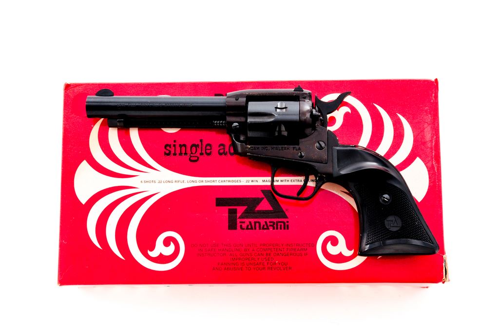 Tanfoglio Model TA76 ''Buffalo Scout'' Single Action Revolver, #A15032, .22 LR cal., 4.75'' barrel, blue finish, factory checkered black plastic grips, with standard fixed sights. In original box with matching end label and owner's manual. Condition is near excellent showing some very light edgewear. Grips with a few slight handling marks to the flat borders; checkering is sharp. A portion of the cylinder with only an extremely faint index line, appearing to have been fired very little or possibly unfired. Bore is excellent with nice rifling. Est.: $125-$250. (Modern/PPT)