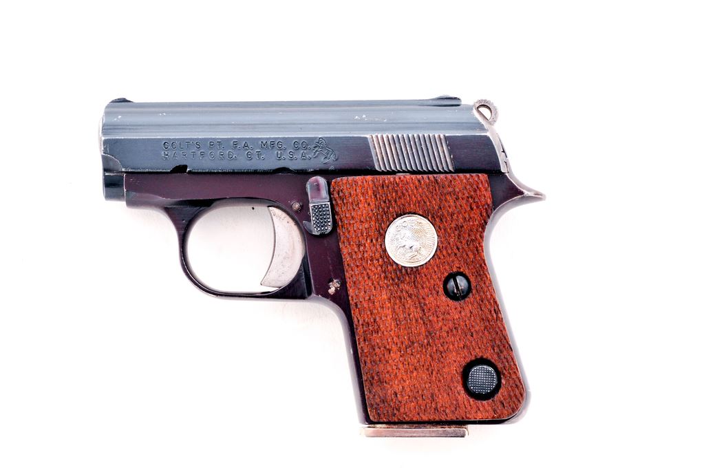 Colt Junior Semi-Automatic Pistol, #OD115972, .25 ACP cal., 2.25'' barrel, blue finish, checkered walnut grips with silver Colt medallions, standard fixed sights, and one magazine marked ''CAL. 25 / COLT''. Mfg'd by Firearms Int'l for Colt in 1973. Approx. 70% blue finish remains and pistol rates as very good overall. Wear to the rear portion of the slide, front and back strap account for a majority of the finish loss. Grips show moderate wear with bright medallions. Good action and bore. Est.: $125-$225. (Modern) (Not available to Calif. residents.)