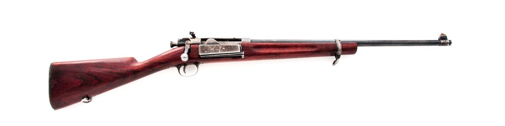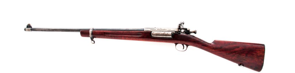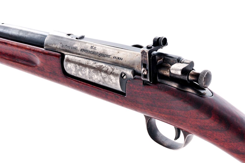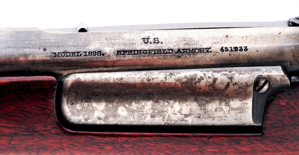 Sporterized U.S. Model 1898 Krag Bolt Action Rifle, #451233, .30-40 Krag cal., 22'' barrel, blued finish, walnut stock, blade front sight, rear military sight removed, replaced with adjustable aperture rear sight. Marked on left side of receiver ''U.S. MODEL 1898. SPRINGFIELD ARMORY''. May 1903 production. Rifle has been sporterized by shortening barrel and stock and removing rear sight and handguard. Condition overall is very good with less than 50% of the reblued finish remaining on metal surfaces, the balance thinning and scattered. Stock has a crack at the buttplate, otherwise very good with most of the refinished gloss varnish remaining on the wood. Action and magazine operate smoothly. Bore is very good with good rifling. Est.: $350-$450. (Modern)