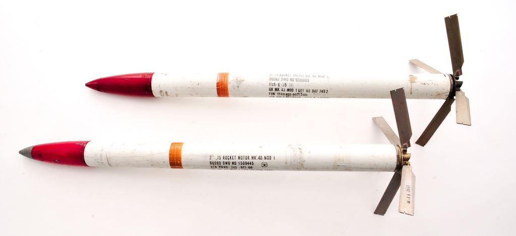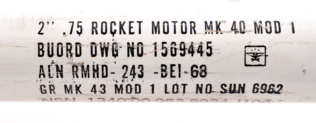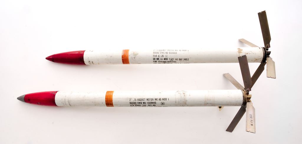 Lot of Two (2) VietNam Era Inert Rockets, U.S. military made in 1969 and Defense Eagle inspected. Both rockets have their folding fins and readable nomenclature, and are in very good overall condition. Est.: $200-$400/lot. (Joe Poyer collection)