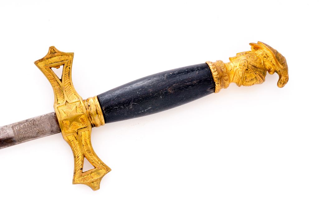 Lot of Two (2) Fraternal Swords with etched decorated blades: 1.) Knight's head pommel with recumbent lion on top of helmet, leather covered grip with stippled flat band wire wrapping, crossguard with shield and ''UR''. Blade is named to ''George Stelzle'' and is maker marked at ricasso by John Wolf, New Haven, Ct.. Scabbard is nickel plated with high relief fittings. Blade measures 28'' and overall length is 37''. Shows age, losses to the leather wrapping on the grip, rust and staining on the blade, and rust on the scabbard. Missing chain from grip to pommel. 2.) Knight's helmet pommel with eagle perched on top, black ebony wood grip, etched decorated blade with ''A.O.U.W.'' and named to ''C.A.Donnely''. Maker marked at ricasso by G.F. Foster and Son, Chicago, ILL. Blade measures 32'', overall length is 40''. Metal scabbard was originally nickel plated but has lost most of its finish, some gray paint remaining on scabbard in some areas, with rust patina overall. Blade shows age graying and light rust patina overall. Est.: $200-$300/lot.