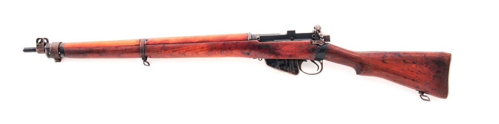Composite British No. 4 Mk 2 Lee-Enfield Bolt Action Rifle, #UF55A36255, .303 British cal., 25.2'' barrel, blue/painted finish, hardwood stock, blade front sight with protecting ears and 300/600 yard flip rear sight. Marked on left side of receiver ''No 4 Mk 2''. Rifle is a composite of issue and aftermarket parts, all numbers are mismatched. Condition overall is fair with approx. 40% finish remaining on metal surfaces, the balance turned to a brown patina or spray painted with an aftermarket black spray paint. Bolt assembly is heavily corroded and is not serviceable. Several modern screws are installed. Front handguard has been sanded and left unfinished, otherwise the wood is very good with darkening, light dents, and scratches. Bore has darkening in the grooves, otherwise very good. Bolt is corroded making the action unserviceable. Import stamped on right side of barrel. Est.: $150-$300. (C&R)