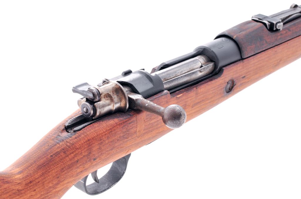 Lot of Two (2) Chinese Type 24 Chiang Kai-Shek Mauser Bolt Action Rifles: 1.) #17191, 8mm Mauser, 23.5'' barrel; barrel with mismatched serial number, ''bys'', and Nazi proofmarks. Hardwood stock has been spliced 13.5'' down from the muzzle and is missing the upper handguard. Barrel with front sight base only and ''V''-notched tangent rear sight; missing rear band and spring; bayonet lug is present but needs permanent attachment. Receiver ring with ''41st Arsenal'' stamp. Numbers do not match. No visible import marks. Condition is fair. Metal is a combination blue finish and dark patina, with some scattered pitting and light surface rust. Receiver ring markings with added red paint. Wood with oil darkening, above-mentioned splice, and wood filler at the pistol grip. Action is good; bore with some areas of very light pitting, with plenty of rifling left. 2.) #08452, barrel is 23'' in length with Czech 7mm (7x57mm) import marks, with blue/matte finish, hardwood stock, inverted ''V'' front sight, and ''V''-notched tangent rear sight. Receiver ring with ''Chinese Markings''. Numbers do not match. Top of barrel is import marked. Condition is fair to good. Metal with a combination of different finishes, some parts are worn bright. Some of the added finish was applied over light pitting, most noticeable on the receiver. Upper handguard with oil darkening; stock has been sanded of its finish; right side with an infill at the bolt handle cut out. Good action; dark frosted bore with sharp rifling. Est.: $250-$400/lot. (Both/C&R)