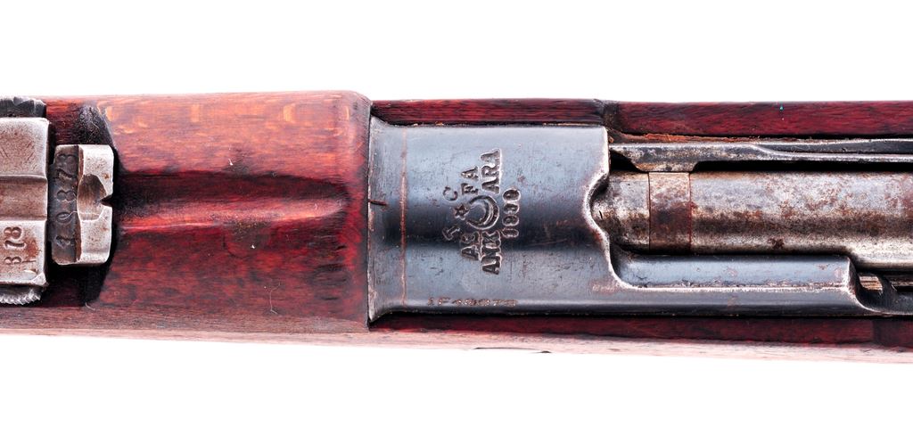 Model 1893 Turkish Mauser Bolt Action Rifle, converted in 1939, importer applied serial #1F40878, original #40878 on rear portion of receiver, 8mm Mauser cal., 29'' barrel, blue finish, hardwood stock, inverted ''V'' front sight, ''V''-notched tangent rear sight, with cleaning rod. Receiver ring with standard ''ASFA / Ankara'' markings and dated ''1939''. Right side of barrel is import marked. Numbers do not match. Metal is good. Approx. 60% thinning and toning blue remains; barrel and receiver retain a majority finish with scattered areas of light surface rust, heavier on the bolt handle and buttplate. Stock is very good with scattered small dings and mars, with some oil darkening. Receiver ring markings are clear. Good action and bore; bore with nice rifling. Est.: $125-$250. (C&R)