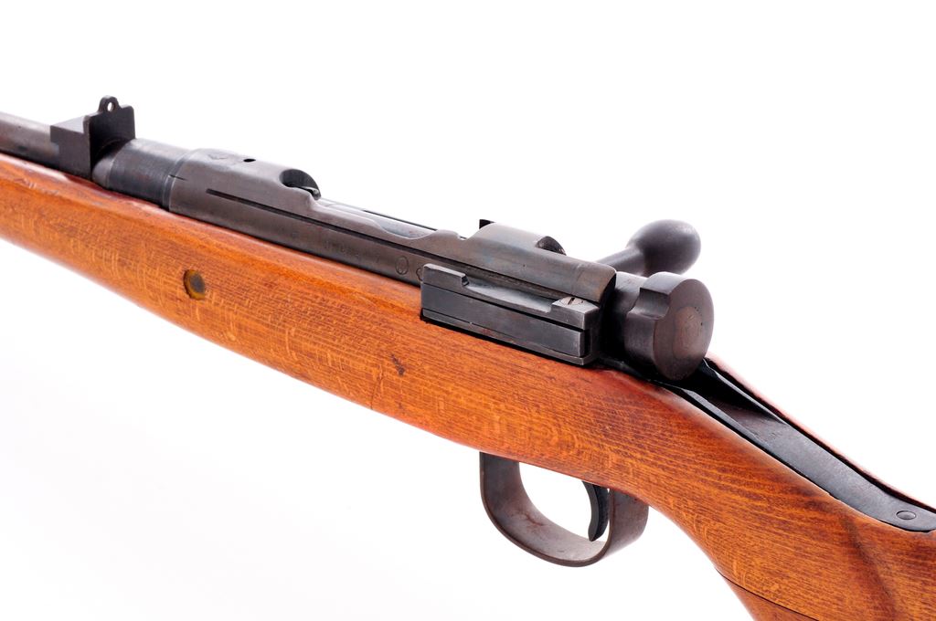 Sporterized Japanese Type 99 Arisaka Bolt Action Rifle, #9047, 7.7mm Japanese cal., 21.3'' barrel, blued finish, hardwood stock, no front sight, and fixed rear peep sight. Stamped on left side of receiver with 27th Series mark next to Tokyo Juki Kogyo, Tokyo arsenal stamps. Royal chrysanthemum partially removed. No model information visible on receiver ring. Rifle has been sporterized by shortening stock and barrel and removing handguard and hardware. Front sight and buttplate have been removed and rear sling slot has been filled. Condition overall is good with less than 40% finish remaining on metal surfaces with overall thinning and patina. Stock has a chip at the toe and has been sanded and refinished with a light colored varnish. Action is smooth, bore is very good with strong rifling. Est.: $150-$250. (Modern)
