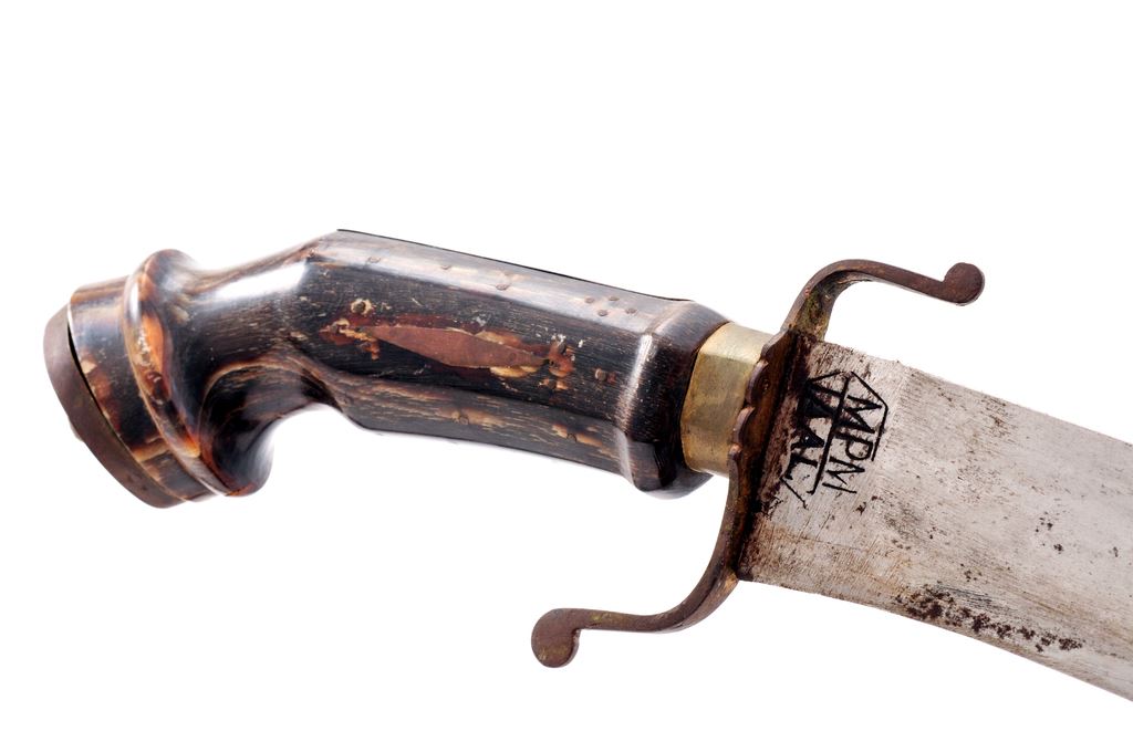Lot of Two (2) Edged Weapons: Ethiopian Sword and South American Machete: 1.) Long Ethiopian double edged fighting sword with horn handle features an engraved and decorated double fullered blade, measuring 31.5'' in length, with faint markings at the ricasso area. Blade has a dark patina with light surface rust. Horn handle is retained at the top by a large domed washer and peened tang. There are a few chips in the horn, especially near the blade. Overall length is 36''. No scabbard. 2.) Machete of South American origin, with decorated leather scabbard, and 19.5'' blade with markings near the ricasso area of ''MPM TAAL''. Handle is made of horn and retained by a brass nut and decorative brass washer. Brass ''S-shaped guard and grip ferrule. Leather scabbard has two hanger rings. Overall length is 26''. Est.: $150-$250/lot. (Joe Poyer collection)