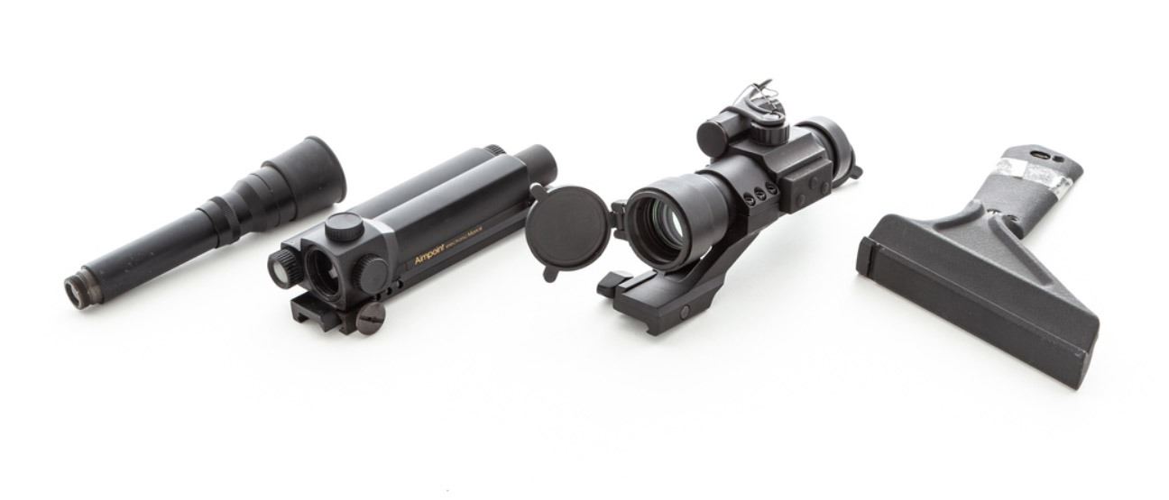 Lot of Two (2) 1980's Optical Devices, including an Aimpoint MK III with mount for 1911 style pistol; and an import red-dot sighting system with mount marked ''Commando''. All are in very good condition. Est.: $150-$250/lot. (Joe Poyer collection)