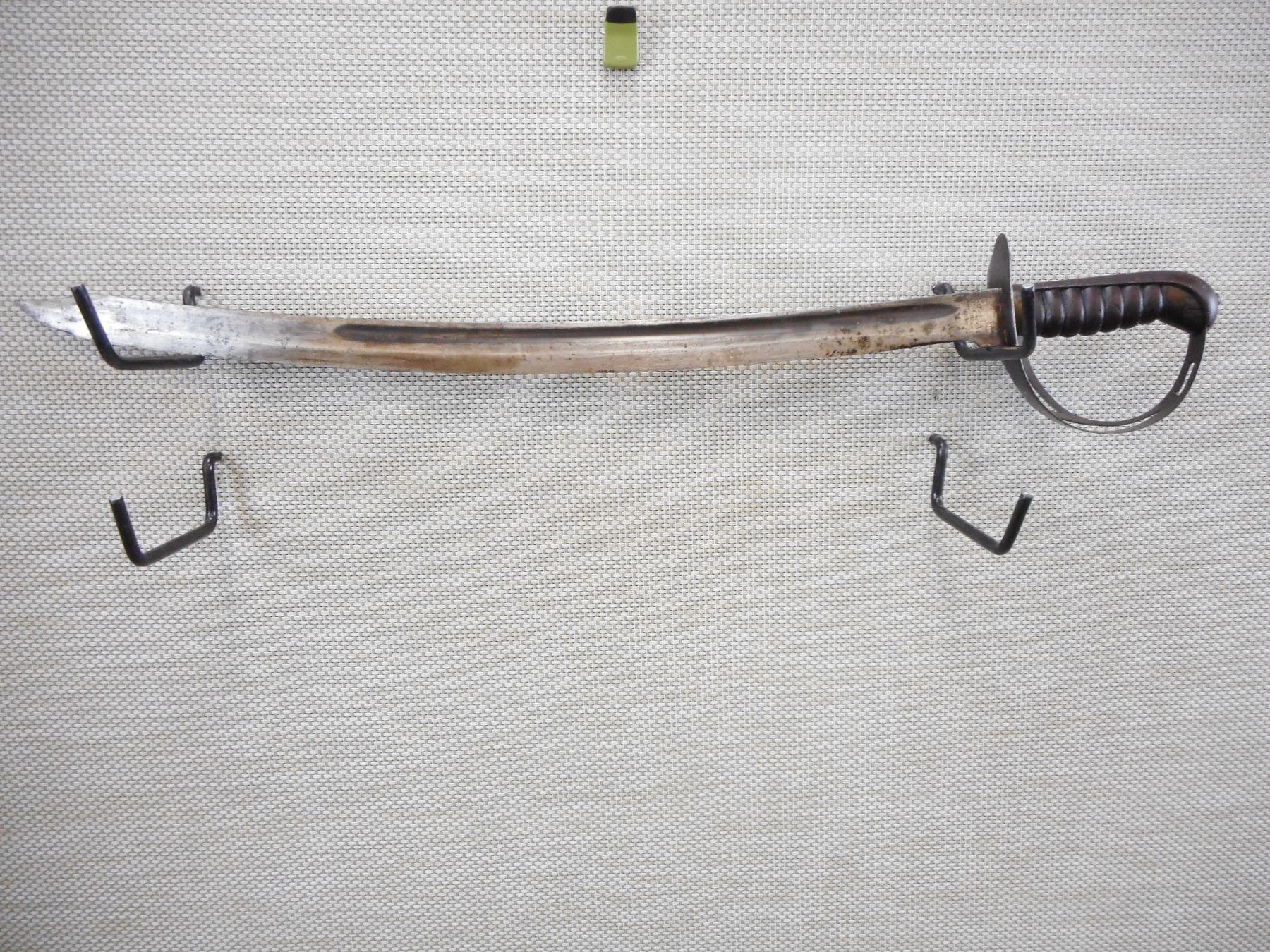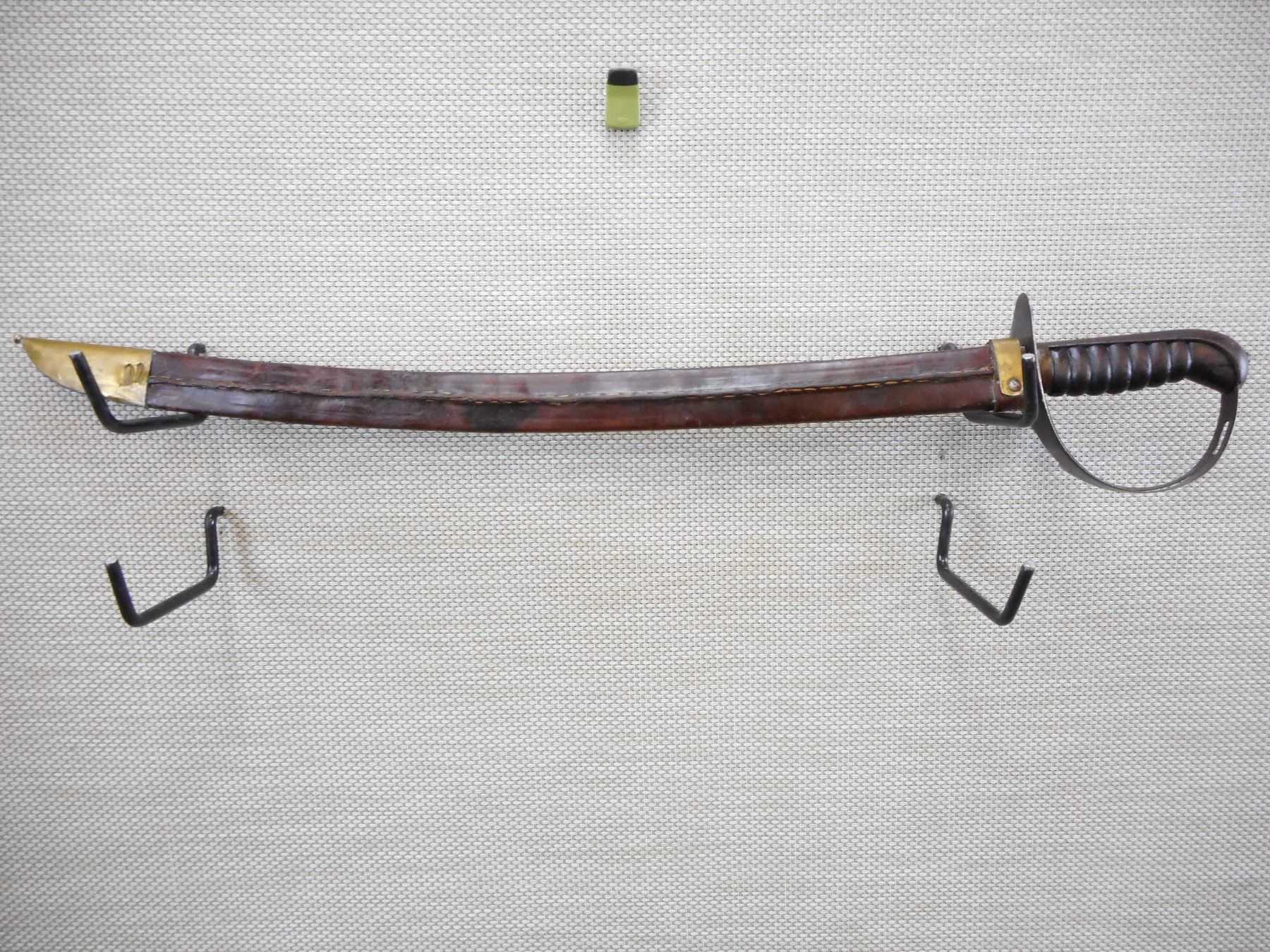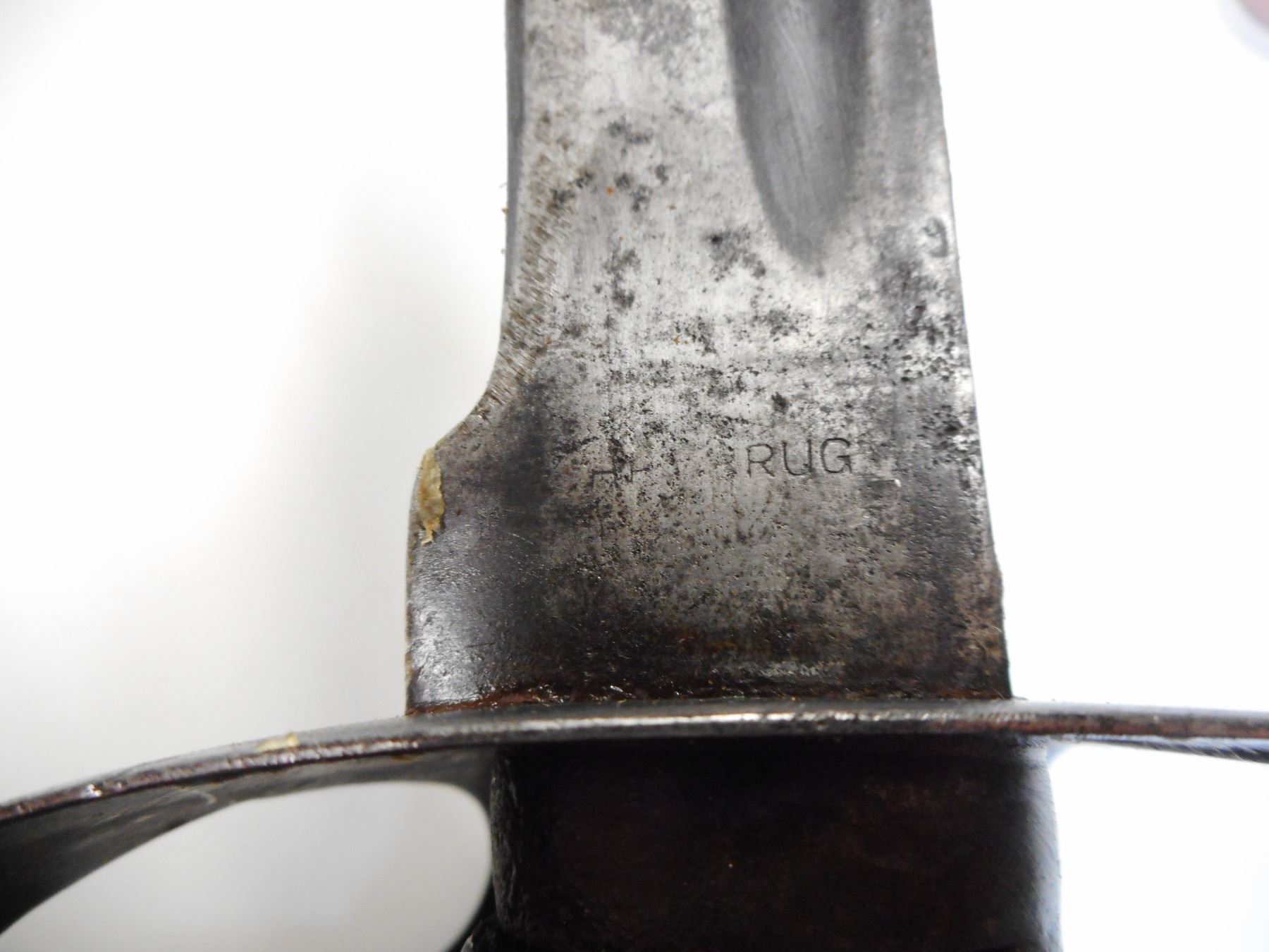 DUTCH KLEWANG WITH SCABBARD , RICASSO MARKED RUG, UNDERSIDE OF CROSSGUARD MARKED P.B.C. 42, WITH LEATHER SCABBARD
