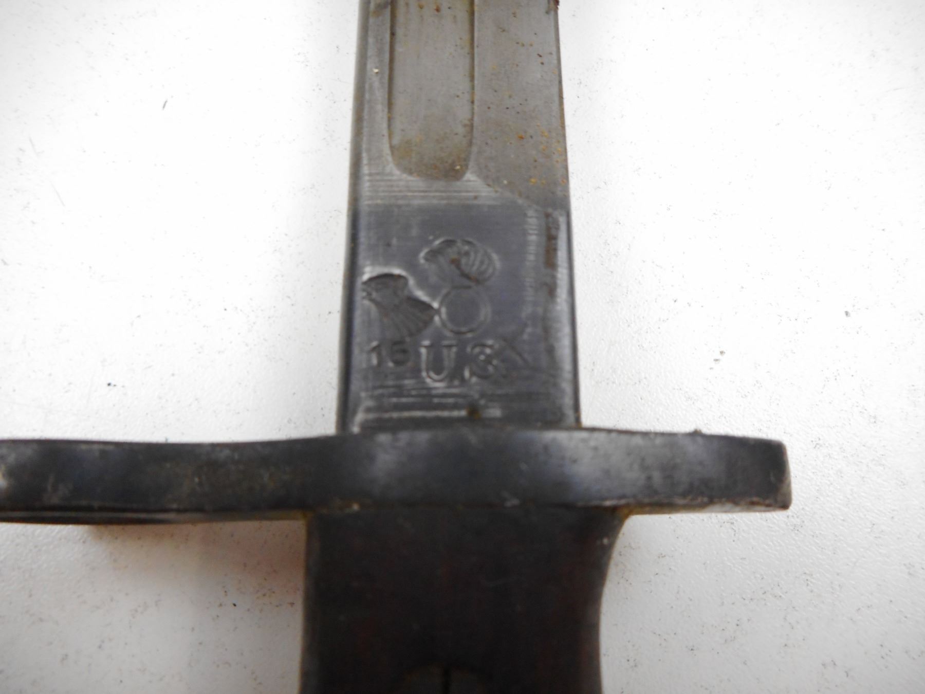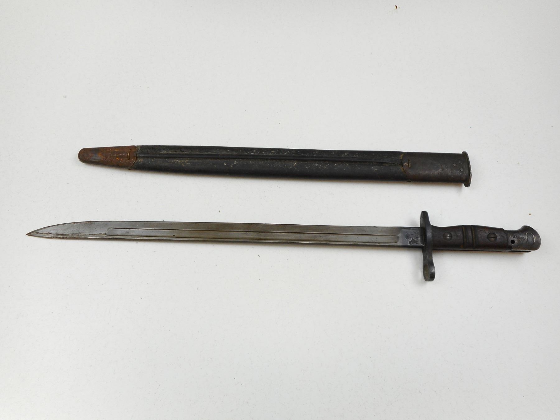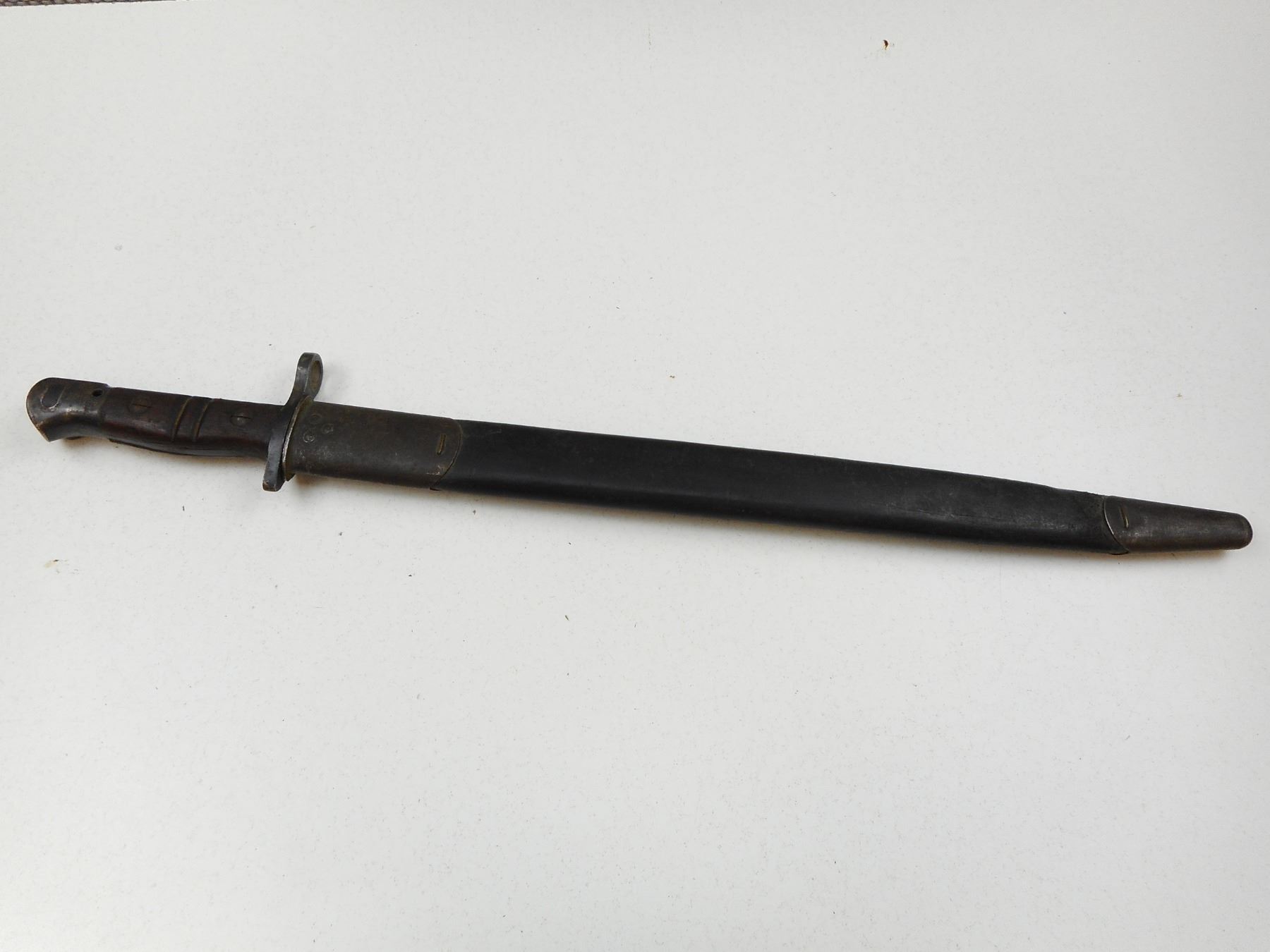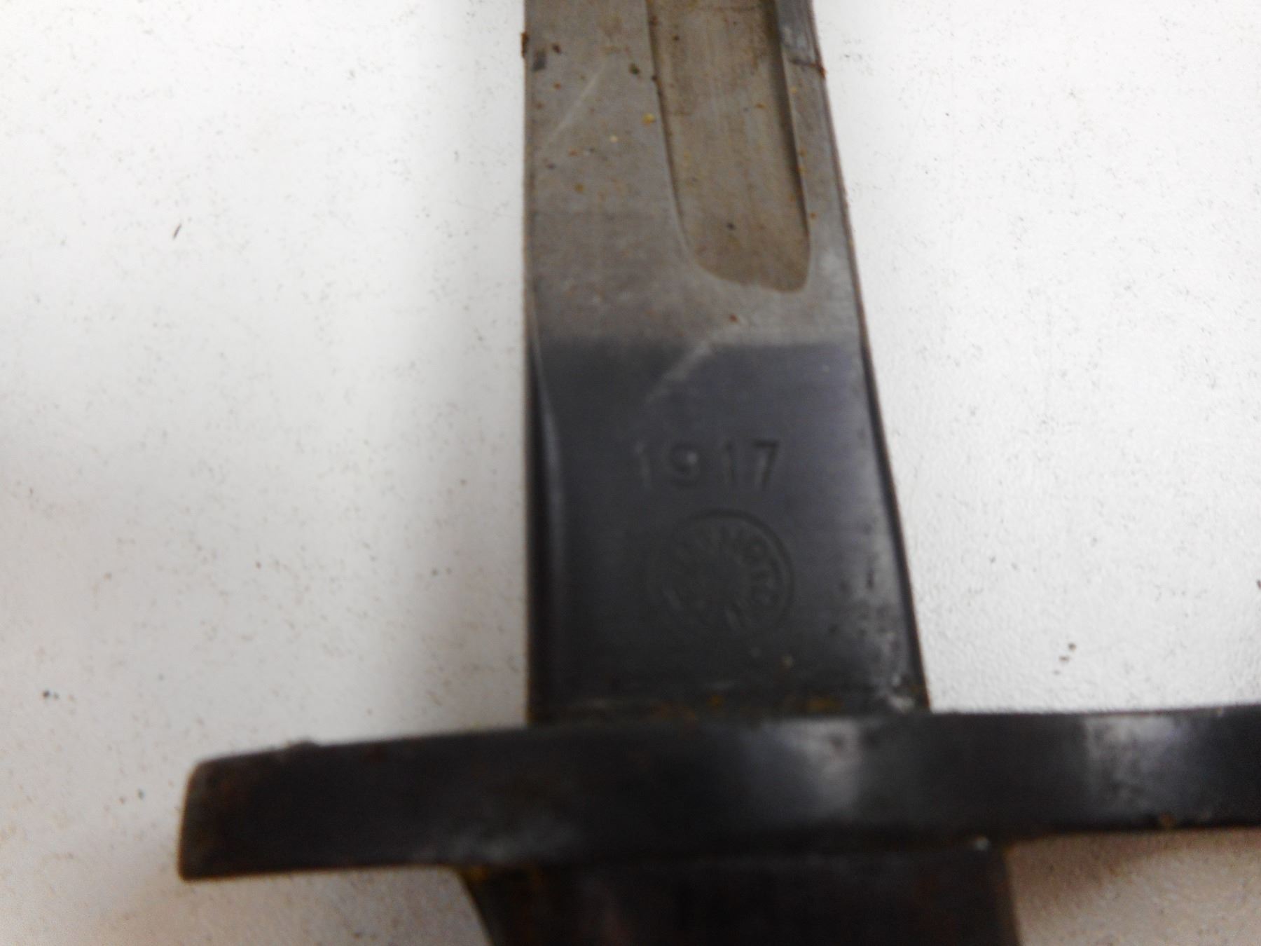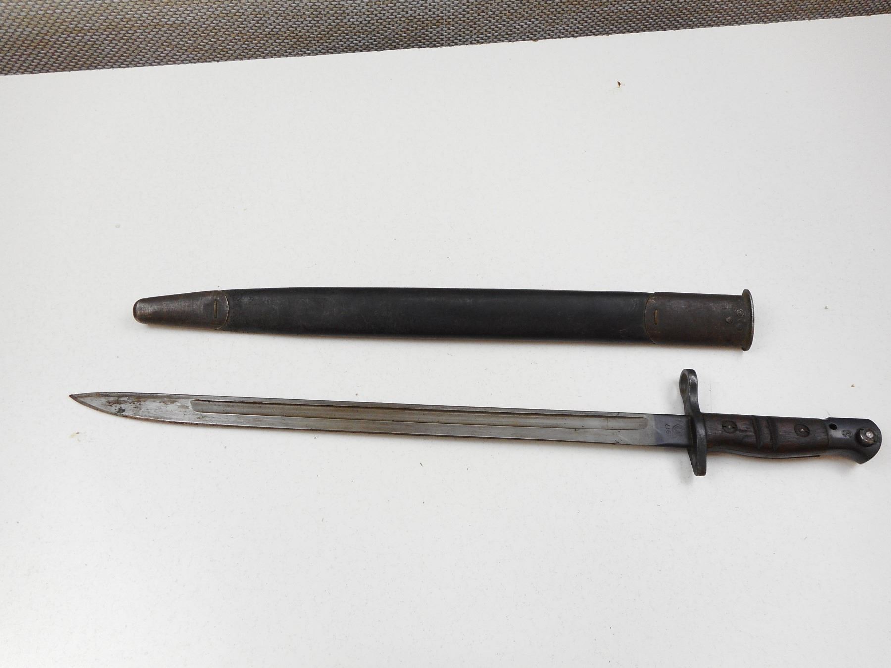 REMINGTON 1917 PATTERN BAYONET WITH SCABBARD , RICASSO MARKED 1917 REMINGTON & ORDNANCE MARK WITH FLAME OVER US & EAGLE HEAD OVER 16, POMMEL WITH CANADIAN BROAD ARROW MARK & HO65