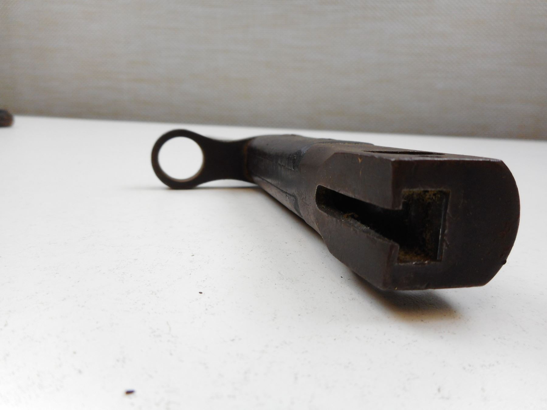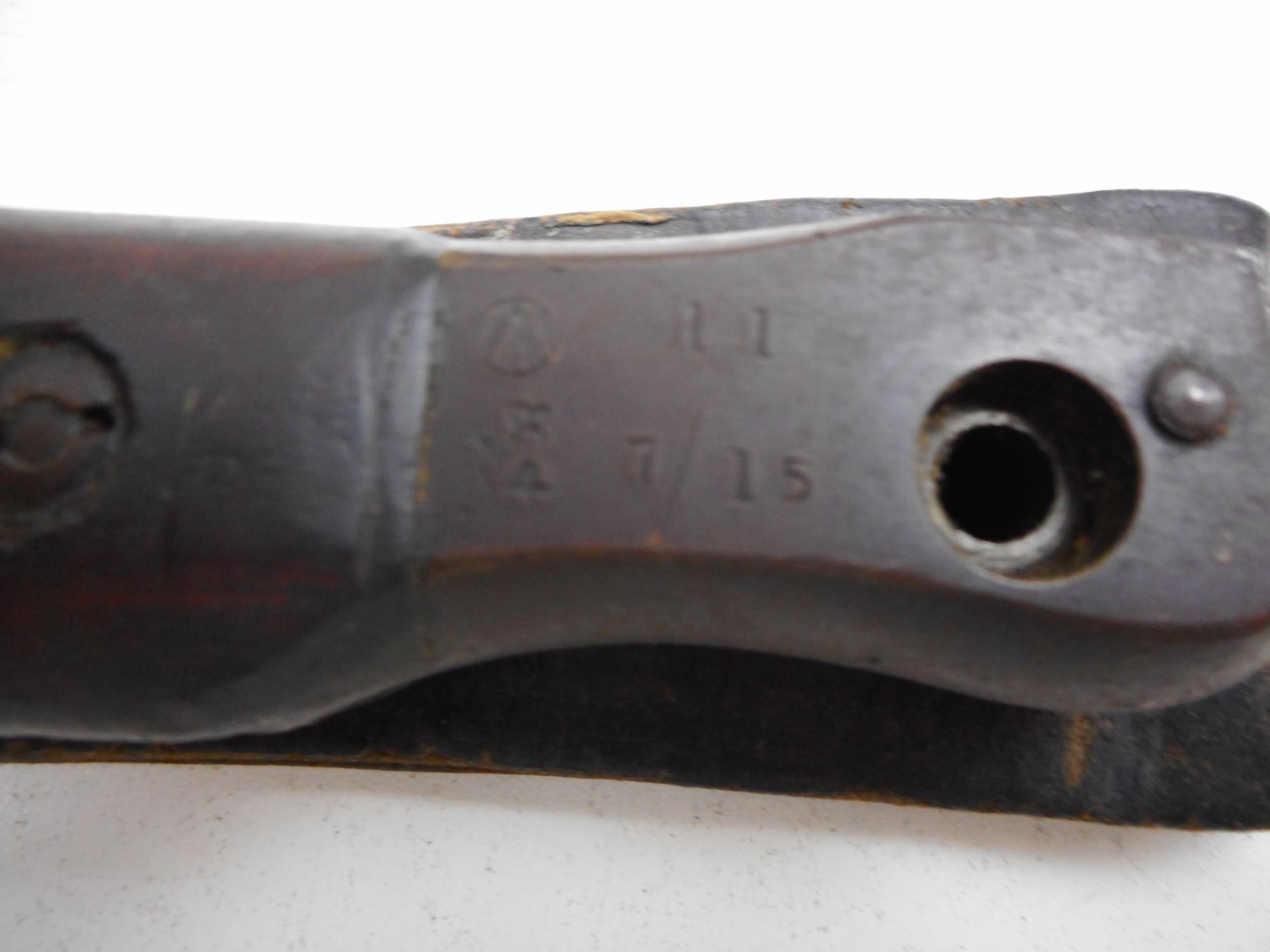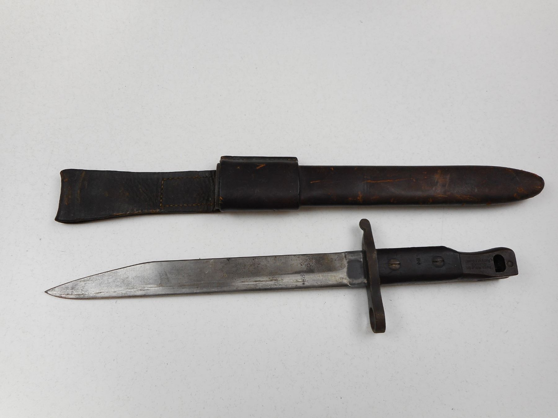 WWI CANADIAN ROSS BAYONET WITH SCABBARD , POMMEL STAMPED ROSS RIFLE CO . QUEBEC PATENTED 1907, WITH CANADIAN BROAD ARROW MARK 11, DATED 7/15 & 1.17, 36, 320, WITH SCABBARD THROAT STAMPED 48, 638.12.16, LEATHER MARKED R.R.C.1916 MKII