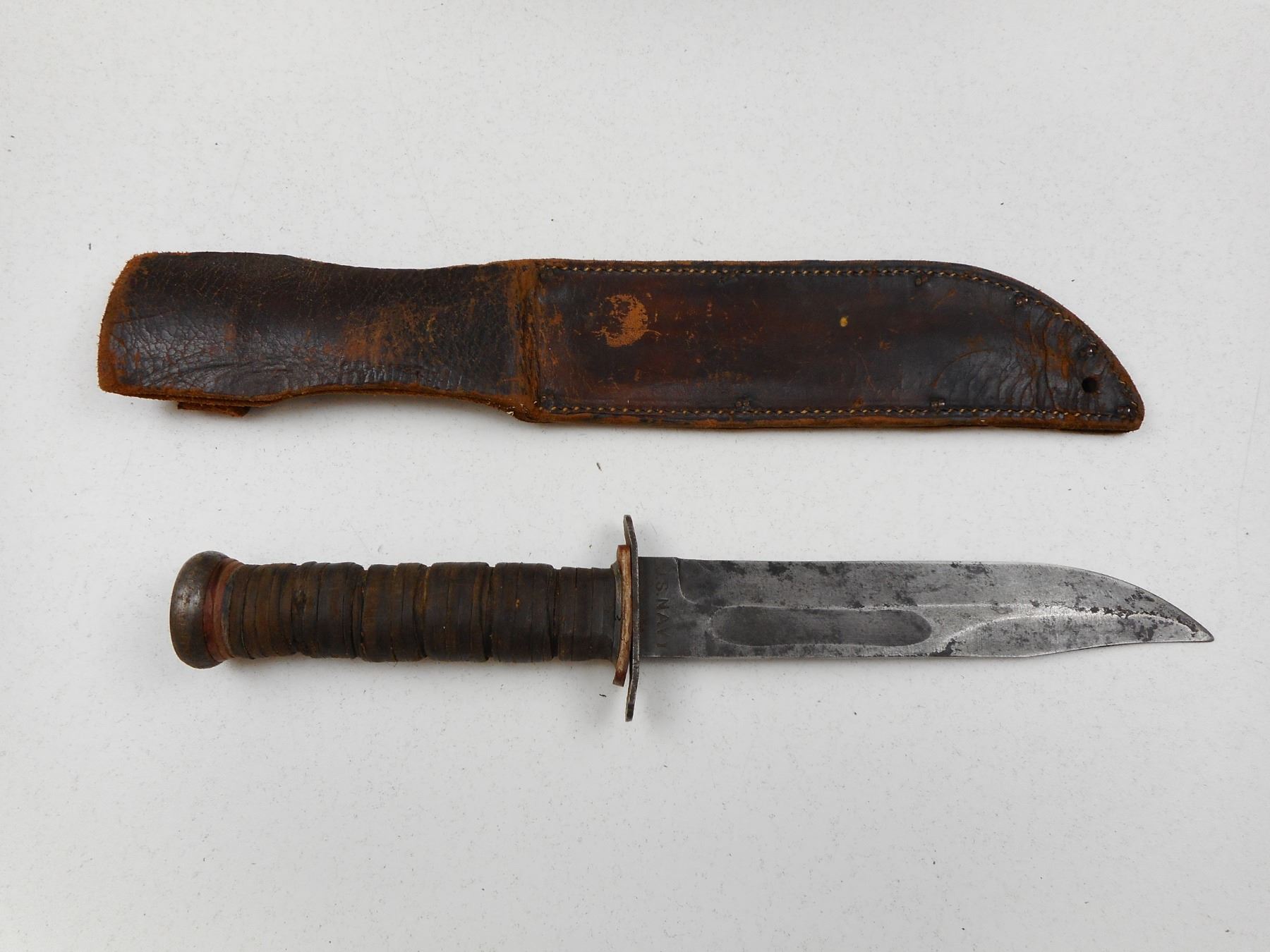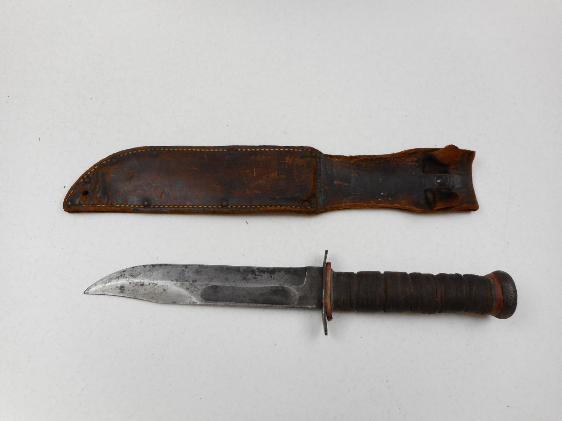 U.S. WWII ERA PAL RH-37 KNIFE WITH SHEATH , RICASSO MARKED U.S. NAVY, RH PAL -37, WITH LEATHER SHEATH STAMPED PAL BLADE CO