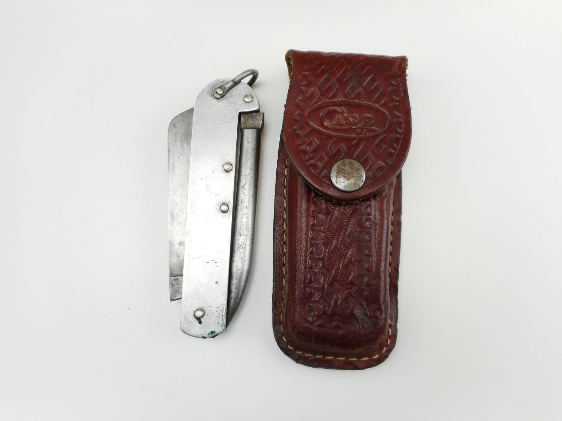 CANADIAN WWII CASE XX CLASP KNIFE WITH SHEATH , RICASSO MARKED CASE XX METAL STAMPINGS LTD WITH CANADIAN BROAD ARROW MARK ON GRIP, WITH LEATHER CASE XX SHEATH BASKET WEAVE PATTERN
