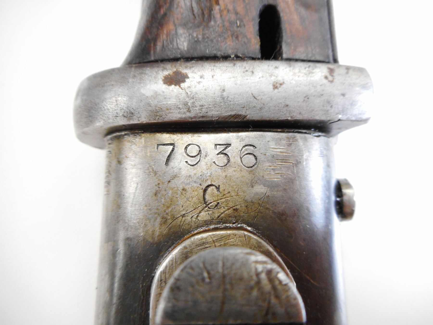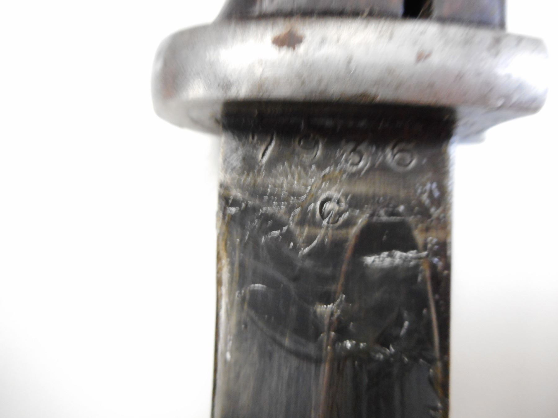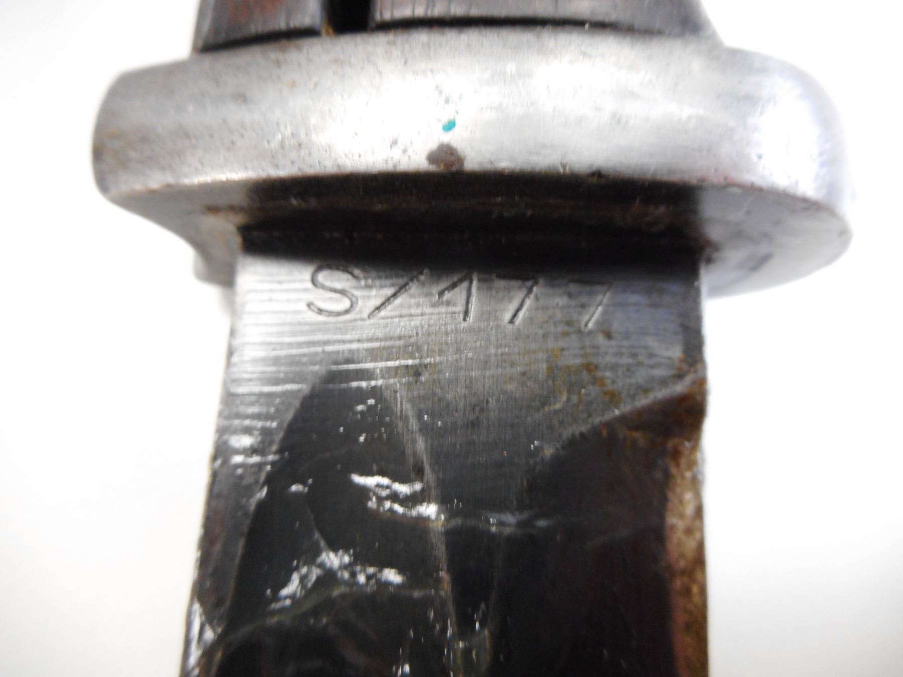 GERMAN WWII K98 BAYONET WITH SCABBARD , RICASSO MARKED 7936 C & S/177 WITH SPINE MARKED 37, MULTIPLE WAFFEN MARKS ON AND AROUND POMMEL, WITH SCABBARD & MATCHING SERIAL NUMBER 7936 C REVERSE MARKED S/177 1937