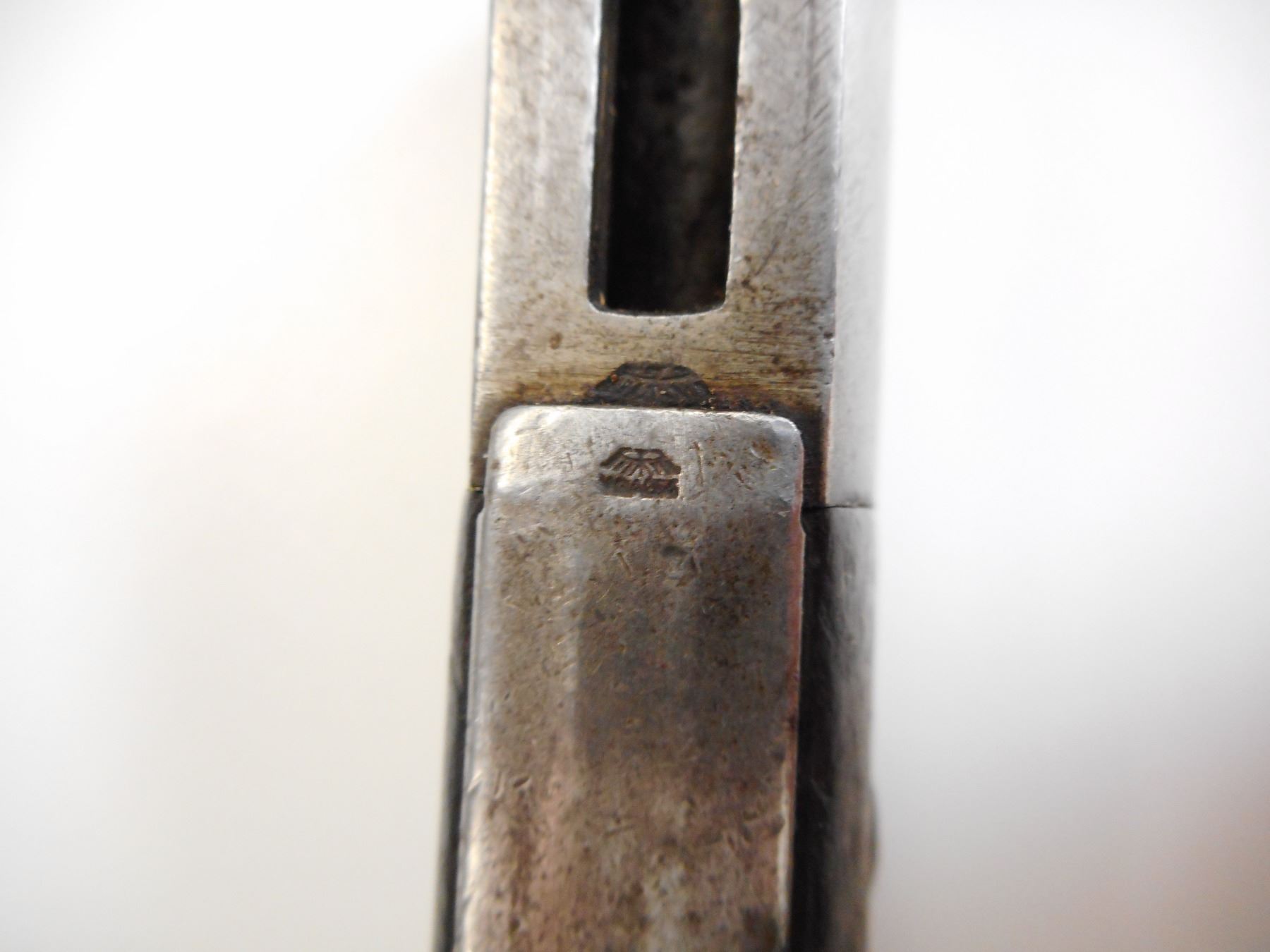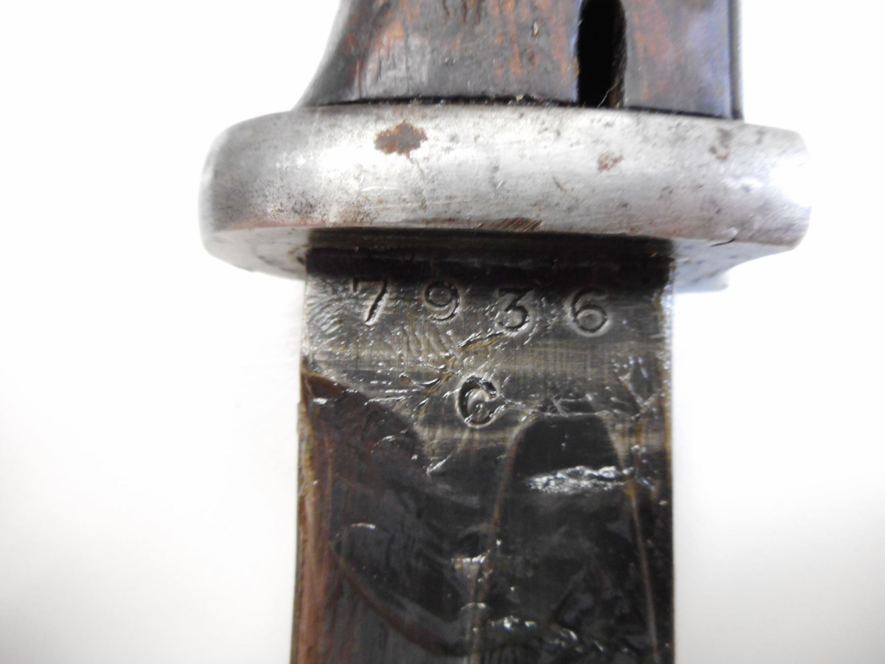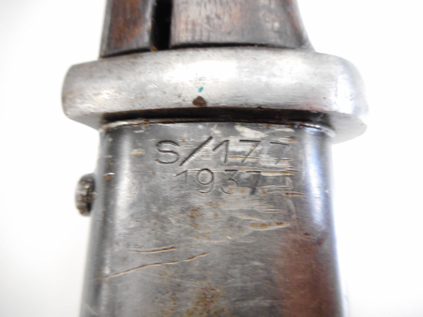GERMAN WWII K98 BAYONET WITH SCABBARD , RICASSO MARKED 7936 C & S/177 WITH SPINE MARKED 37, MULTIPLE WAFFEN MARKS ON AND AROUND POMMEL, WITH SCABBARD & MATCHING SERIAL NUMBER 7936 C REVERSE MARKED S/177 1937