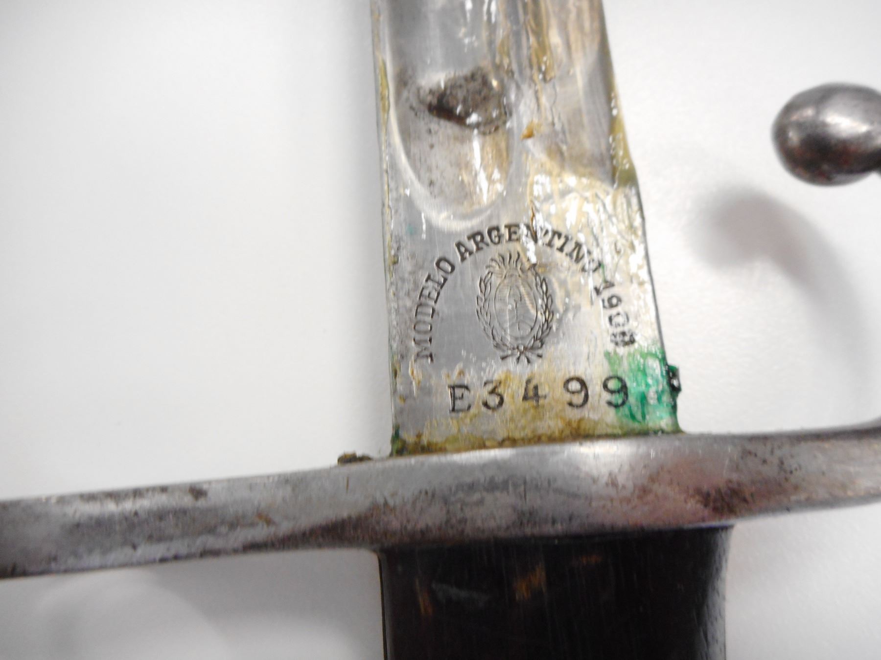 ARGENGTINE M1909 BAYONET WITH SCABBARD , RICASSO MARKED MODELO ARGENTINO 1909 E3499, & WEYERSBERG KIRSCHBAUM & CO SOLINGEN, LETTER A ON SPINE, BLADE LENGTH 400MM, HOOKED QUILLION, WITH MATCHING SCABBARD SERIAL E3499