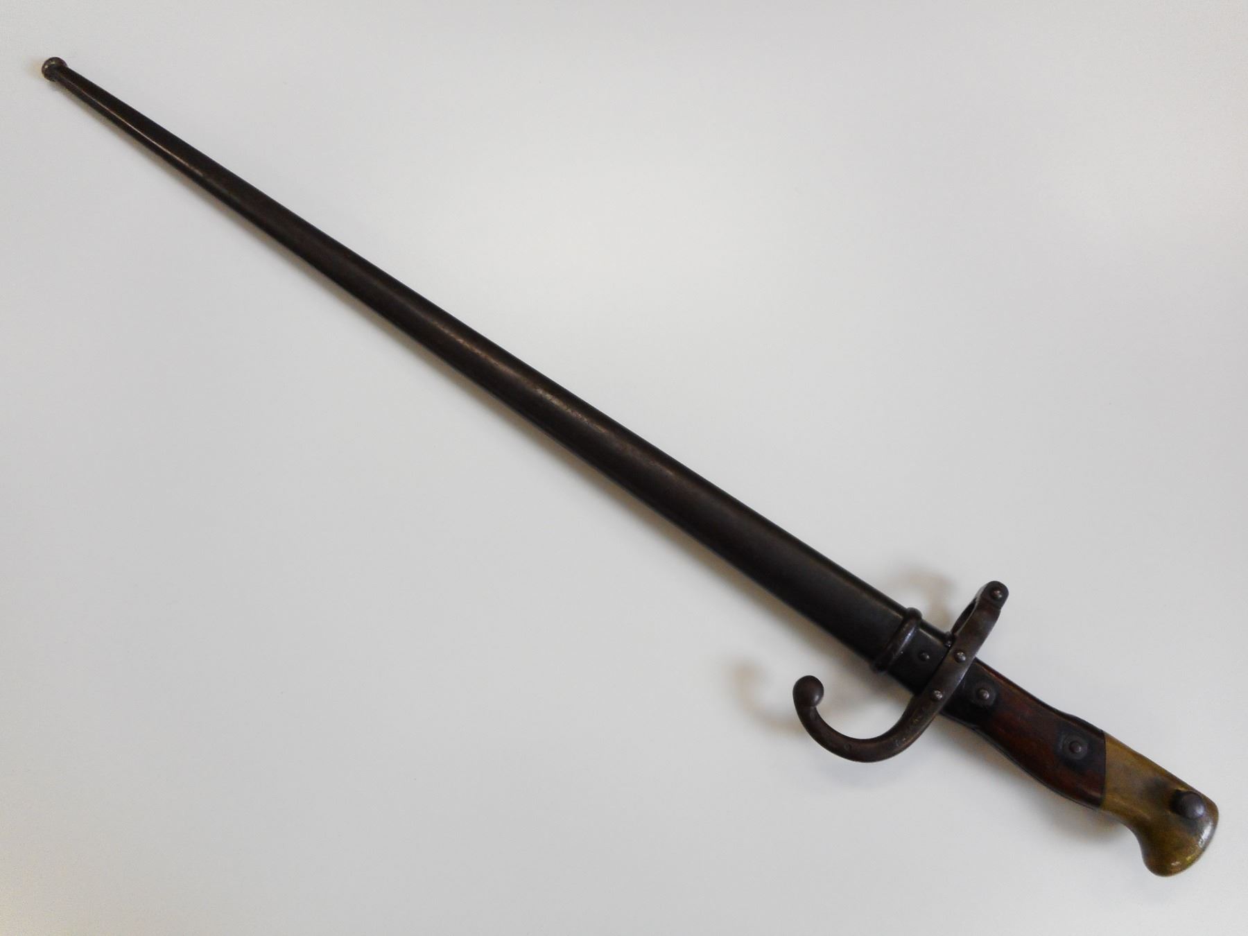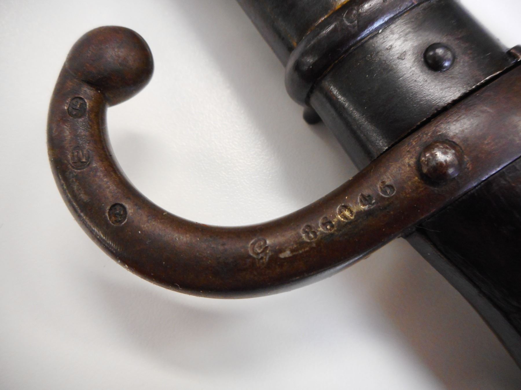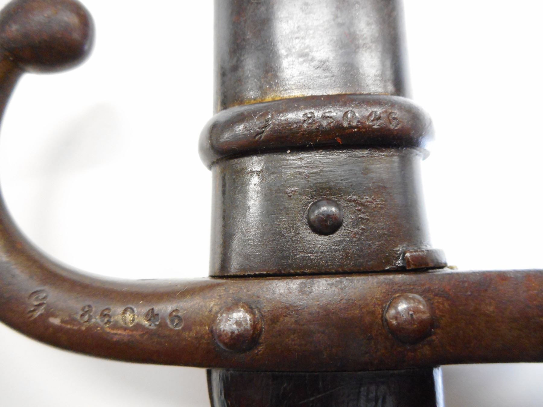 FRENCH M1874 GRAS BAYONET WITH SCABBARD , BACK EDGE MARKED MRE D'ARMES DE ST. ETIENNE MARS 1876, HOOKED QUILLION WITH ASSORTED MAKERS MARKS AND SERIAL NUMBER G 86046, MATCHING SCABBARD ALSO MARKED G 86046