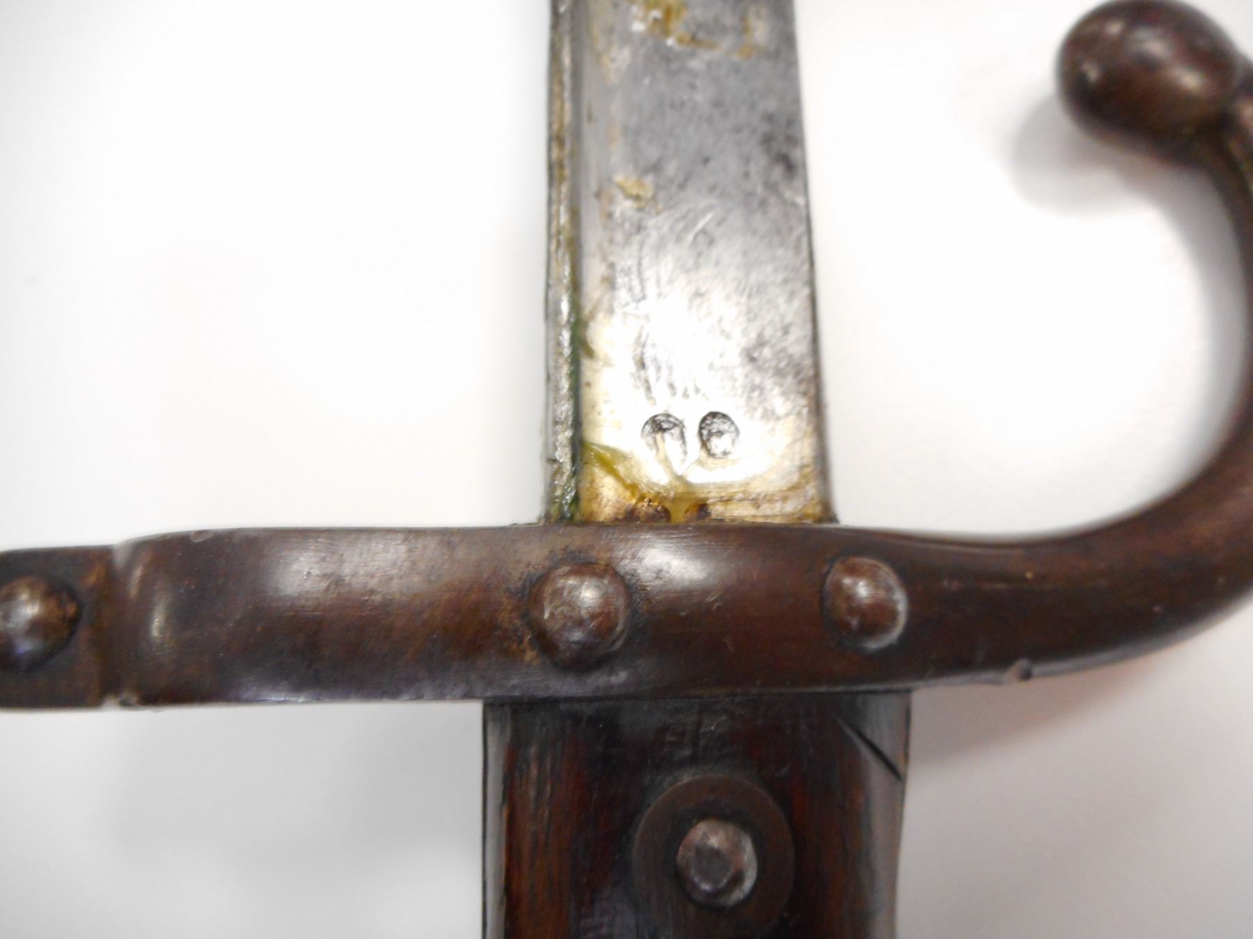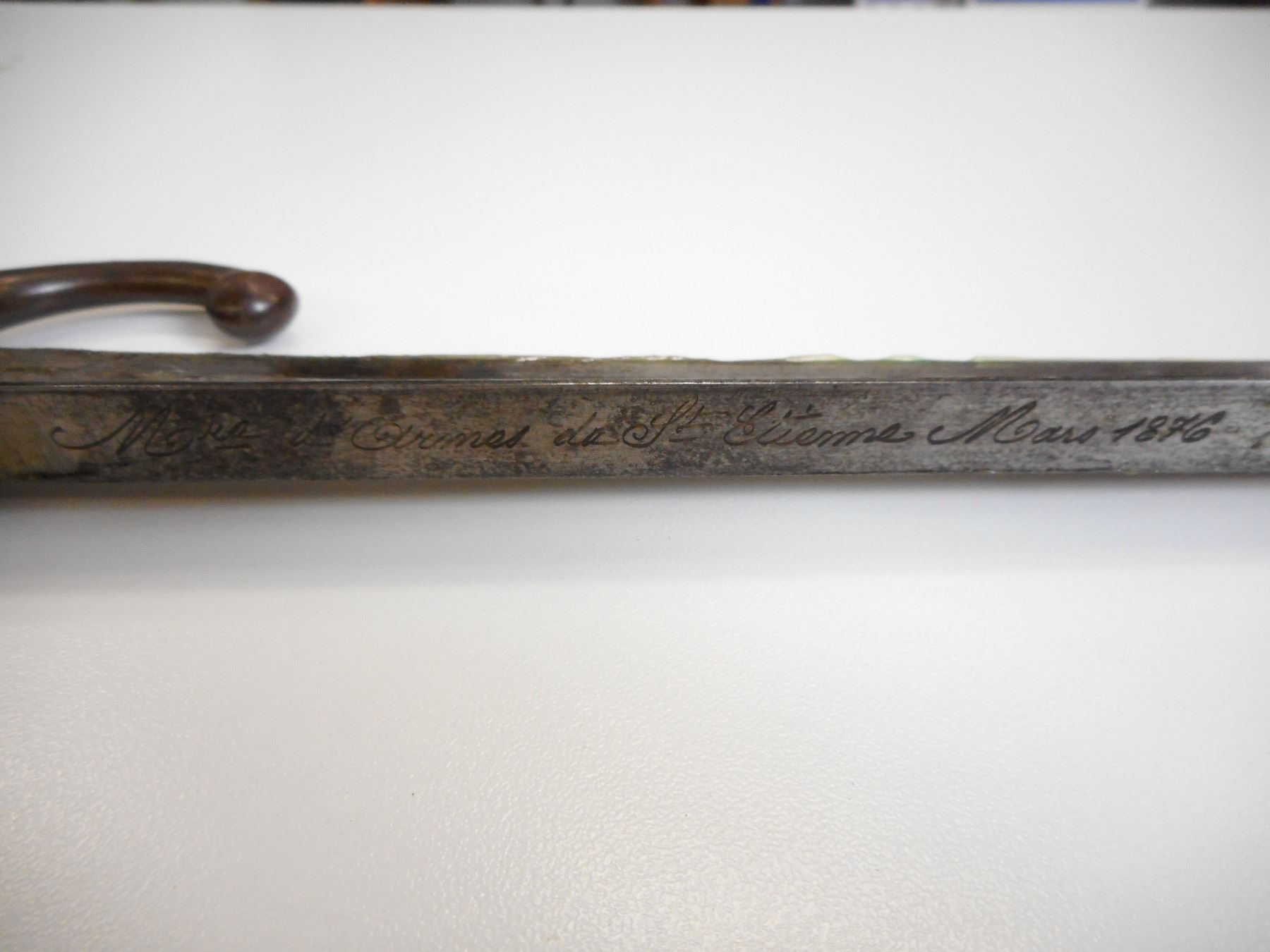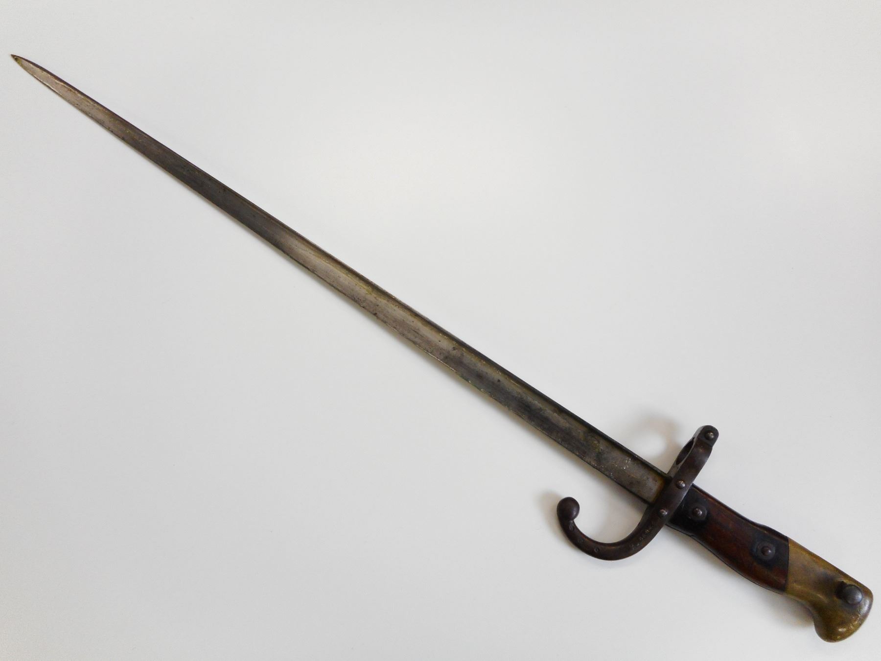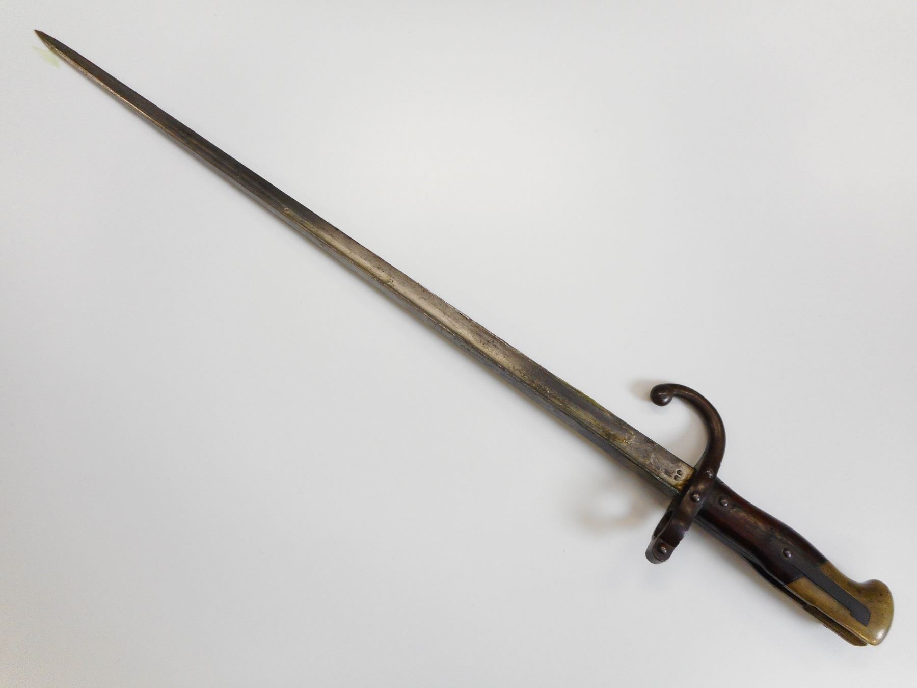 FRENCH M1874 GRAS BAYONET WITH SCABBARD , BACK EDGE MARKED MRE D'ARMES DE ST. ETIENNE MARS 1876, HOOKED QUILLION WITH ASSORTED MAKERS MARKS AND SERIAL NUMBER G 86046, MATCHING SCABBARD ALSO MARKED G 86046