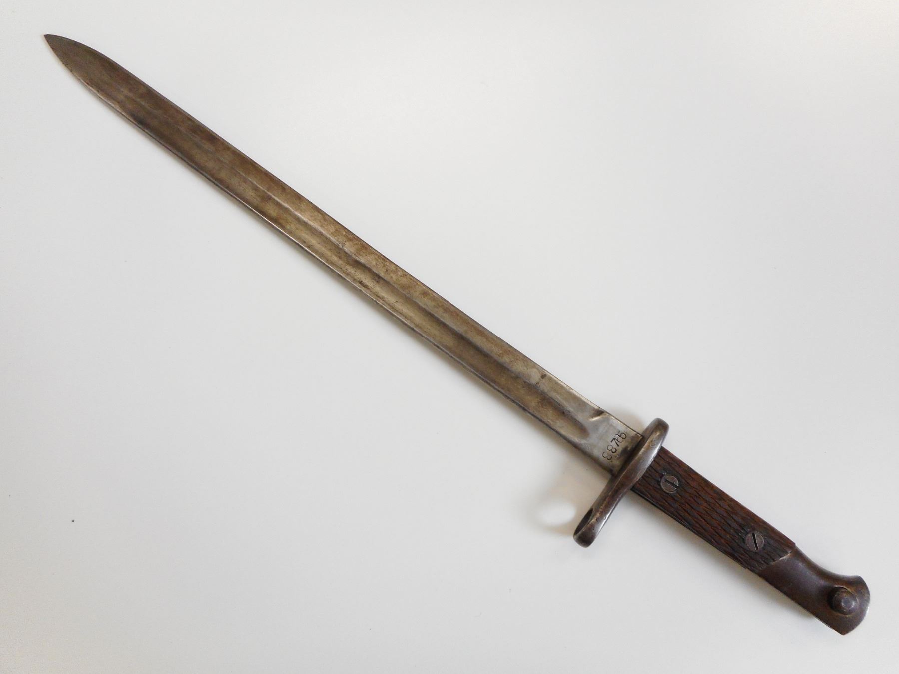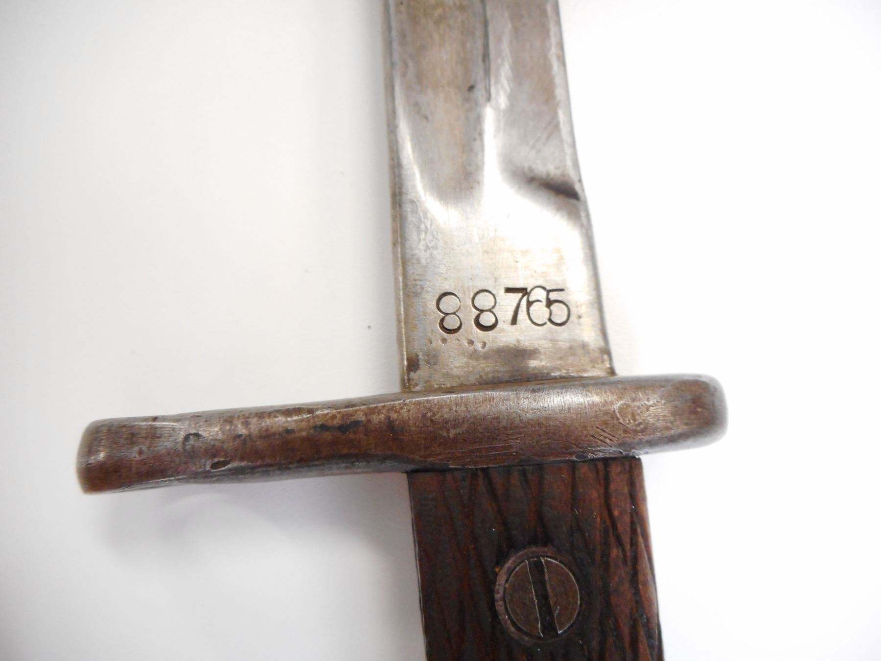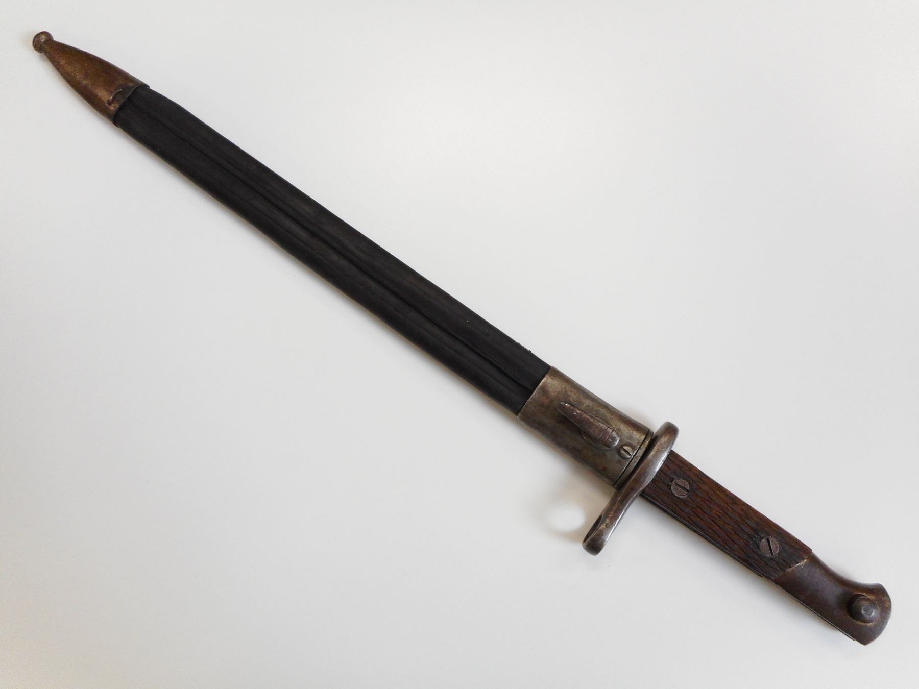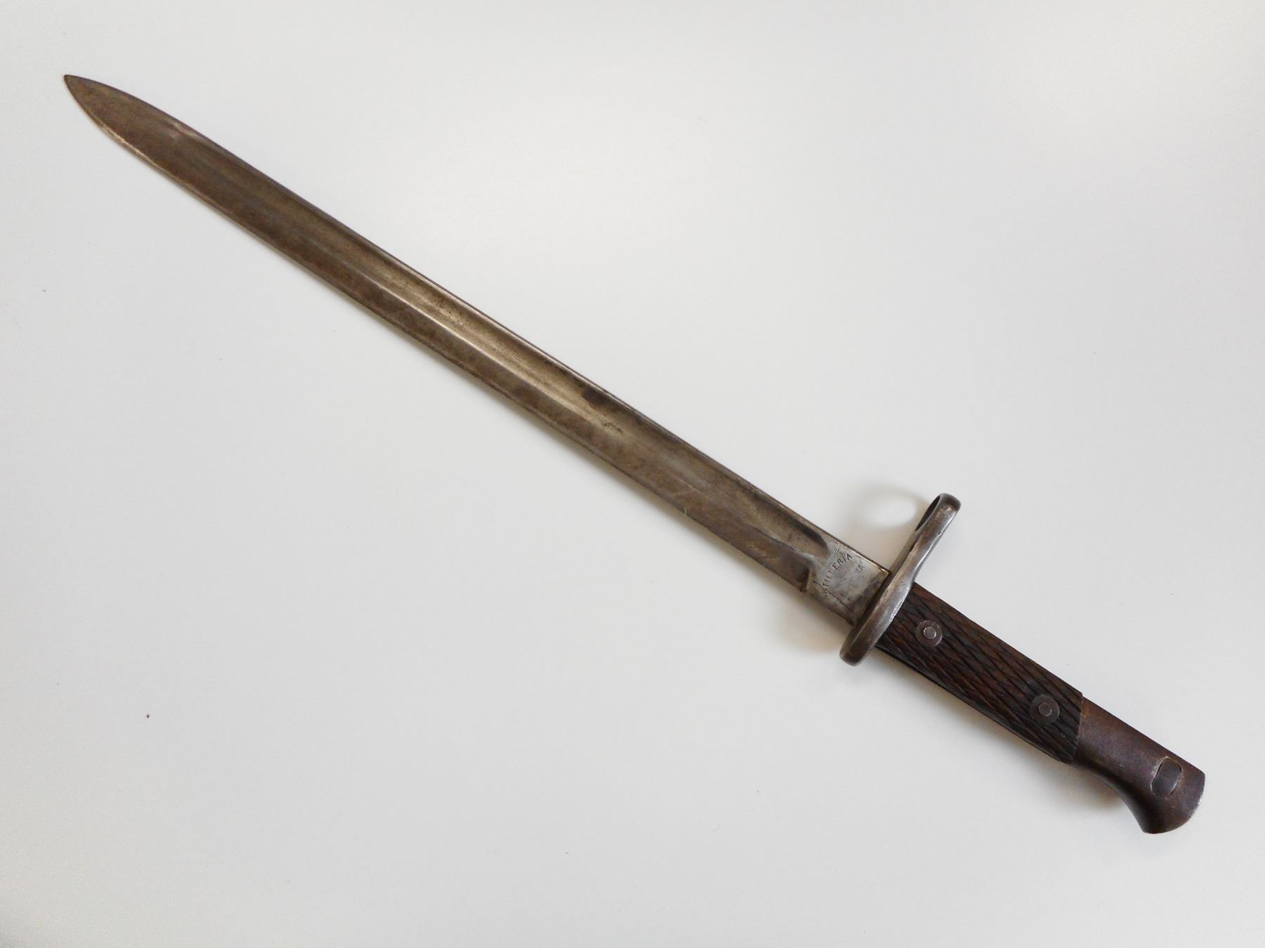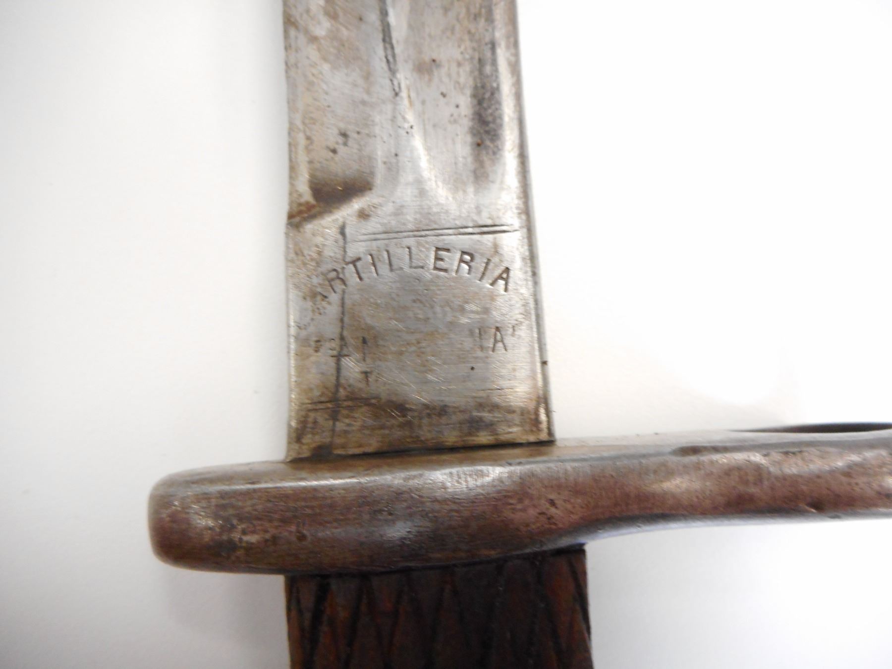 SPANISH M1914 SWORD BAYONET WITH SCABBARD , RICASSO MARKED ARTILLERIA THE REST IS VERY WORN BUT WOULD WRITE FCA NACIONAL TOLEDO, & 88765, BLADE LENGTH 395MM, CHECKERED WOODEN GRIPS, WITH LEATHER & STEEL