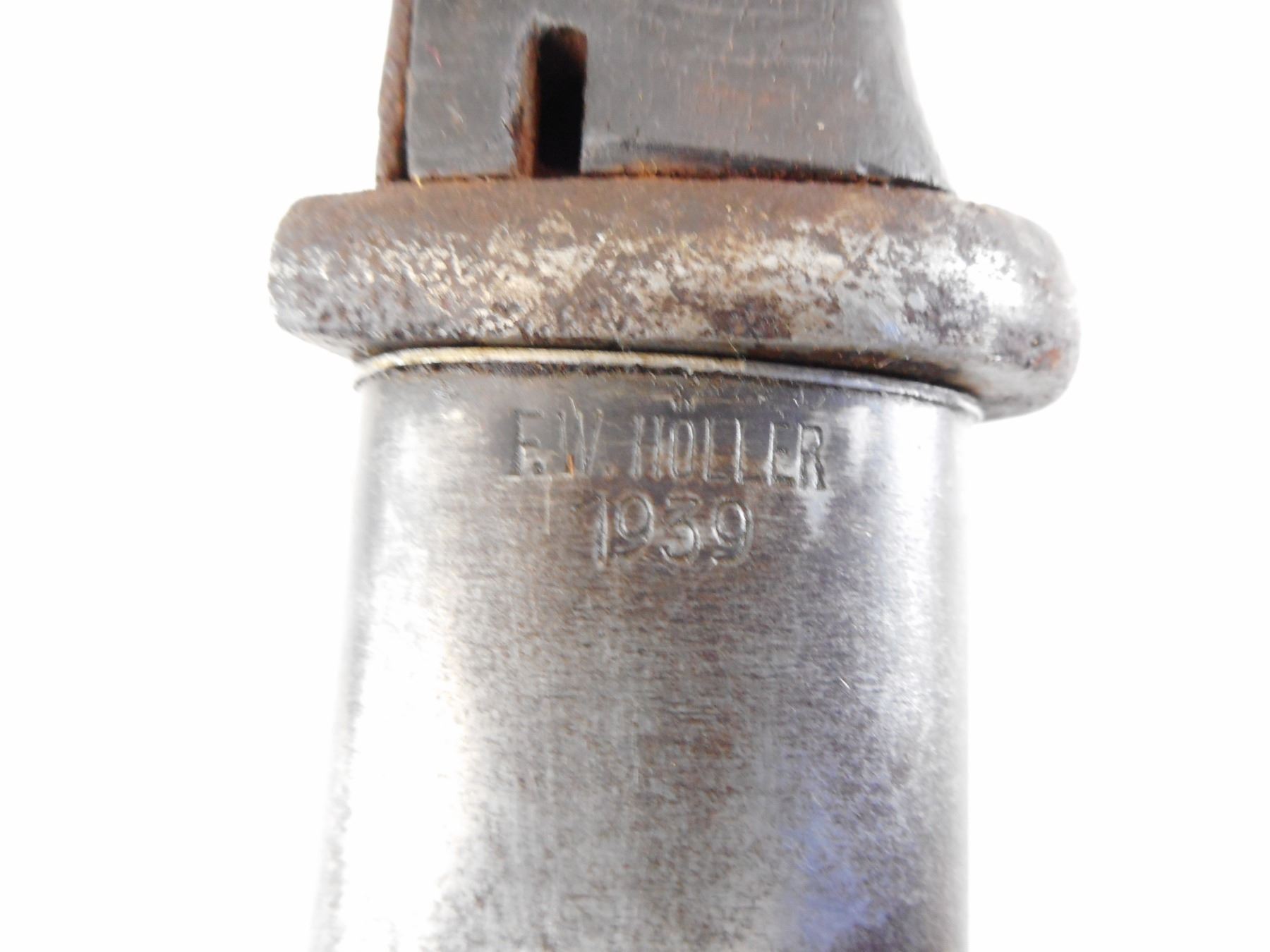 GERMAN 84/98 BAYONET WITH SCABBARD , RICASSO MARKED 88899 MM, COILED SPRING PRESS STUD ON POMMEL HAS BEEN GROUND DOWN, WITH SCABBARD SERIAL NUMBER 2326 G & MARKED F.W. HOLLER 1939