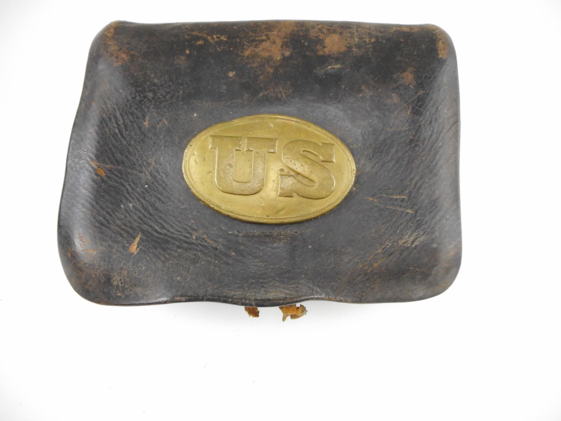 US CIVIL WAR ERA CARTRIDGE BOX , WITH BRASS US BUCKLE, INSIDE FLAP WITH CIRCULAR MAKERS MARK, INTERIOR METAL SLOTS, BOTTOM STRAP IS TORN