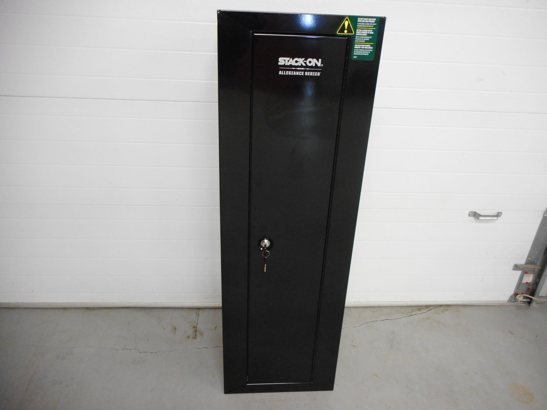 BLACK STACK ON GUN CABINET , ALLEGIENCE SERIES, DIMESIONS 53 X 17 X 13.5", COMES WITH KEYS