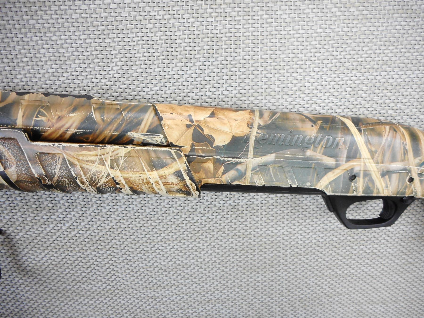 REMINGTON, MODEL: 887, CALIBER: 12GA X 3 1/2" , REALTREE CAMO SYNTHETIC STOCK, HAS AN INSTALLED REMOVABLE FULL CHOKE, BORE IS VERY GOOD, MISSING FRONT SIGHT, SOLID RIB BARREL, SLING SWIVEL LOOPS, RUBBER RECOIL PAD, SHOWS SOME HANDLING MARKS , ACTION: PUMP ACTION RIFLE , BARREL LENGTH: 28" , CONDITION: 6/10 , STOCK # 9161 , SERIAL # ARM003389 , CLASS: CANADIAN NON RESTRICTED CLASS