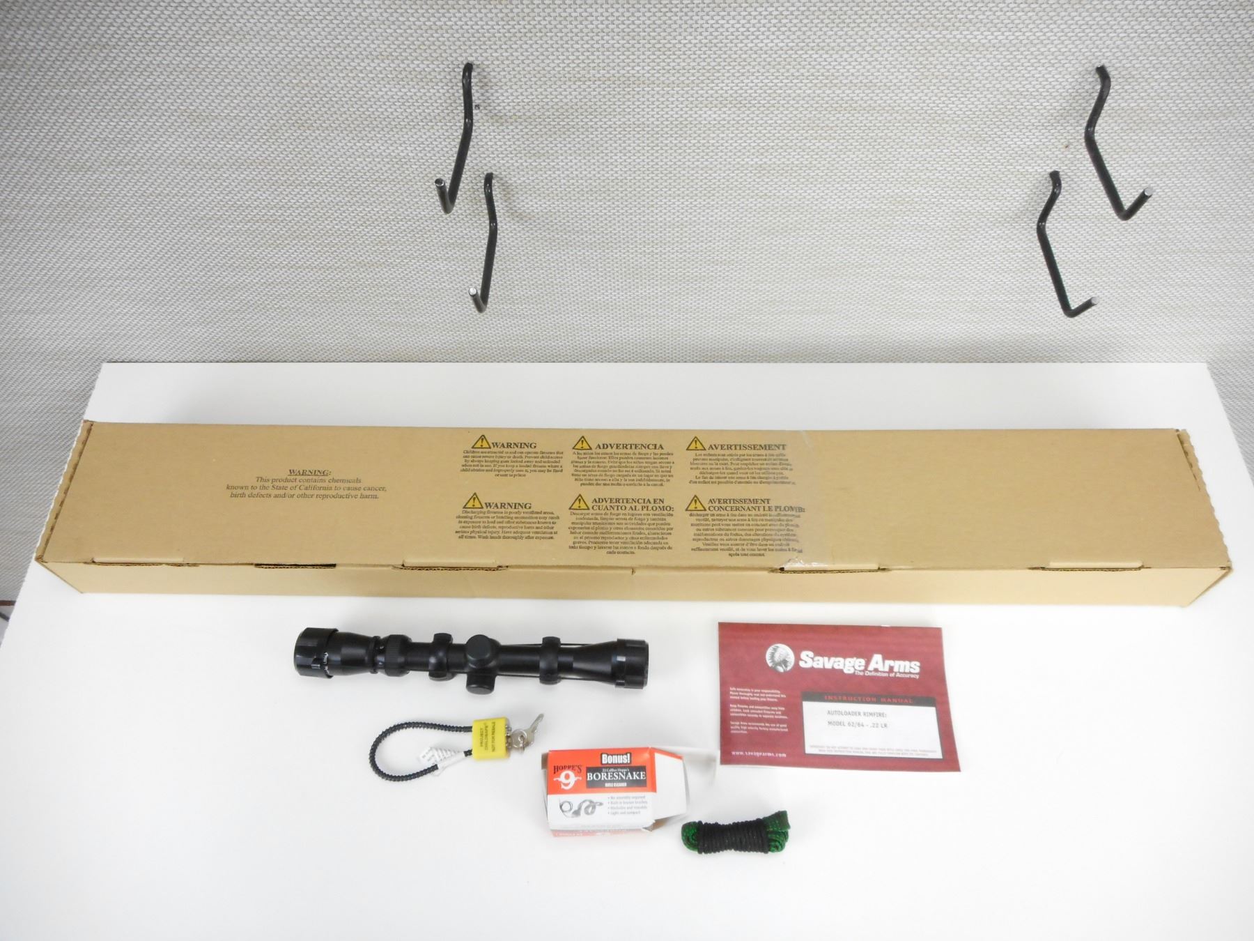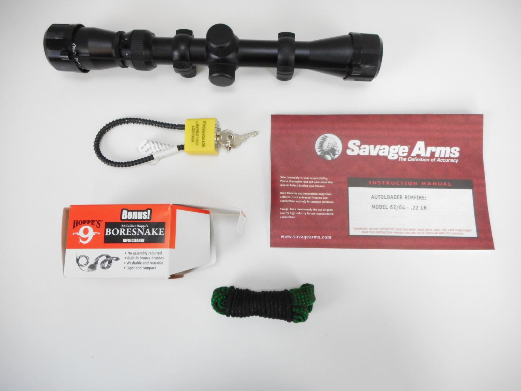 SAVAGE, MODEL: 64, CALIBER: 22 LR , COMES WITH BOX A TASCO SCOPE A MAGAZINE A BORE SNAKE, TIGGER LOCK AND A MANUAL , EXCELLENT BORE, BLADE FRONT AND ADJUSTABLE REAR SIGHTS, SYNTHETIC FULL PISTOL GRIP BUTT STOCK WITH PLASTIC BUTT PLATE, SLING SWIVEL STUDS, THE SCOPE IS NOT MOUNTED AND IS IN THE BOX , ACTION: SEMI AUTOMATIC RIFLE , BARREL LENGTH: 21" , CONDITION: 9+/10 , STOCK # 9175 , SERIAL # 2679436 , CLASS: CANADIAN NON RESTRICTED CLASS