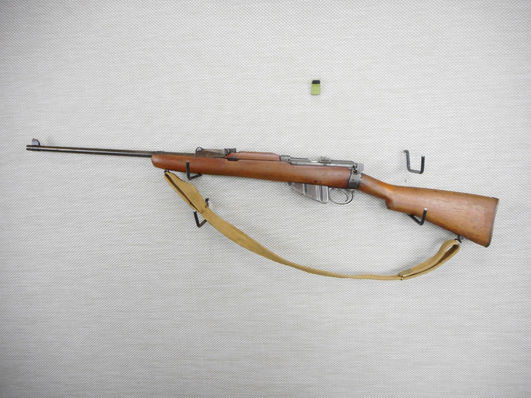 WWII ERA, LEE ENFIELD, MODEL: MKIII*, CALIBER: 303 BR , COMES WITH MAGAZINE DATED 1941, MADE IN AUSTRALIA, BOLT AND RECEIVER MATCH BY SERIAL#, MISSING THE SAFETY, GOOD BORE WITH MINOR WEAR AT COMMENCEMENT OF RIFLING, ORIGINAL MILITARY CANVAS SLING, SPORTERIZED STOCK, SHOWS SOME HANDLING MARKS , ACTION: BOLT ACTION RIFLE , BARREL LENGTH: 25" , CONDITION: 5/10 , STOCK # 9185 , SERIAL # 72403 , CLASS: CANADIAN NON RESTRICTED CLASS