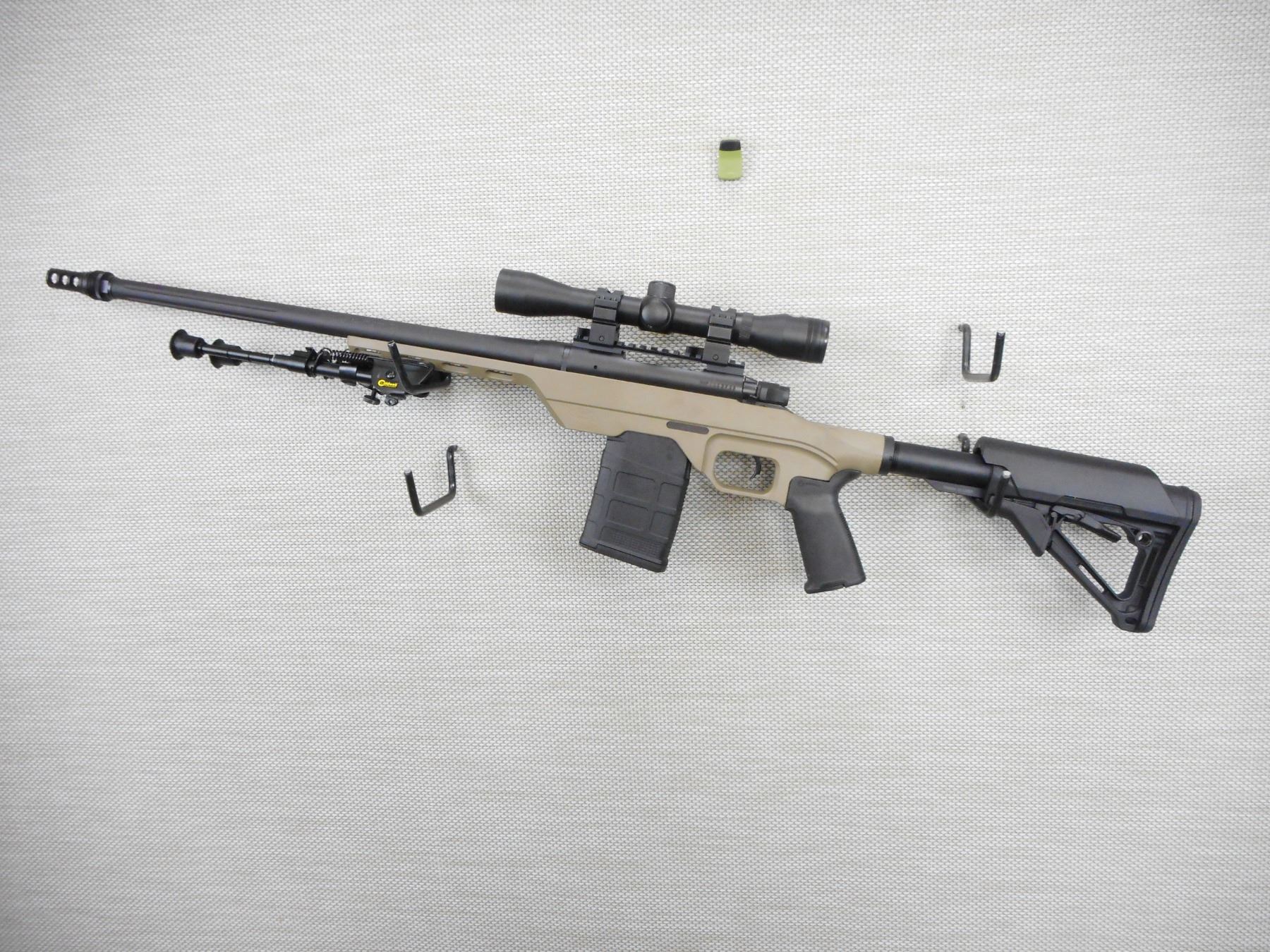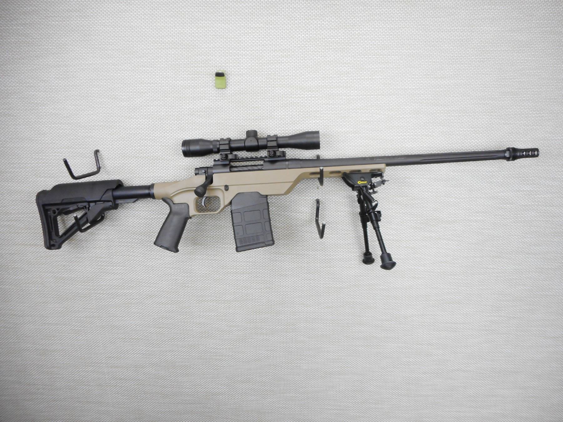 MOSSBERG & SONS, MODEL: MVP SERIES, CALIBER: 7.62 NATO CAL. , COMES WITH MAGAZINE, HAS A SCOPE, EXCELLENT BORE, MUZZLE BREAK, FLUTED BARREL, RUGER 4 POWER SCOPE, BI-POD, MVPLC CHASSIS, FULL PISTOL GRIP, AND COLLAPSIBLE BUTT STOCK, SHOWS VERY LITTLE HANDLING MARKS , ACTION: BOLT ACTION , BARREL LENGTH: 19" , CONDITION: 8/10 , STOCK # 9230 , SERIAL # 13735 , CLASS: CANADIAN NON RESTRICTED CLASS