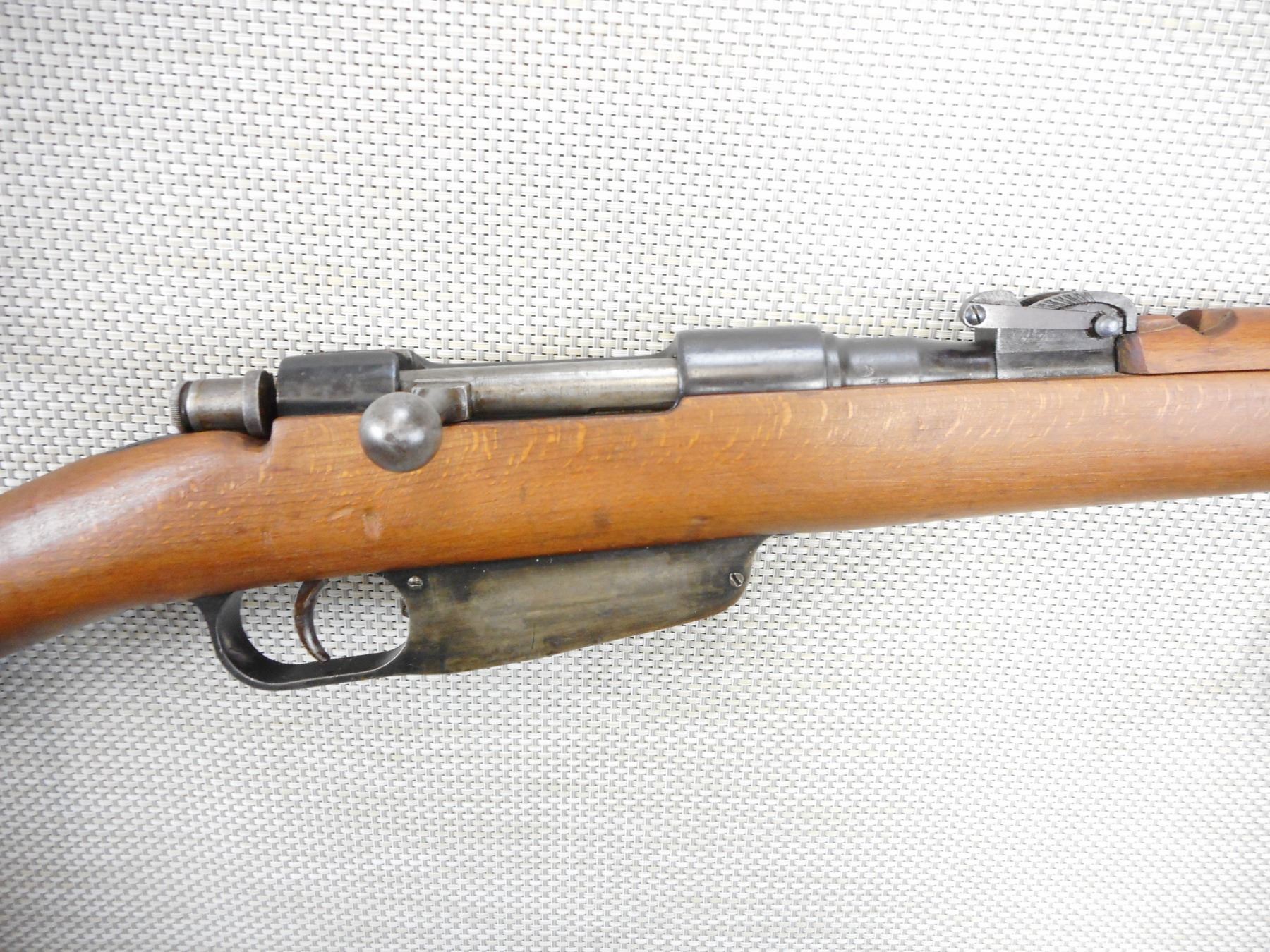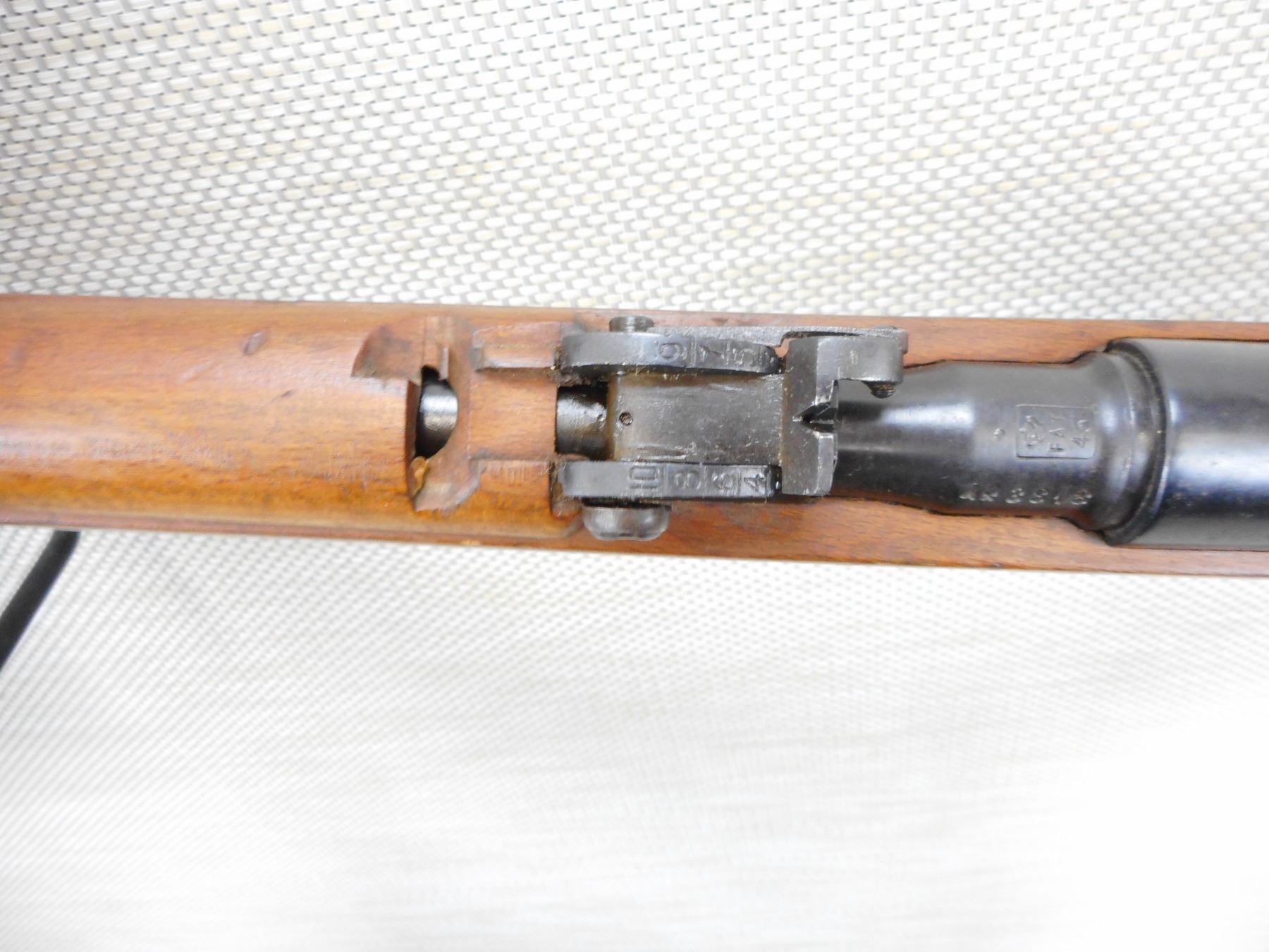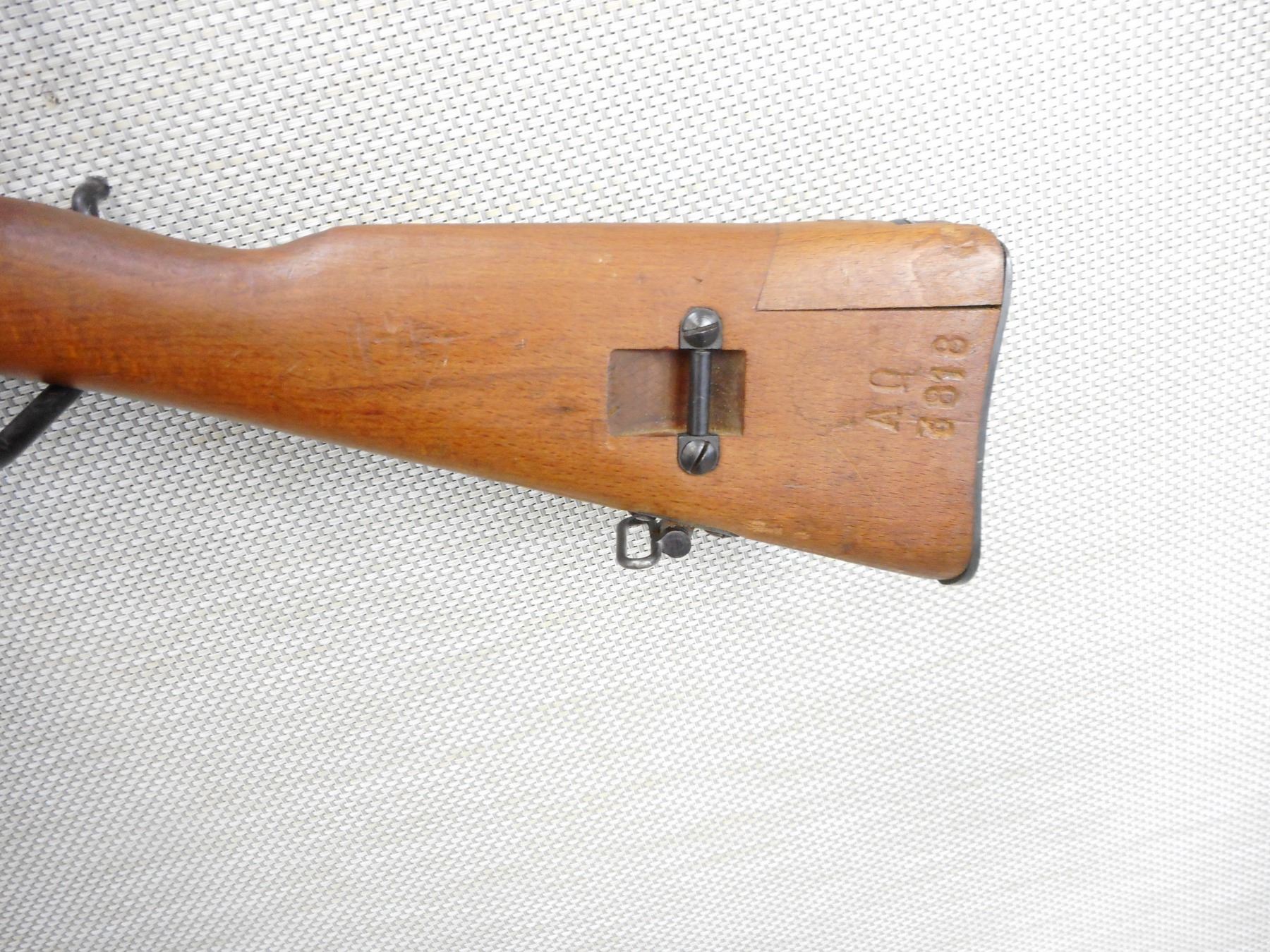 WWII ERA, CARCACNO, MODEL: M1891, CALIBER: 6.5 X 52R , BORE IS VERY GOOD, BLADE FRONT AND ADJUSTABLE REAR SIGHT, RETAINS FULL MILITARY CONFIGURATION, BUTT STOCK REPAIRED AT THE HEAL, STOCK AND RECEIVER MATCH BY SERIAL #, SHOWS SOME HANDLING MARKS , ACTION: BOLT ACTION RIFLE , BARREL LENGTH: 28" , CONDITION: 7/10 , STOCK # 9249 , SERIAL # A83818 , CLASS: CANADIAN NON RESTRICTED CLASS