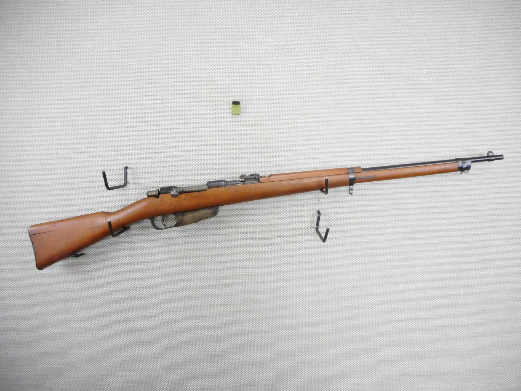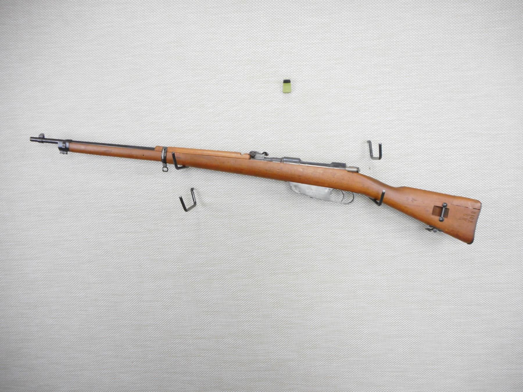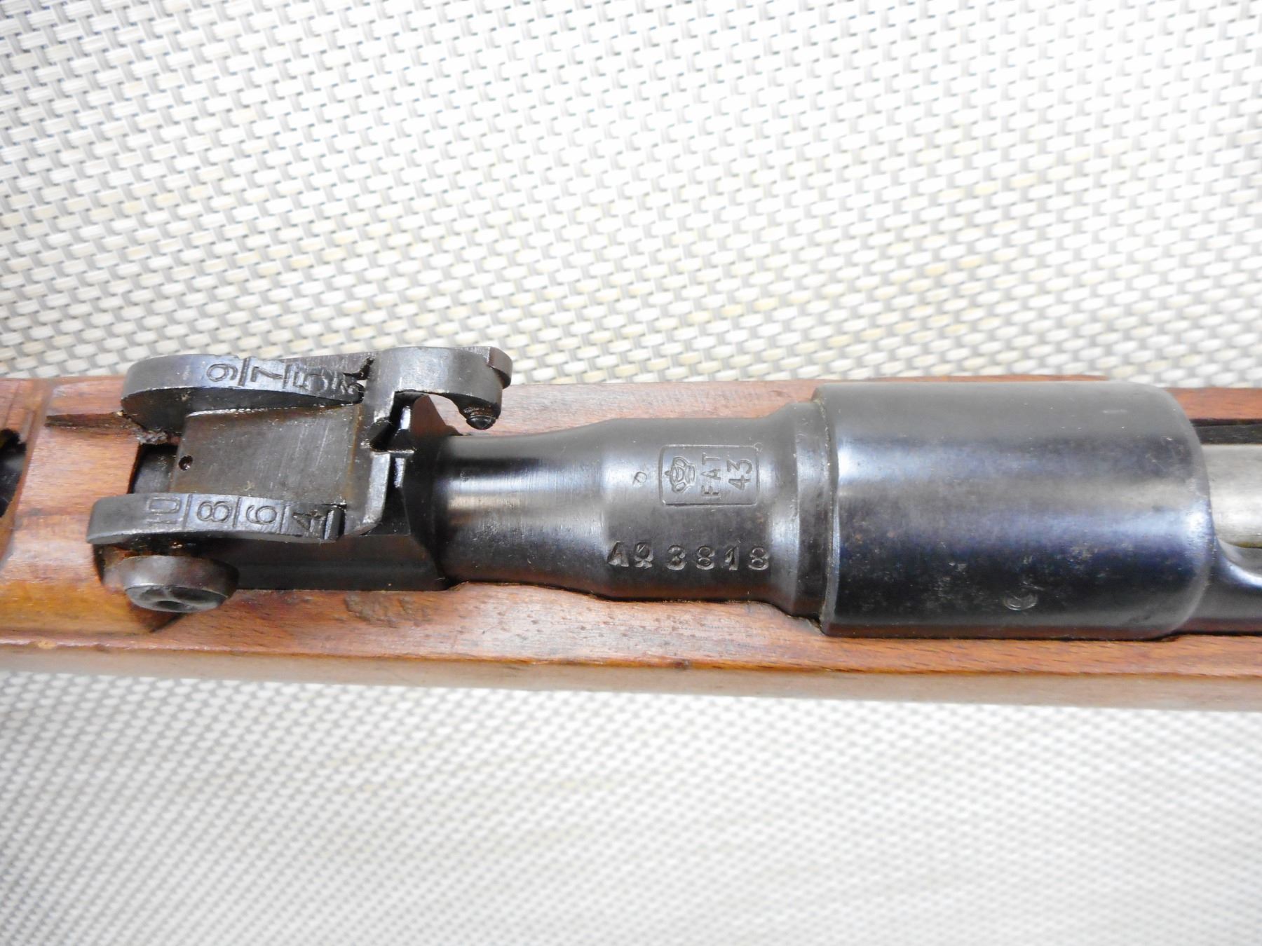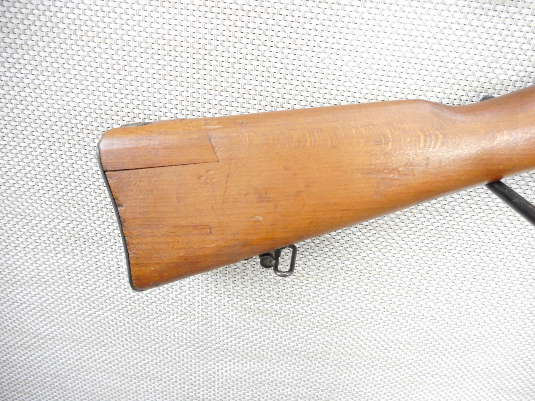 WWII ERA, CARCACNO, MODEL: M1891, CALIBER: 6.5 X 52R , BORE IS VERY GOOD, BLADE FRONT AND ADJUSTABLE REAR SIGHT, RETAINS FULL MILITARY CONFIGURATION, BUTT STOCK REPAIRED AT THE HEAL, STOCK AND RECEIVER MATCH BY SERIAL #, SHOWS SOME HANDLING MARKS , ACTION: BOLT ACTION RIFLE , BARREL LENGTH: 28" , CONDITION: 7/10 , STOCK # 9249 , SERIAL # A83818 , CLASS: CANADIAN NON RESTRICTED CLASS