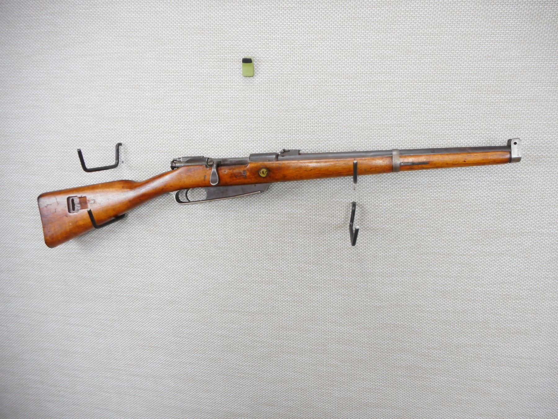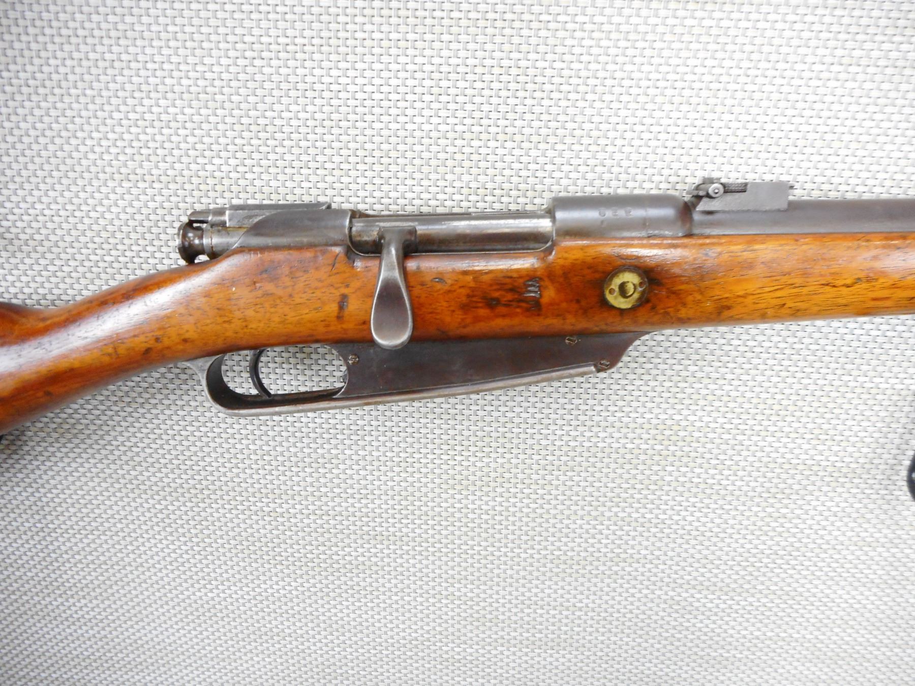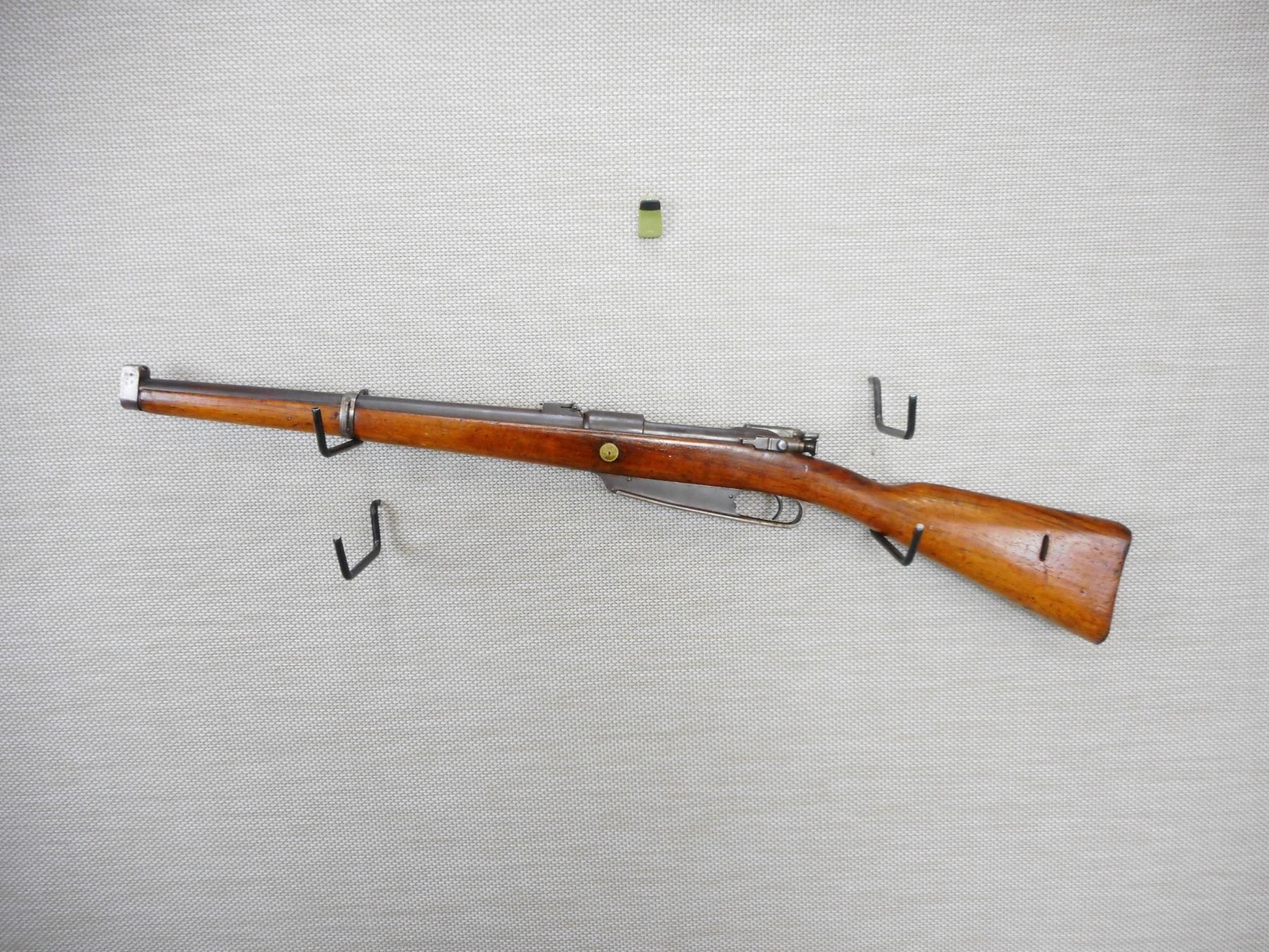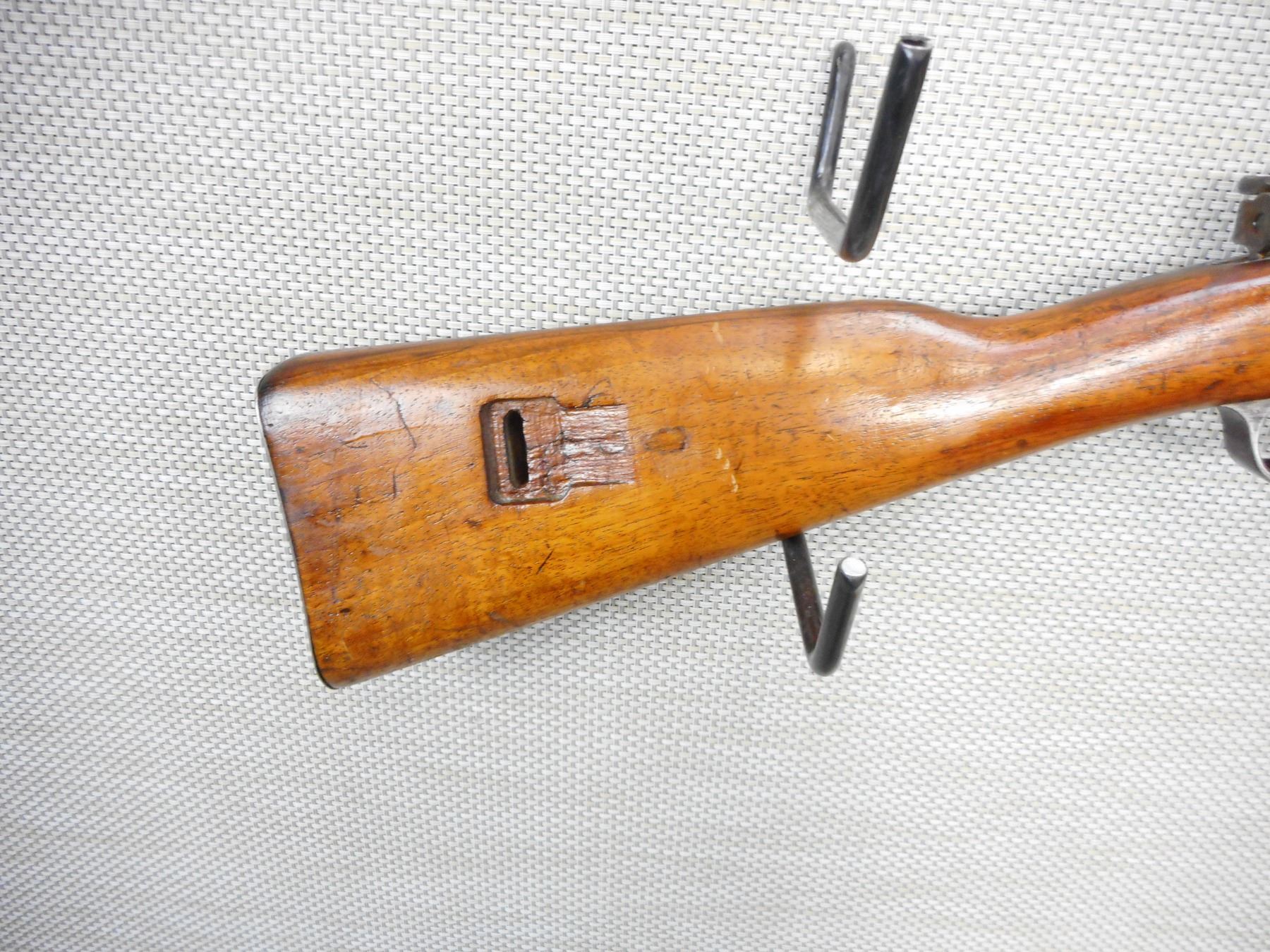 RARE, COMMISSION CARBINE , MODEL: KAR 88 CARBINE, CALIBER: "S" FOR .323" DIA , STRIPPER CLIP FED ( DOES NOT COME WITH THE STRIPPER CLIP) MADE IN GERMANY ERFURT 18590, MATCHING PARTS BY SERIAL # BORE IS GOOD, TAPPED HOLE IN THE BUTT PLATE, RETAINS FULL MILITARY CONFIGURATION, BARLEY CORN FRONT AND ADJUSTBLE REAR SIGHTS, TURN DOWN BOLT HANDLE, SLING SWIVEL LOOPS, SHOWS SOME HANDLING MARKS , ACTION: BOLT ACTION RIFLE , BARREL LENGTH: 18" , CONDITION: 6/10 , STOCK # 9261 , SERIAL # 6121 , CLASS: CANADIAN NON RESTRICTED CLASS