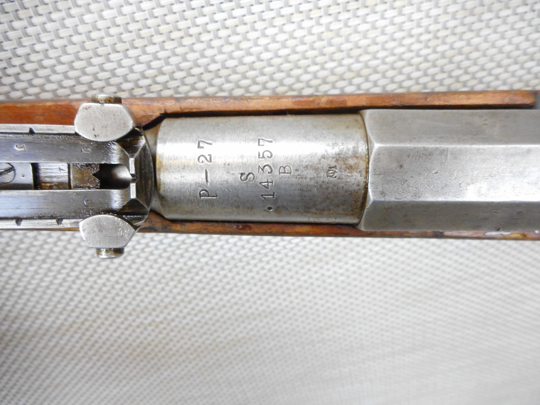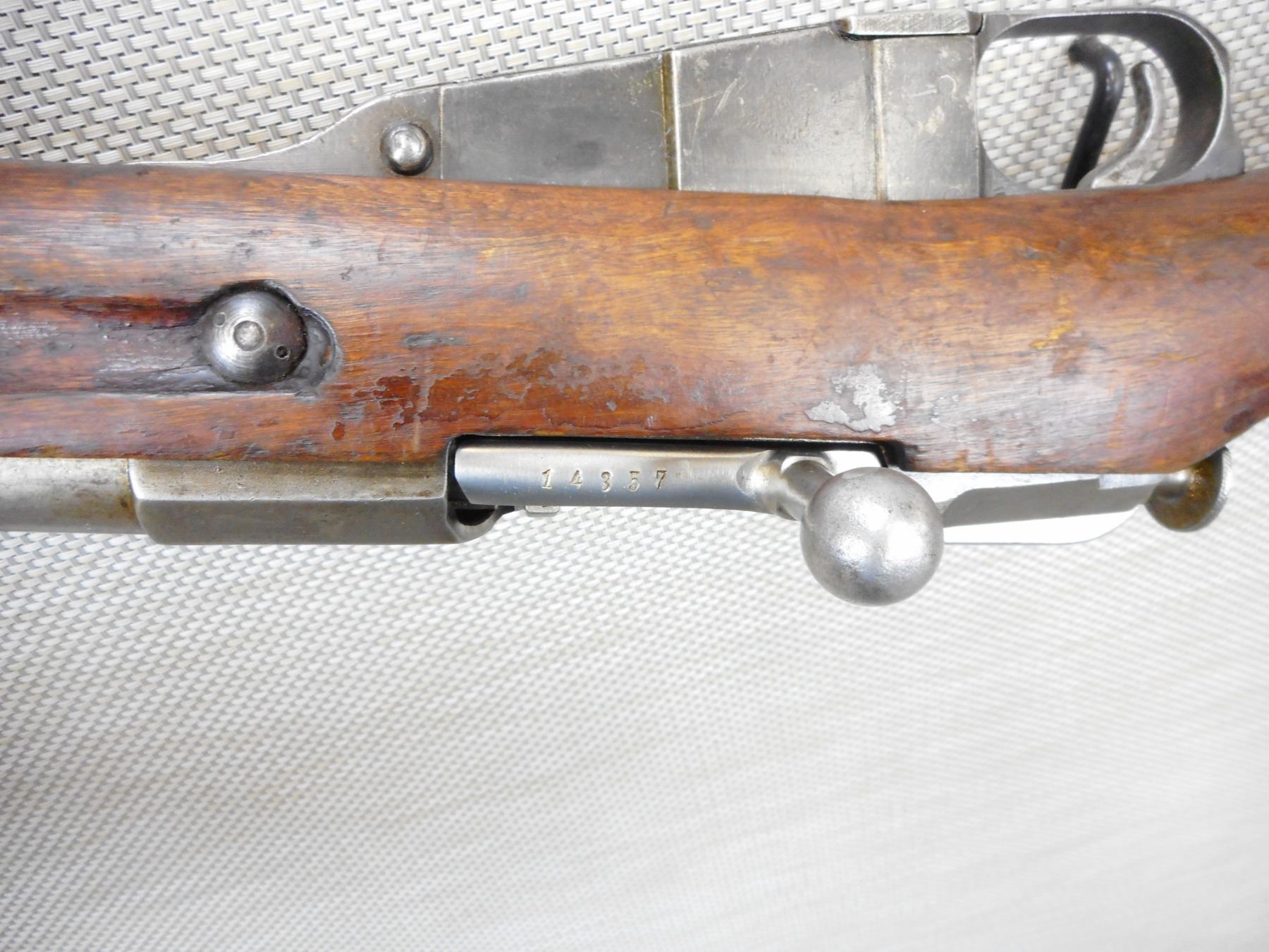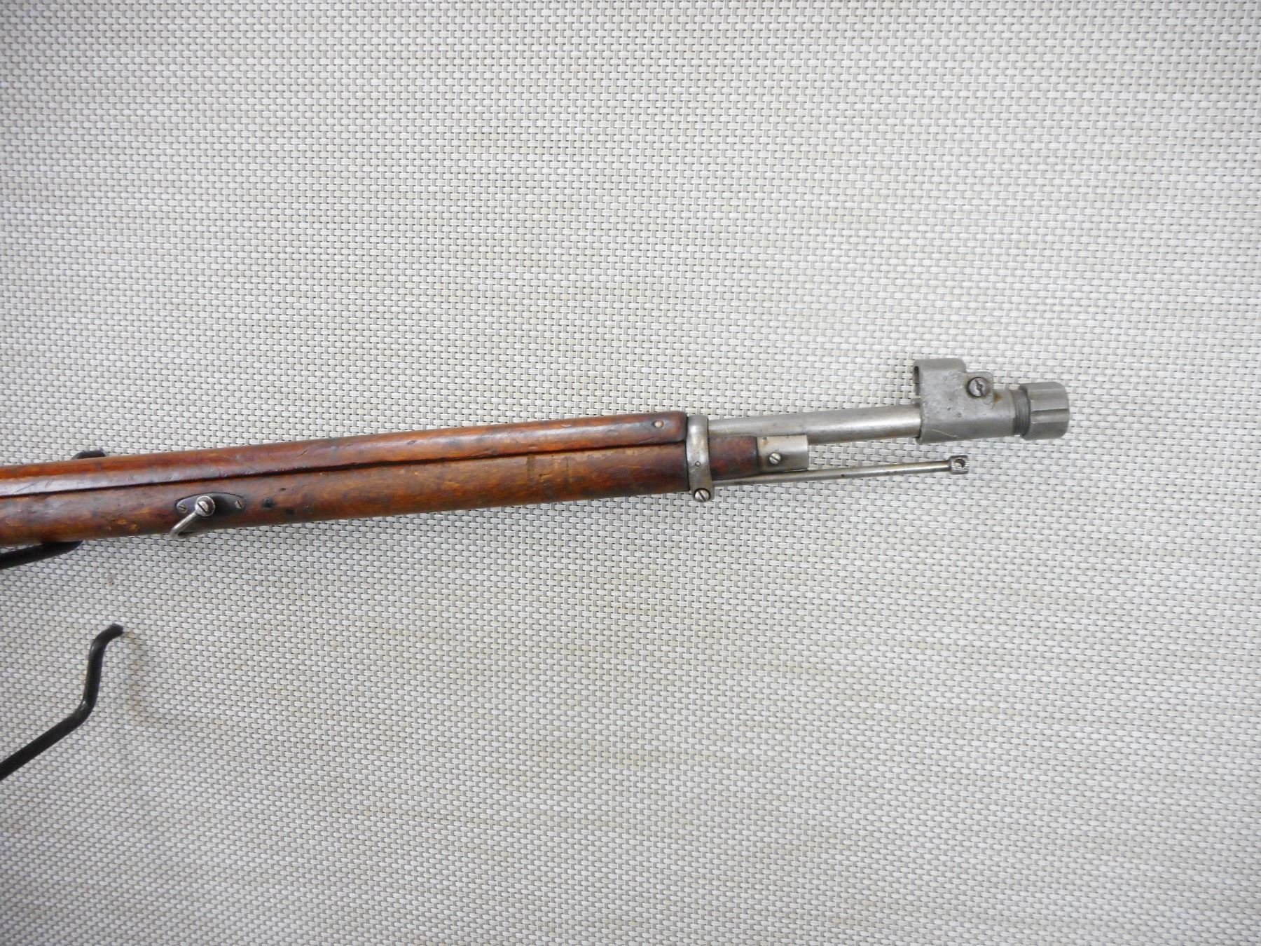 MOSIN NAGANT, MODEL: 1891 FINNISH , CALIBER: 7.62 X 54R , COMES WITH HOME MADE REMOVABLE MUZZLE CAP, THIS IS VERY FRAGILE AND MADE OF CAST ZINC, GOOD BORE WITH ONE SMALLER AREA OF PITTING, BOLT AND RECEIVER MATCH BY SERIAL #, FINNISH STATE ARSENAL, BLADE FRONT AND ADJUSTABLE REAR SIGHTS, RETAINS FULL MILITARY CONFIGURATION, MATCHING BOLT AND RECEIVER BY SERIAL #, SLING SWIVEL LOOPS, STEEL BUTT PLATE, FOREND CAP WOOD IS CRACKED, SHOWS EXTENSIVE HANDLING MARKS , ACTION: BOLT ACTION RIFLE , BARREL LENGTH: 32" , CONDITION: 5/10 , STOCK # 9271 , SERIAL # 14357 , CLASS: CANADIAN NON RESTRICTED CLASS