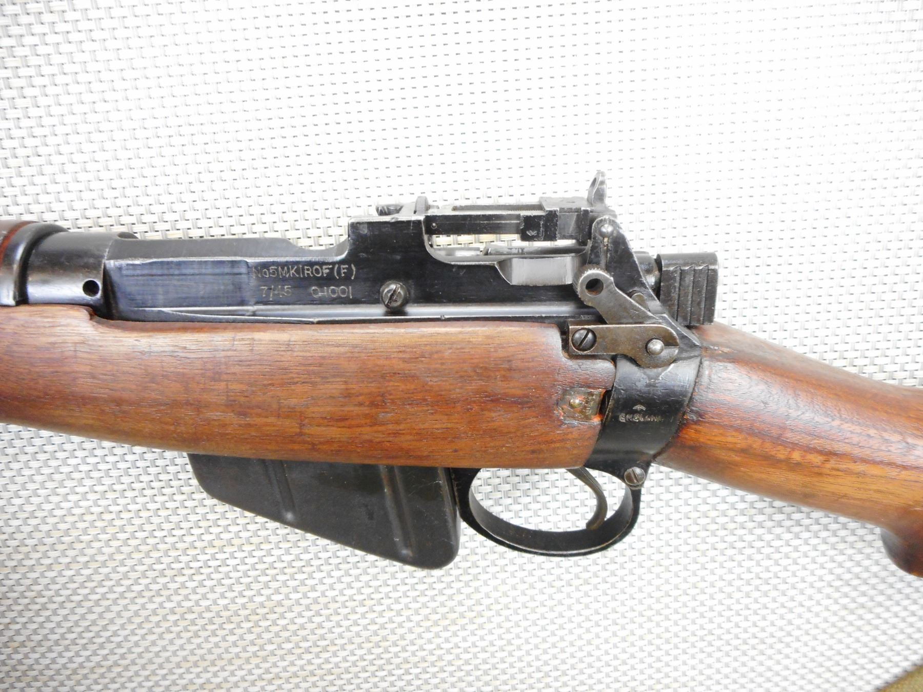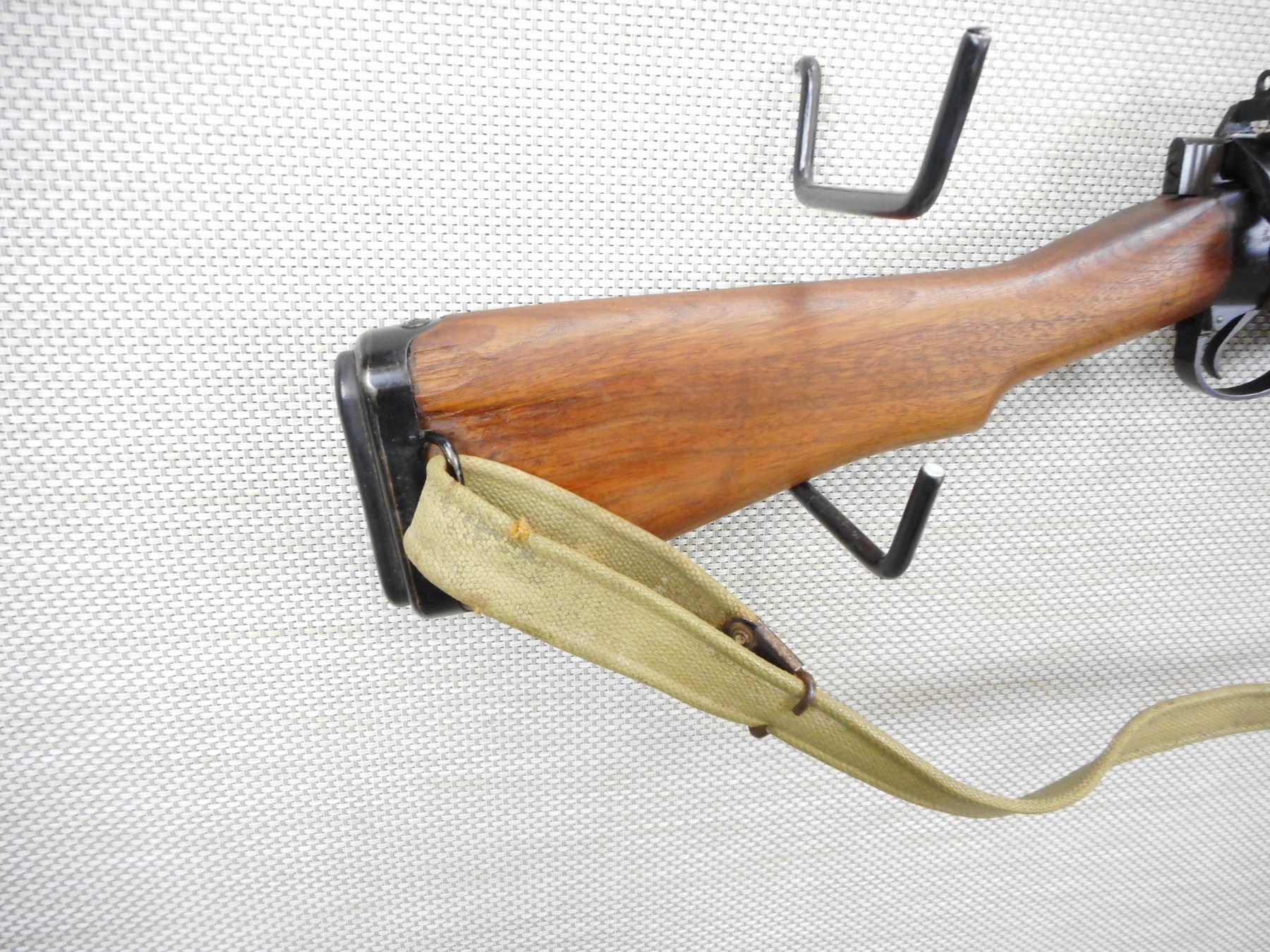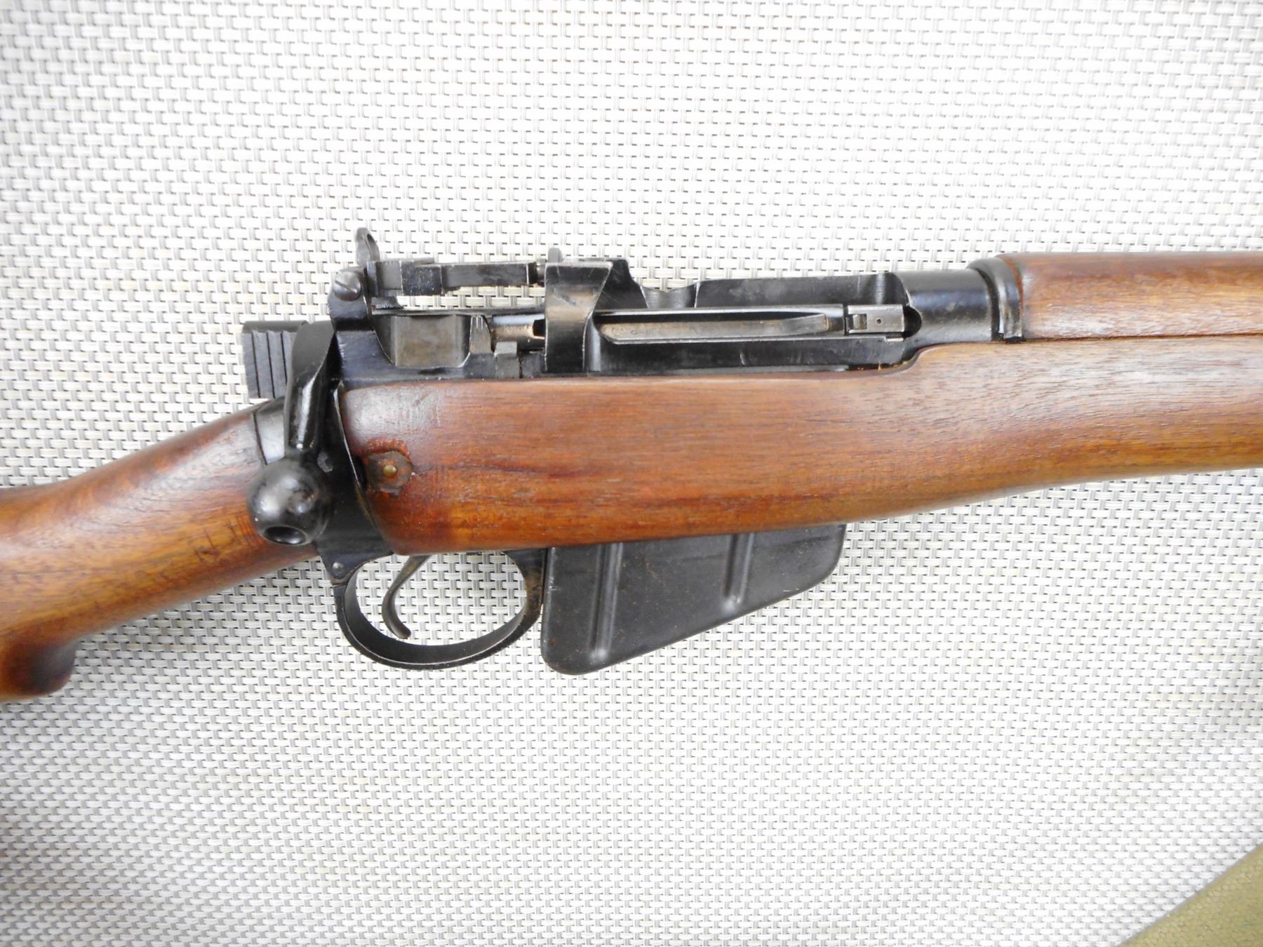 WWII ERA, LEE ENFIELD , MODEL: NO 5 MKI JUNGLE CARBINE , CALIBER: 303 BR , COMES WITH BAYONET, SCABBARD, AND MAGAZINE ,THE BAYONET DOES NOT HAVE A NUMBER ON IT, DATED 1945, MATCHING BOLT AND RECEIVER BY SERIAL #, EXCELLENT BORE, BARLEY CORN FRONT AND PEEP REAR SIGHTS, FLASH HIDER, SLING SWIVEL LOOPS WITH ORIGINAL CANVAS SLING, STEEL AND RUBBER BUTT PLATE, SHOWS VERY LITTLE HANDLING MARKS , ACTION: BOLT ACTION RIFLE , BARREL LENGTH: 19" , CONDITION: 7/10 , STOCK # 9288 , SERIAL # 01001 , CLASS: CANADIAN NON RESTRICTED CLASS