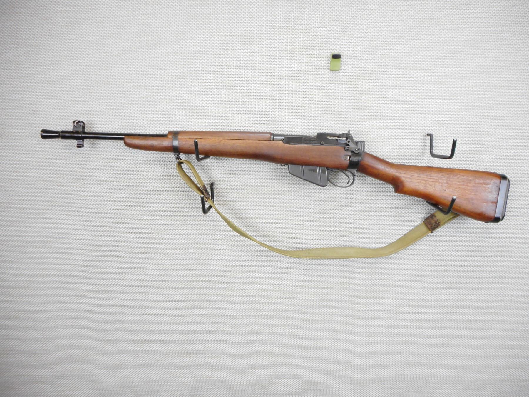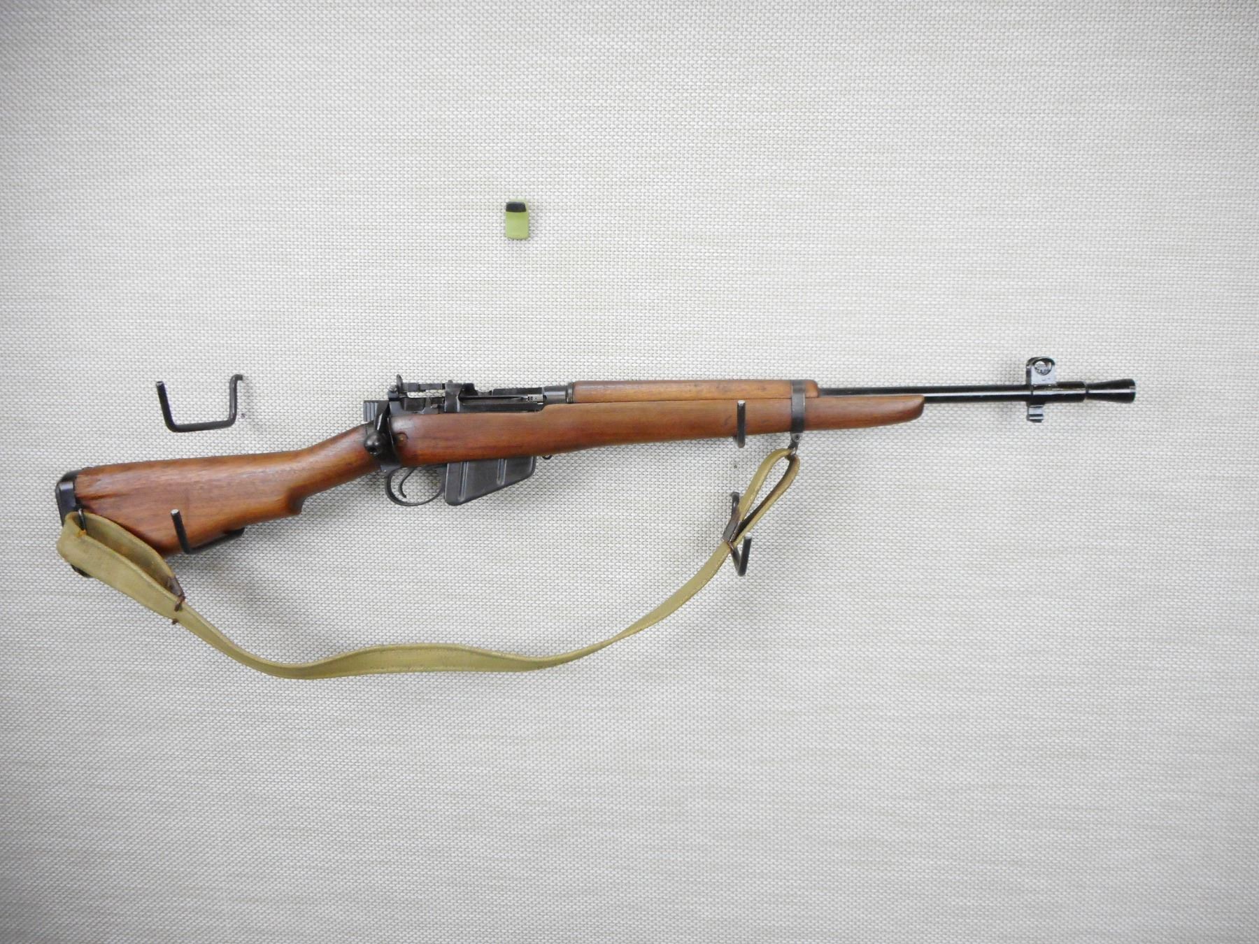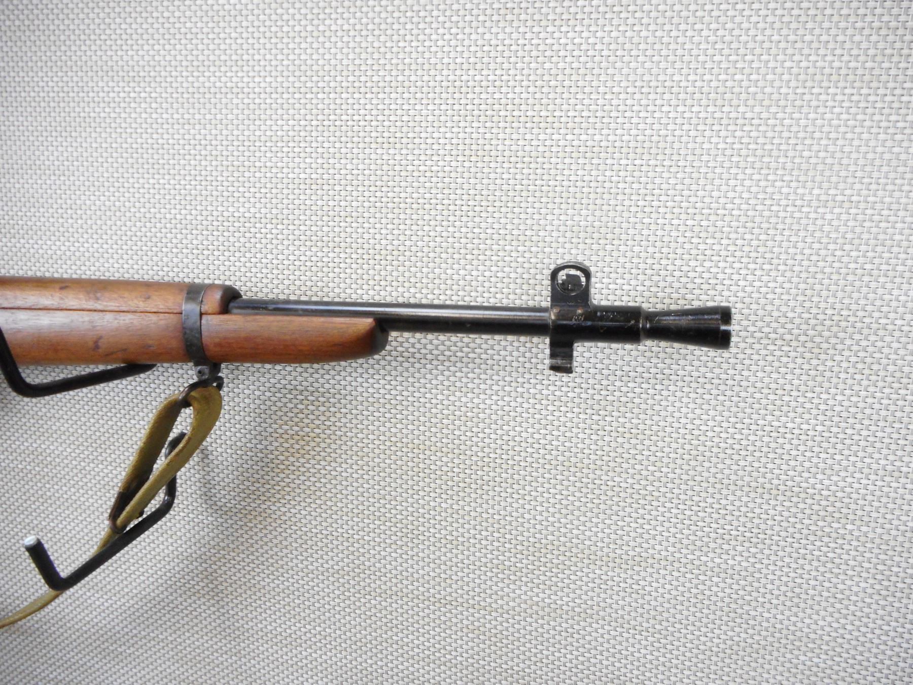 WWII ERA, LEE ENFIELD , MODEL: NO 5 MKI JUNGLE CARBINE , CALIBER: 303 BR , COMES WITH BAYONET, SCABBARD, AND MAGAZINE ,THE BAYONET DOES NOT HAVE A NUMBER ON IT, DATED 1945, MATCHING BOLT AND RECEIVER BY SERIAL #, EXCELLENT BORE, BARLEY CORN FRONT AND PEEP REAR SIGHTS, FLASH HIDER, SLING SWIVEL LOOPS WITH ORIGINAL CANVAS SLING, STEEL AND RUBBER BUTT PLATE, SHOWS VERY LITTLE HANDLING MARKS , ACTION: BOLT ACTION RIFLE , BARREL LENGTH: 19" , CONDITION: 7/10 , STOCK # 9288 , SERIAL # 01001 , CLASS: CANADIAN NON RESTRICTED CLASS