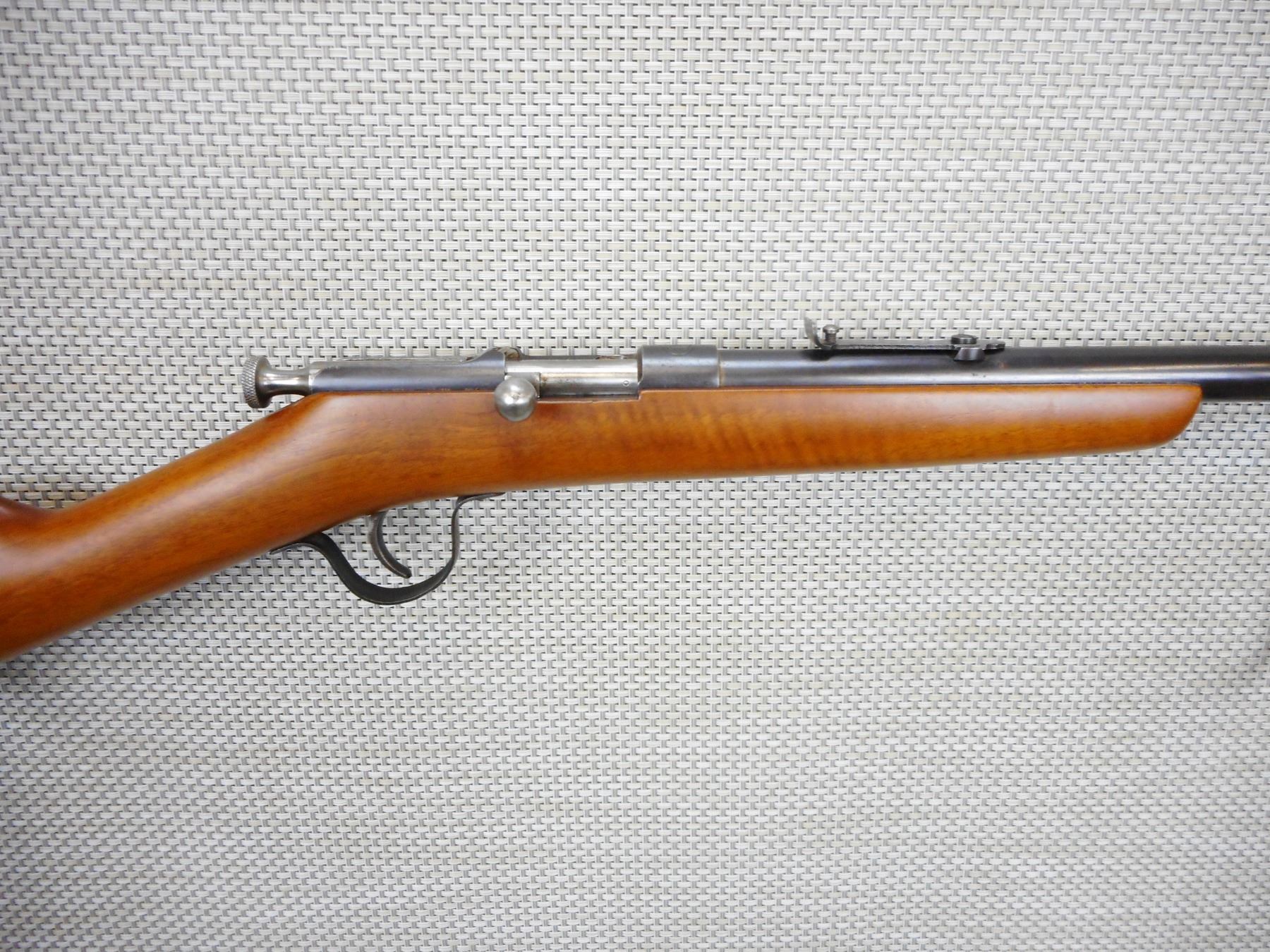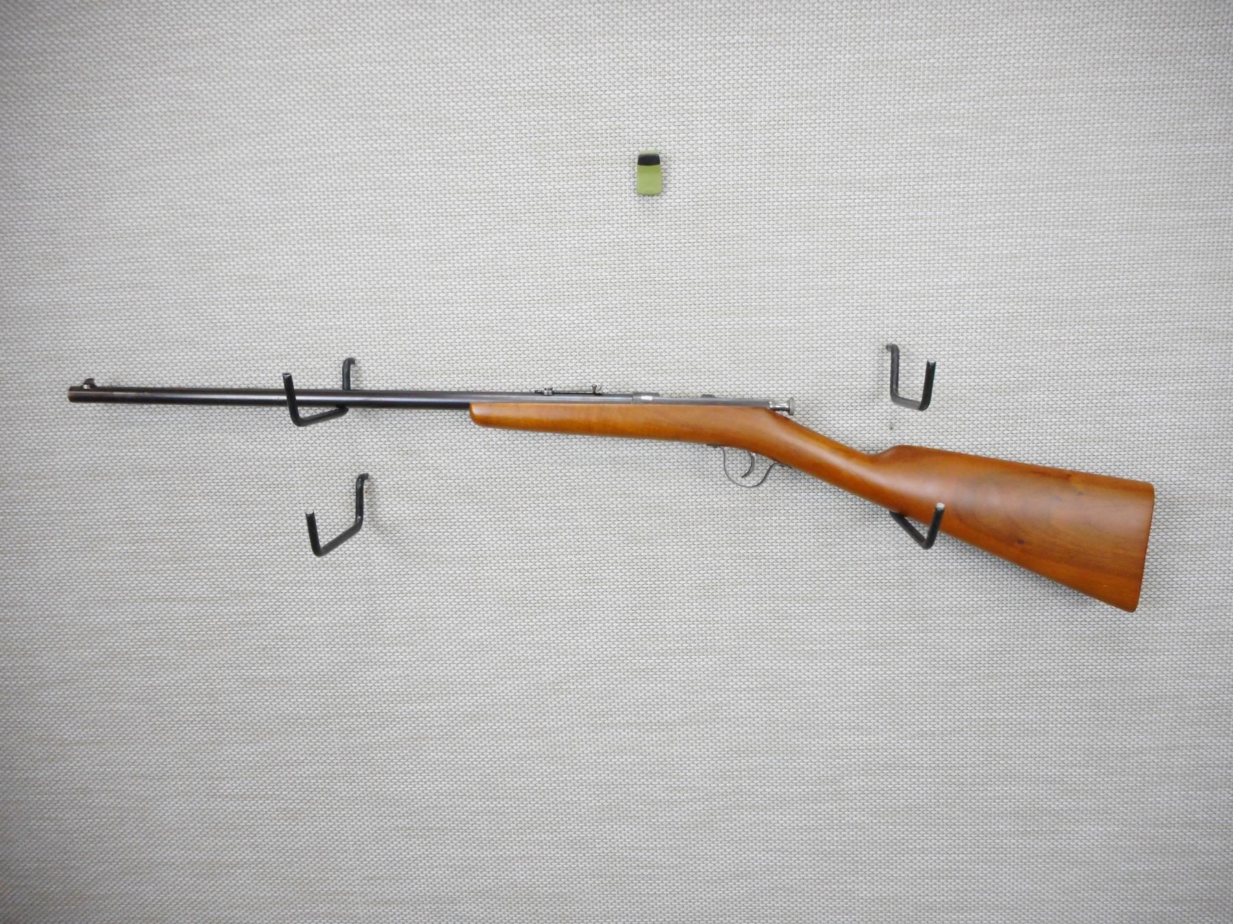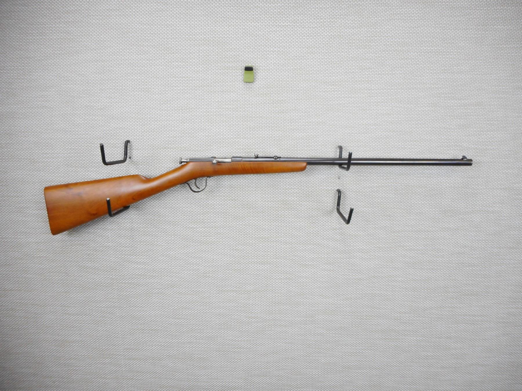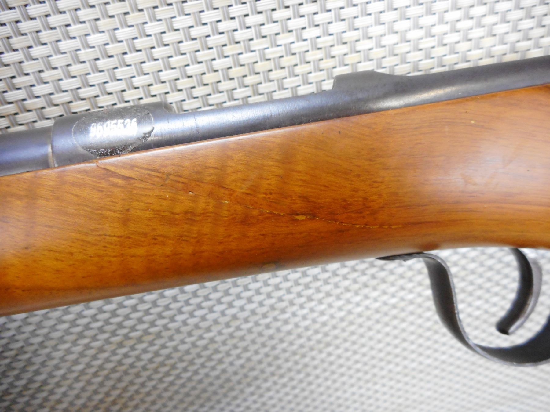 FABRIQUE NATIONAL , MODEL: SPORTER , CALIBER: 22 LR , BORE IS VERY GOOD WITH MINOR RING APPROX 1" FROM MUZZLE, THERE IS A HAIR LINE IN THE STOCK LEFT SIDE AT BREACH, RETAINS ORIGINAL EXTRACTOR, BLADE FRONT AND ADJUSTABLE REAR SIGHT, SHOWS VERY LITTLE HANDLING MARKS , ACTION: BOLT ACTION SINGLE SHOT RIFLE , BARREL LENGTH: 21" , CONDITION: 6/10 , STOCK # 9306 , SERIAL # N/A , CLASS: CANADIAN NON RESTRICTED CLASS