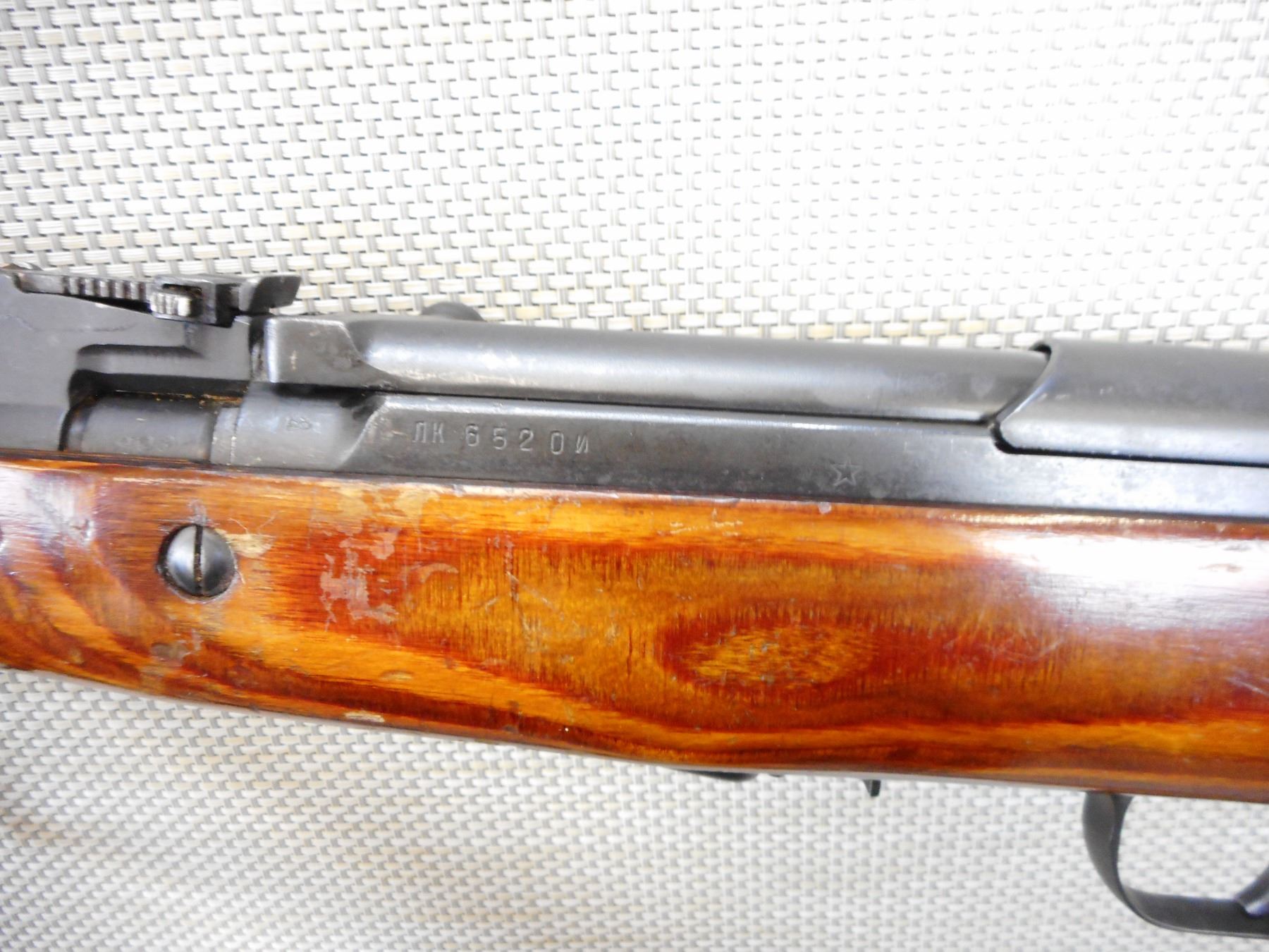 SIMINOV, MODEL: SKS, CALIBER: 7.62 X 39 , RECEIVER AND BOLT MATCH BY SERIAL#, BORE IS VERY GOOD, RETAINS ORIGINAL FOLDING BAYONET, LEATHER AND CANVAS SLING, HAS A LAMINATED STOCK, STEEL BUTT PLATE, SHOWS VERY LITTLE HANDLING MARKS, RUSSIAN MARKINGS ARE VISIBLE BUT NO ARSENAL MARKINGS , ACTION: SEMI AUTOMATIC RIFLE , BARREL LENGTH: 20 1/2" , CONDITION: 8/10 , STOCK # 9309 , SERIAL # 6520 , CLASS: CANADIAN NON RESTRICTED CLASS