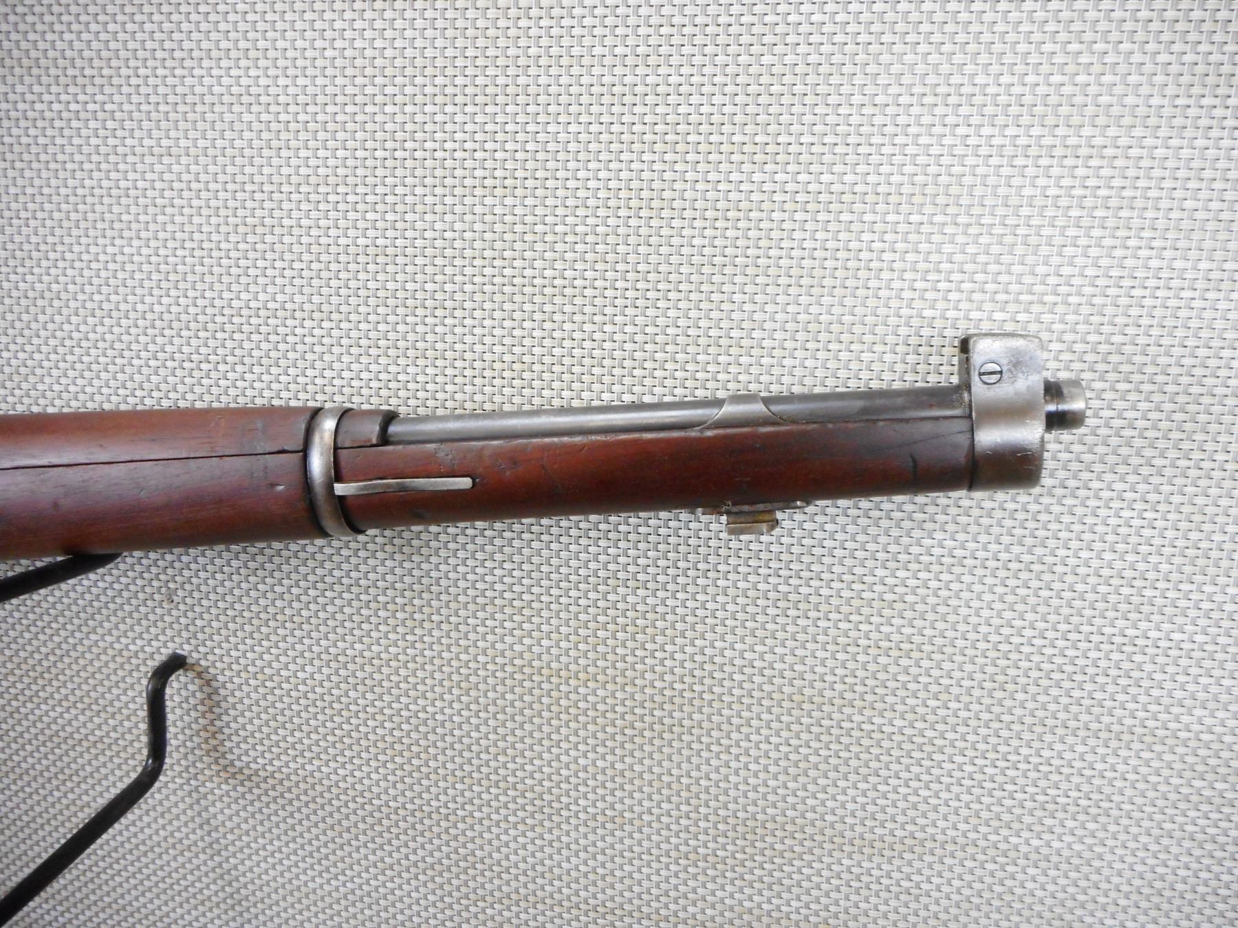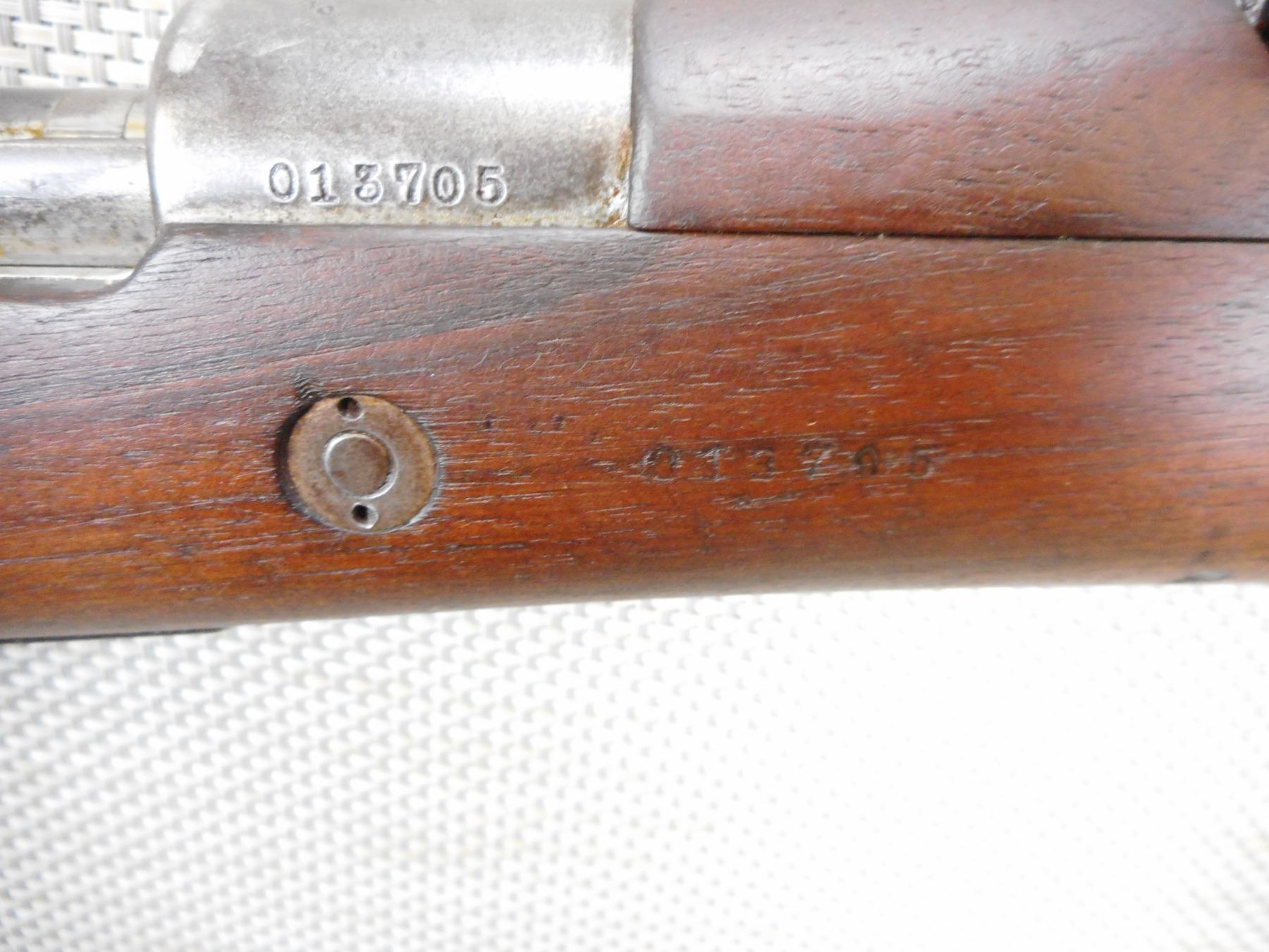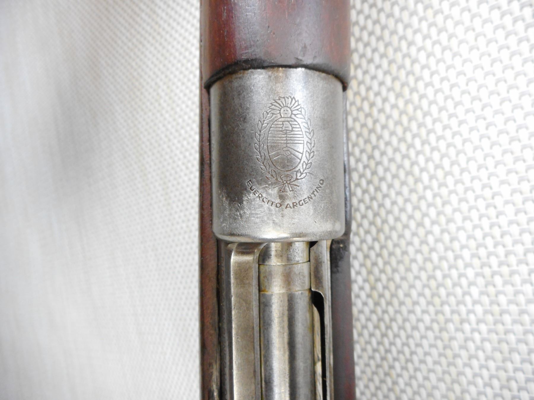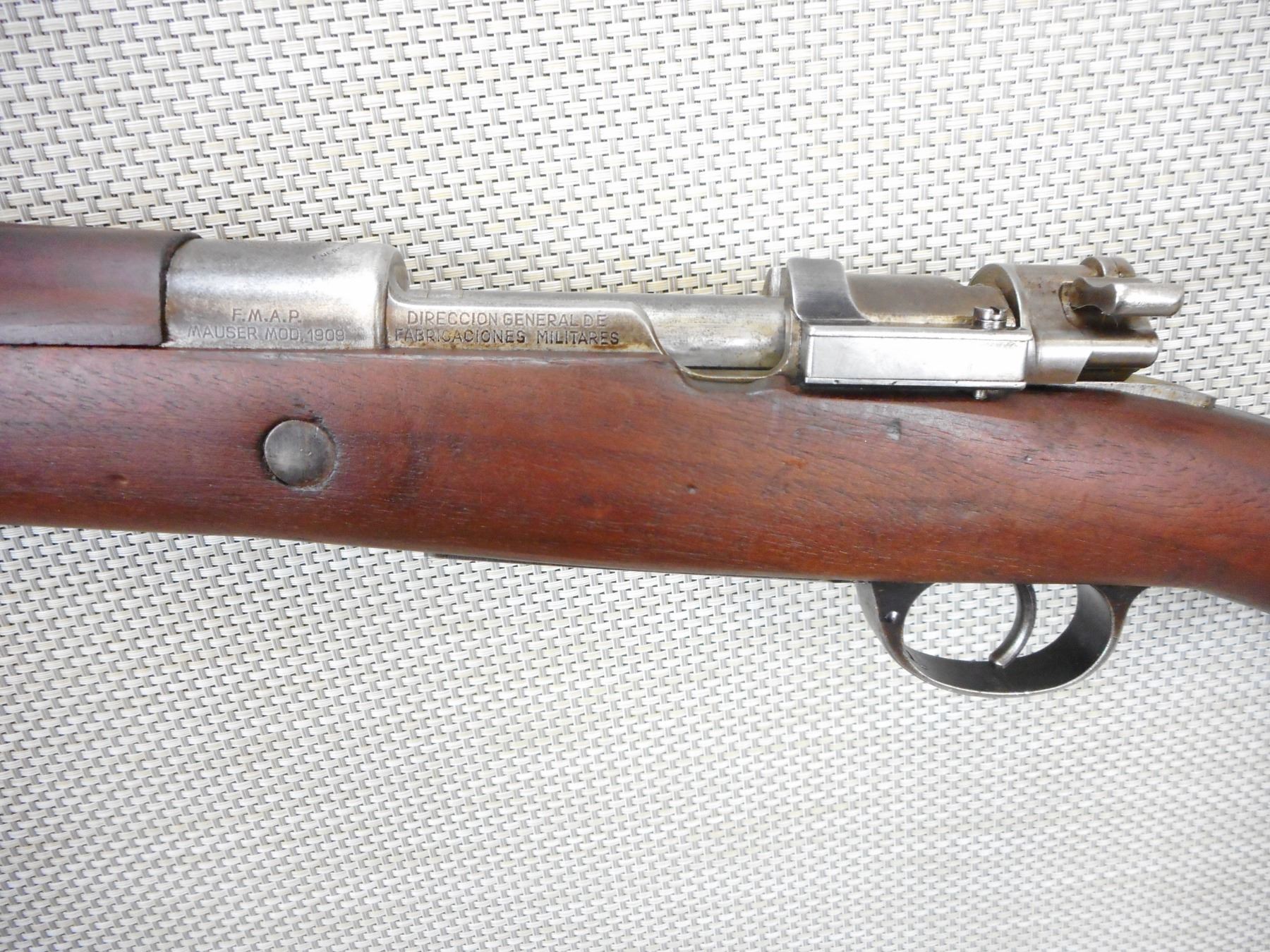 MAUSER, MODEL: 1909 ARGENTINE SHORT RIFLE , CALIBER: 7.65 X 53 MAUSRE , MANUFACTURED BY DGFM-FMAP, DATED 1909, ARGENTINA IS STAMPED ON THE RECEIVER, BOLT AND RECEIVER DON'T MATCH BY SERIAL #, BARLEY CORN FRONT AND ADJUSTABLE REAR SIGHTS, FEATURES ORGINAL MANNLICHER STOCK, BORE IS VERY GOOD, SLING SWIVEL LOOPS, SHOWS SOME HANDLING MARKS, STEEL BUTT PLATE , ACTION: BOLT ACTION RIFLE , BARREL LENGTH: 22" , CONDITION: 7/10 , STOCK # 9318 , SERIAL # 012872 , CLASS: CANADIAN NON RESTRICTED CLASS