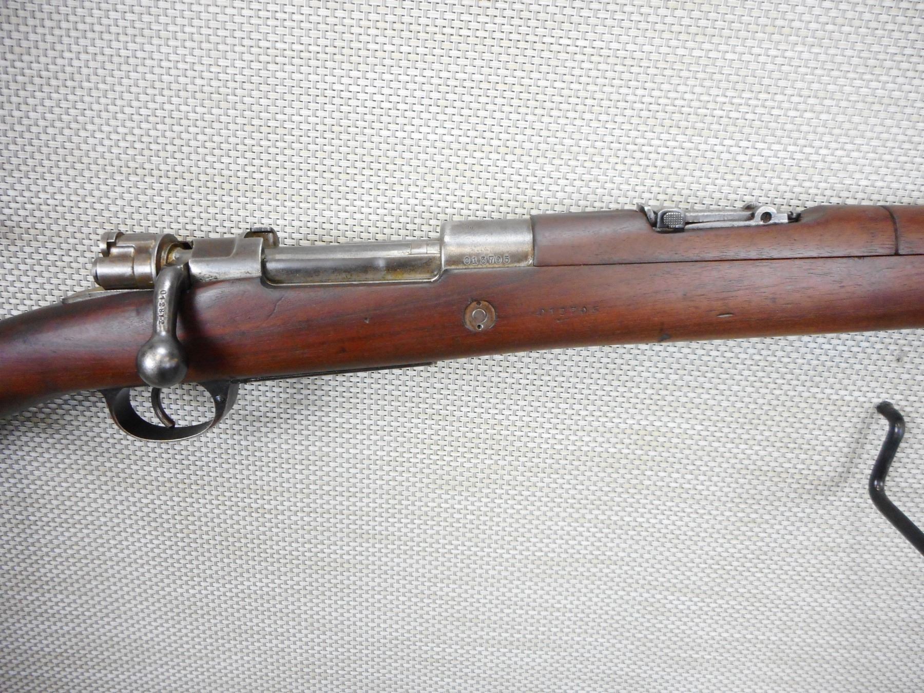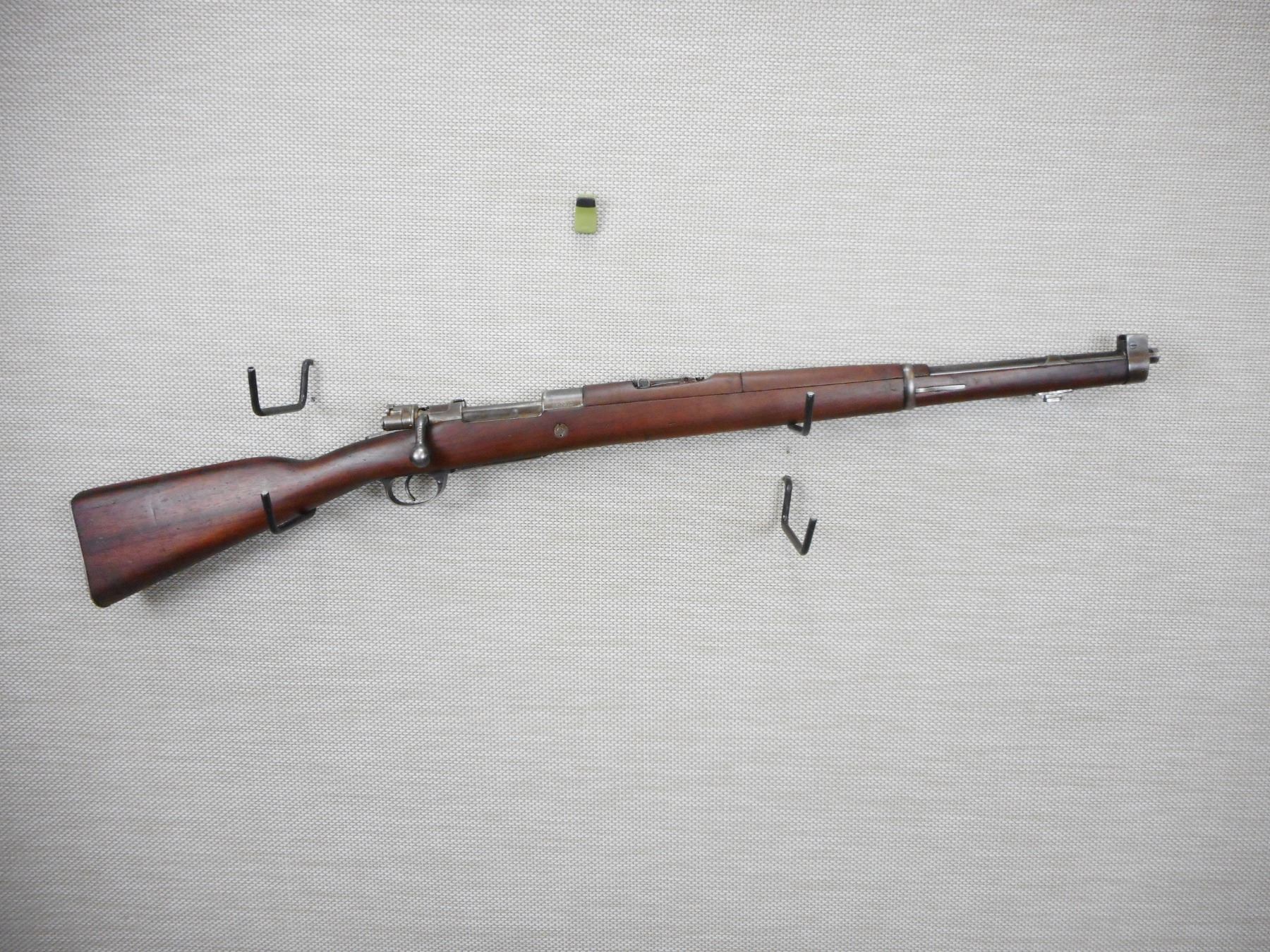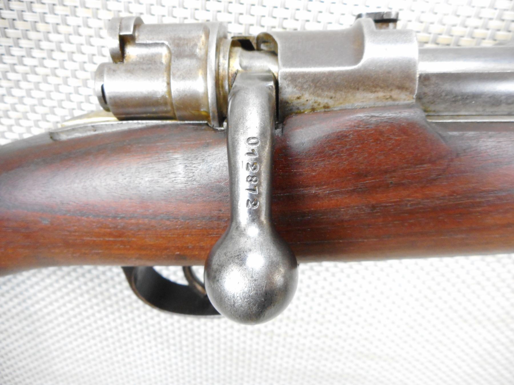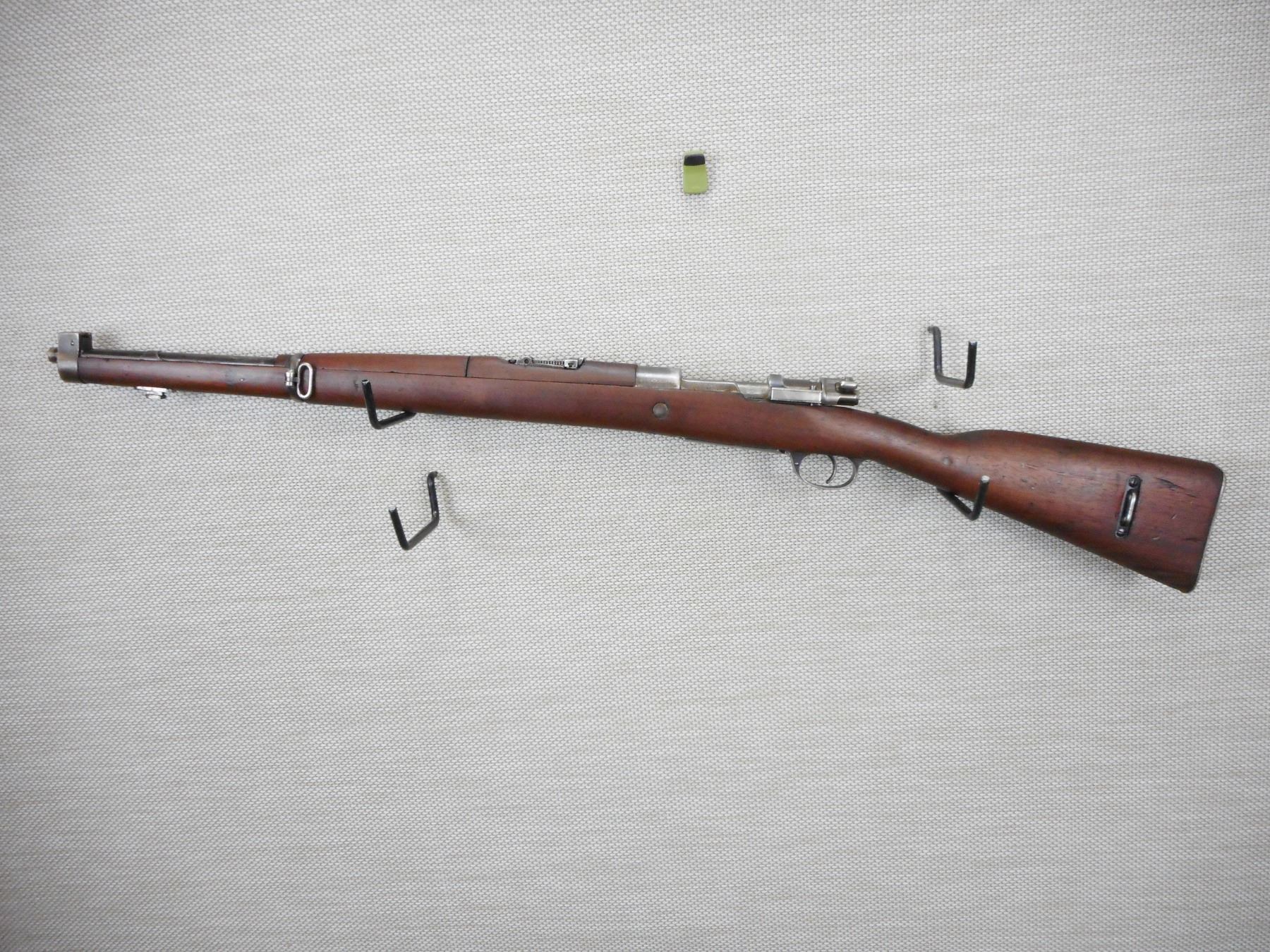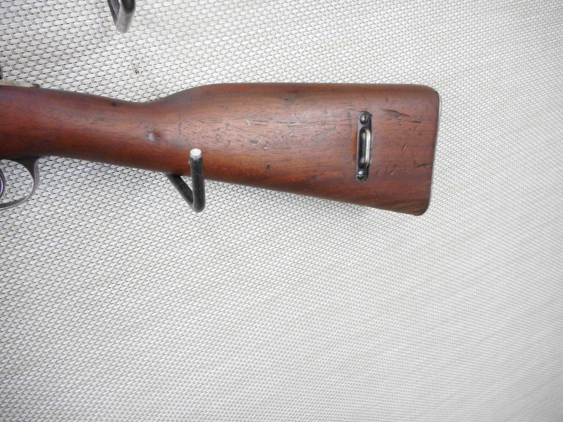 MAUSER, MODEL: 1909 ARGENTINE SHORT RIFLE , CALIBER: 7.65 X 53 MAUSRE , MANUFACTURED BY DGFM-FMAP, DATED 1909, ARGENTINA IS STAMPED ON THE RECEIVER, BOLT AND RECEIVER DON'T MATCH BY SERIAL #, BARLEY CORN FRONT AND ADJUSTABLE REAR SIGHTS, FEATURES ORGINAL MANNLICHER STOCK, BORE IS VERY GOOD, SLING SWIVEL LOOPS, SHOWS SOME HANDLING MARKS, STEEL BUTT PLATE , ACTION: BOLT ACTION RIFLE , BARREL LENGTH: 22" , CONDITION: 7/10 , STOCK # 9318 , SERIAL # 012872 , CLASS: CANADIAN NON RESTRICTED CLASS