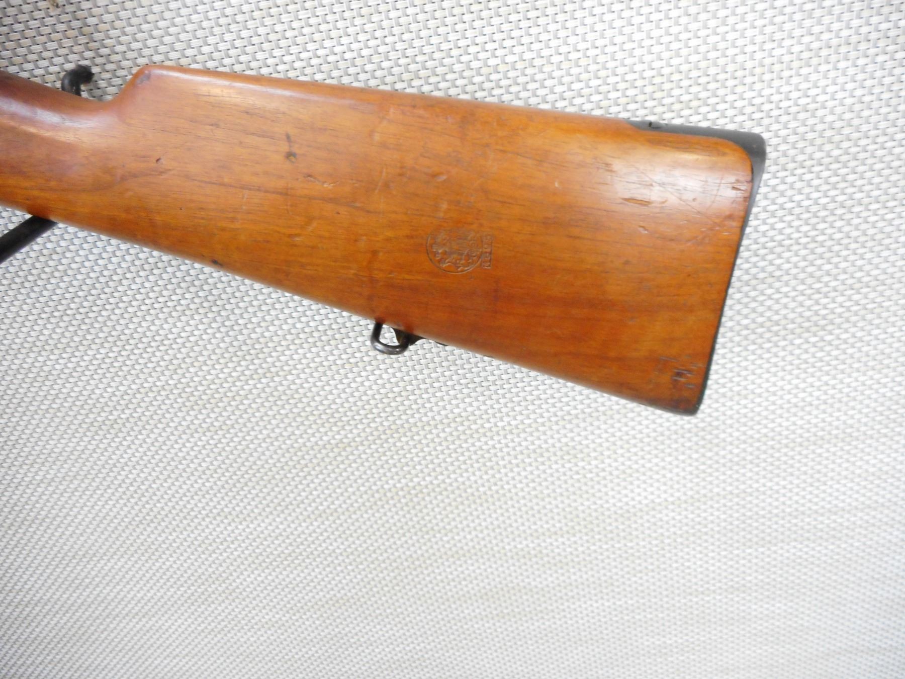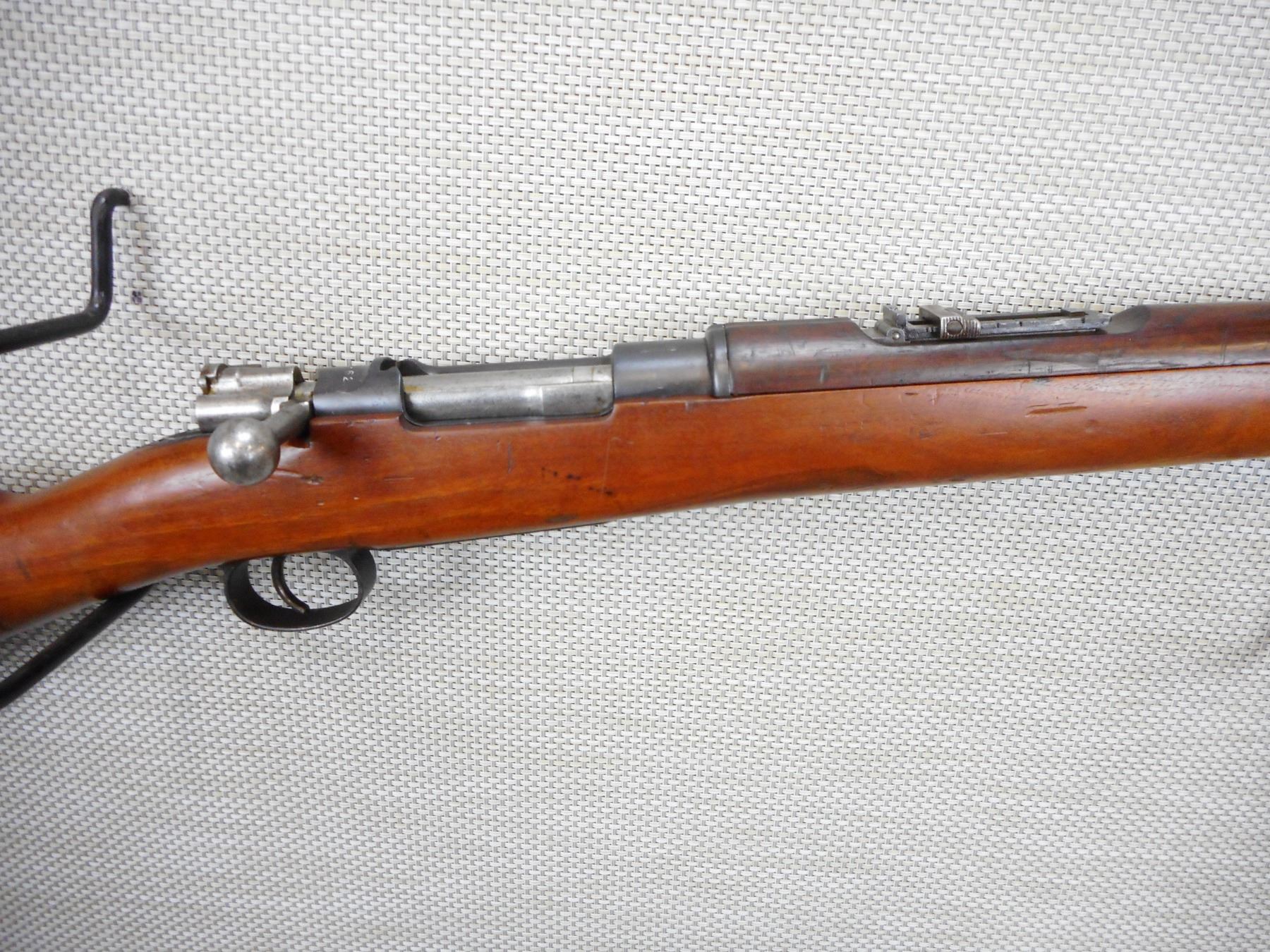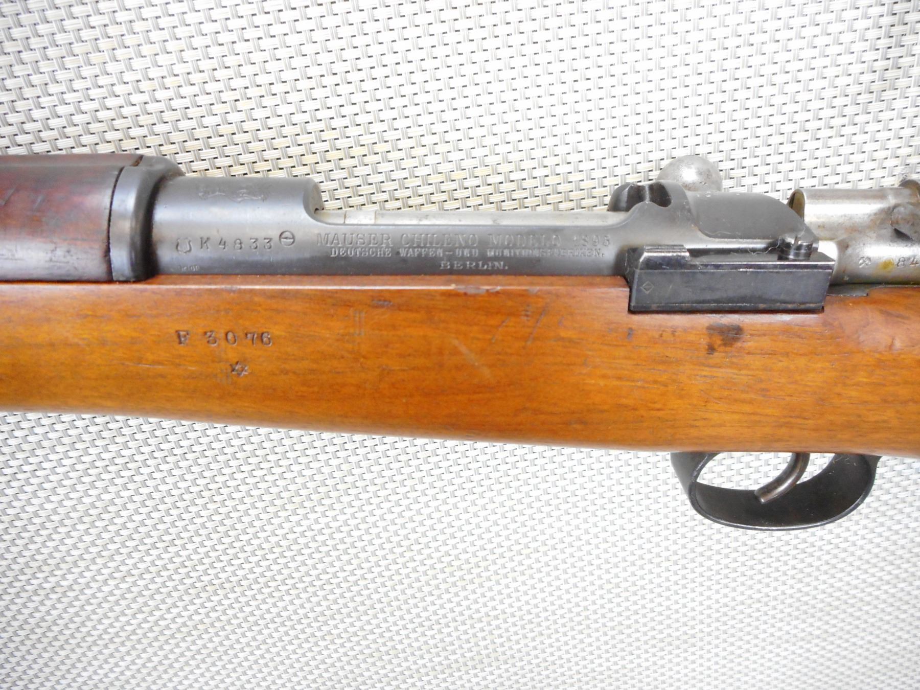 MAUSER, MODEL: 1895, CALIBER: 7.62 NATO, COMES WITH BAYONET AND SCABBARD, CHILEAN MAUSER, BOLT AND RECEIVER MATCH BY SERIAL #, REWORKED TO 7.62 NATO CALIBER, RETAINS FULL MILITARY CONFIGURATION, BLADE FRONT AND ADJUSTABLE REAR SIGHTS, SLING SWIVEL LOOPS, STEEL BUTT PLATE, SHOWS SOME HANDLING MARKS, VERY GOOD BORE , ACTION: BOLT ACTION RIFLE , BARREL LENGTH: 29" , CONDITION: 7/10 , STOCK # 9320 , SERIAL # K4833 , CLASS: CANADIAN NON RESTRICTED CLASS