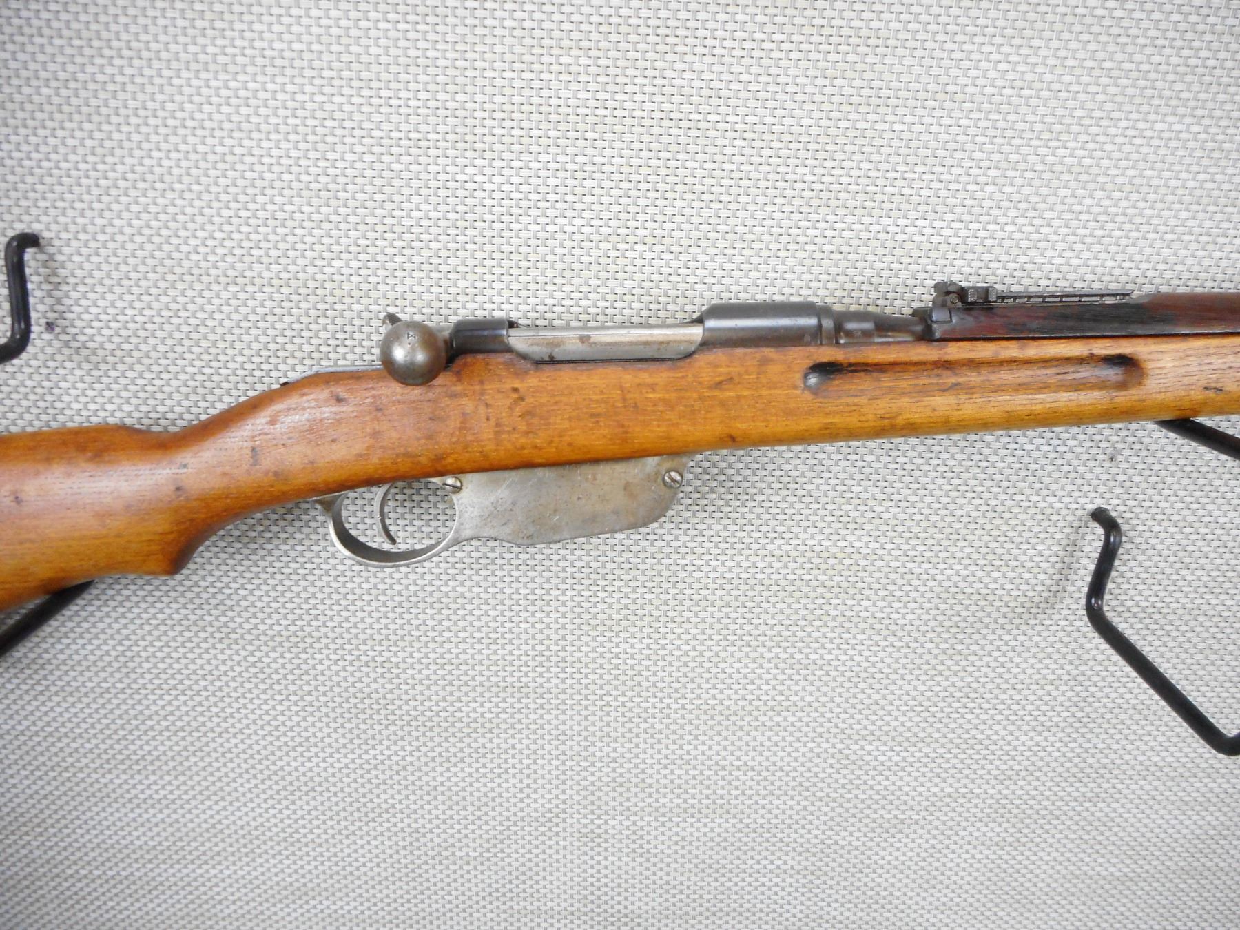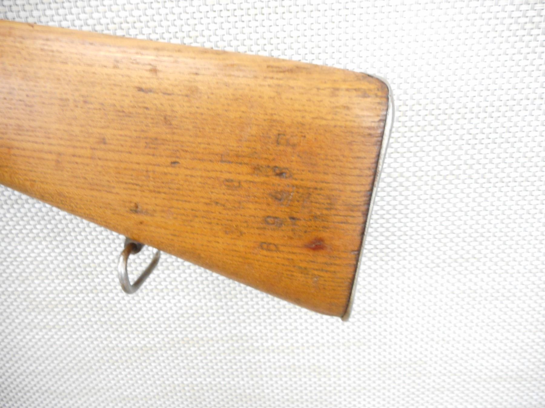 MANNLICHER, MODEL: M95, CALIBER: 8 X 56 HUNGARIAN, COMES WITH BAYONET AND SCABBARD BOLT AND RECEIVER DON'T MATCH BY SERIAL #, MARKED BUDAPEST ON THE RECEIVER, BORE IS GOOD BORE WITH DARK STRONG RIFLING , BLADE FRONT AND ADJUSTABLE REAR SIGHTS, STOCK IS CHIPPED AT THE BUTT, SLING SWIVEL LOOPS, SHOWS SOME HANDLING MARKS, STEEL BUTT PLATE , ACTION: BOLT ACTION RIFLE , BARREL LENGTH: 30" , CONDITION: 6/10 , STOCK # 9321 , SERIAL # 6593H , CLASS: CANADIAN NON RESTRICTED CLASS