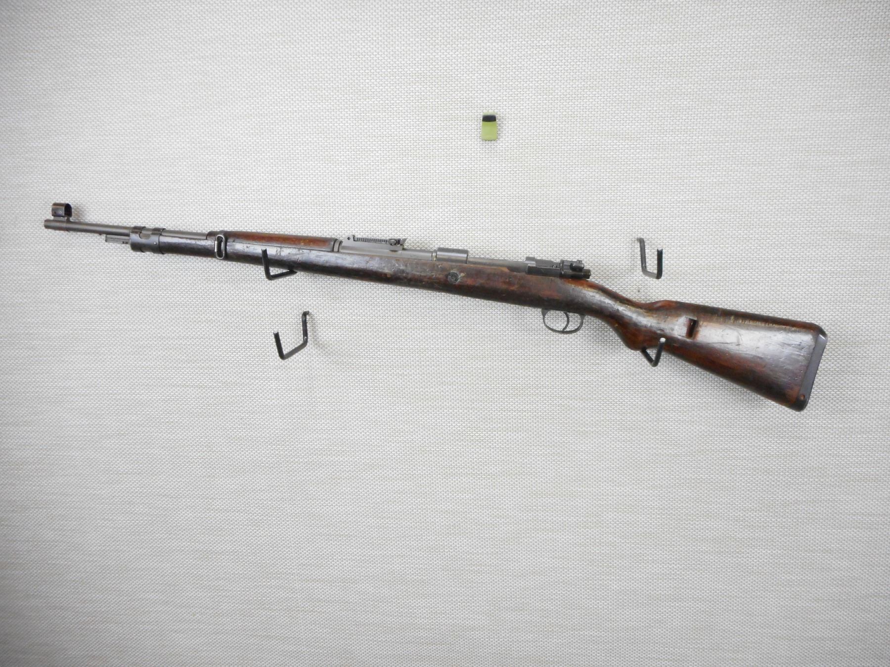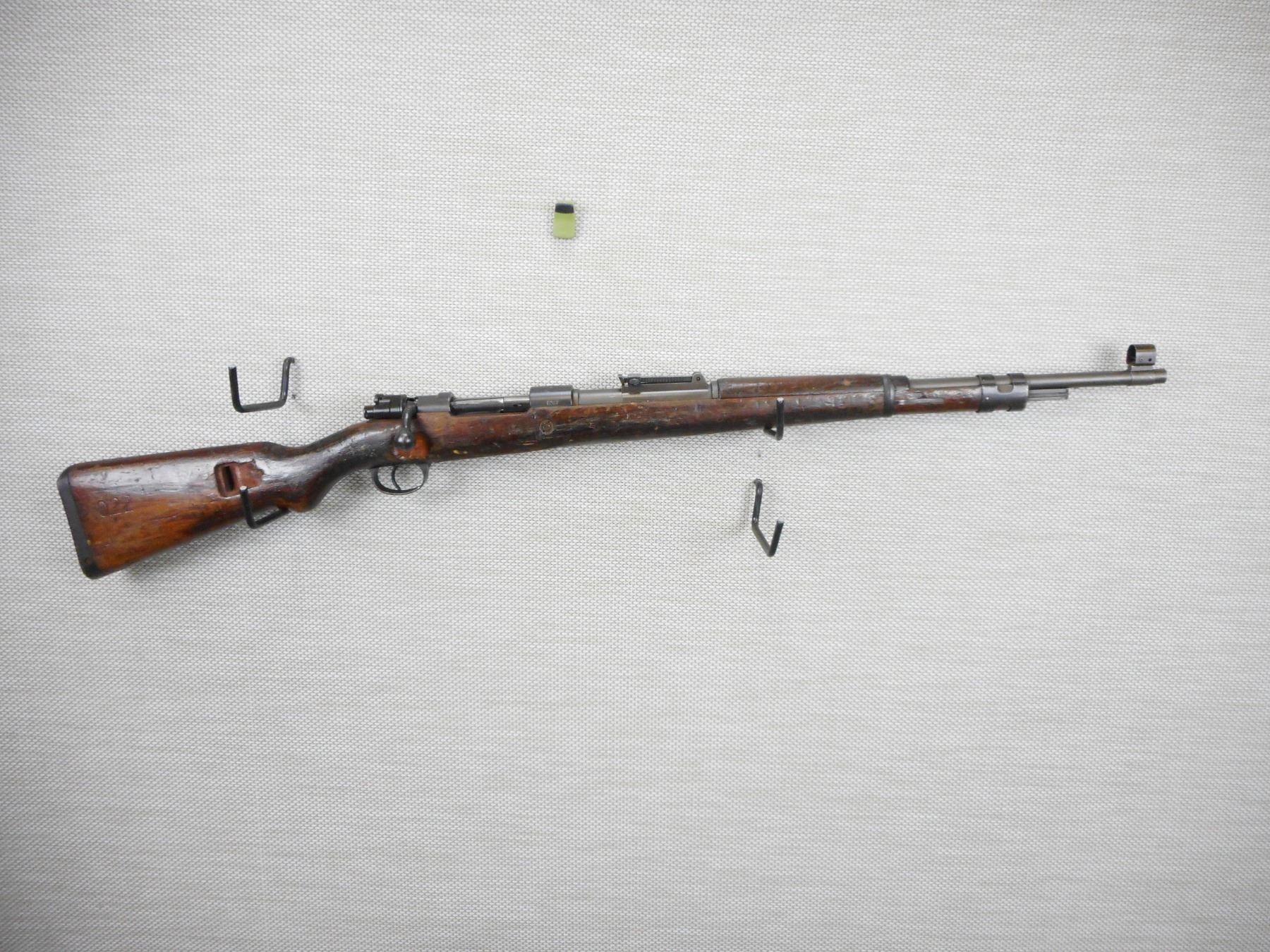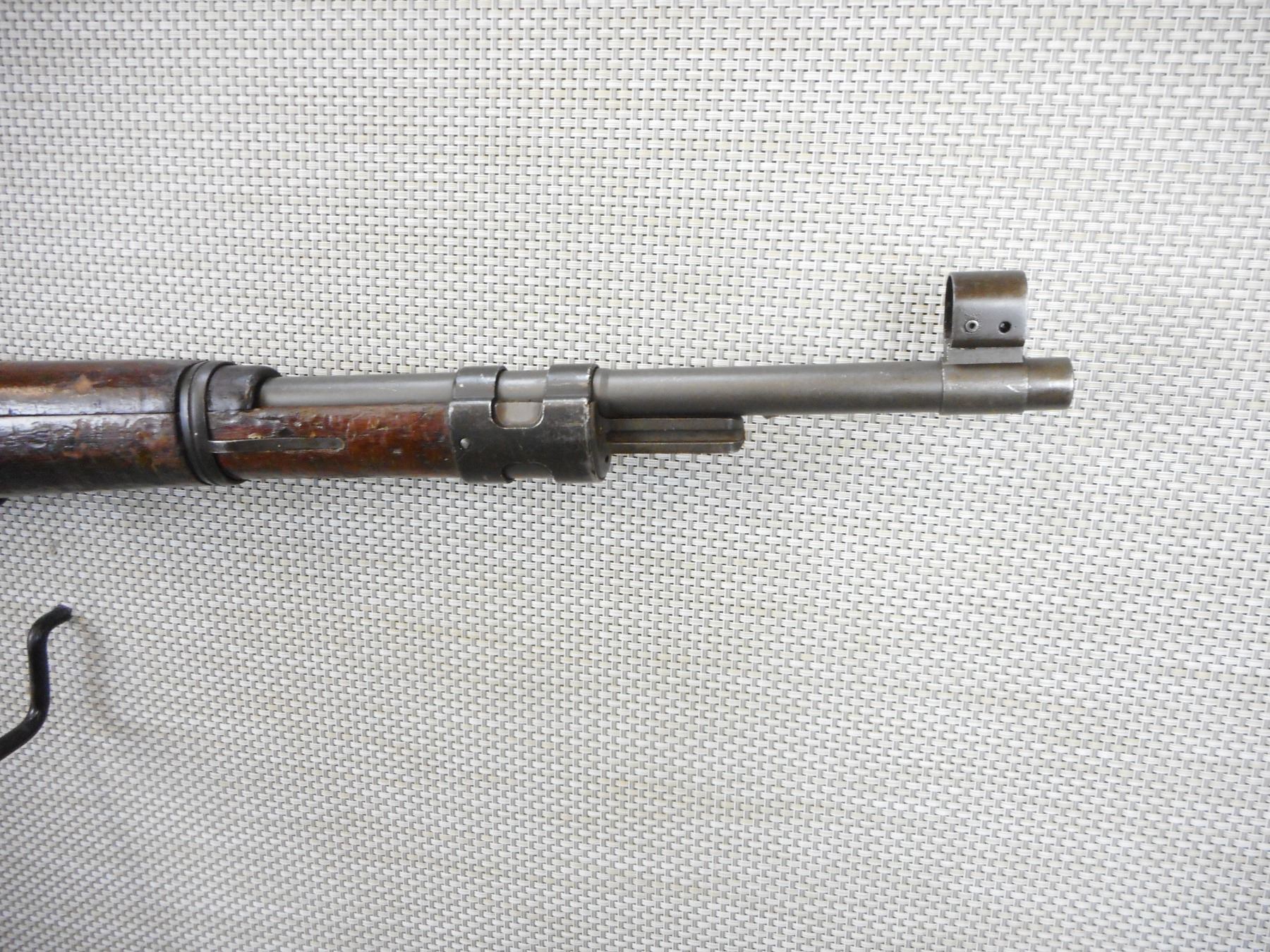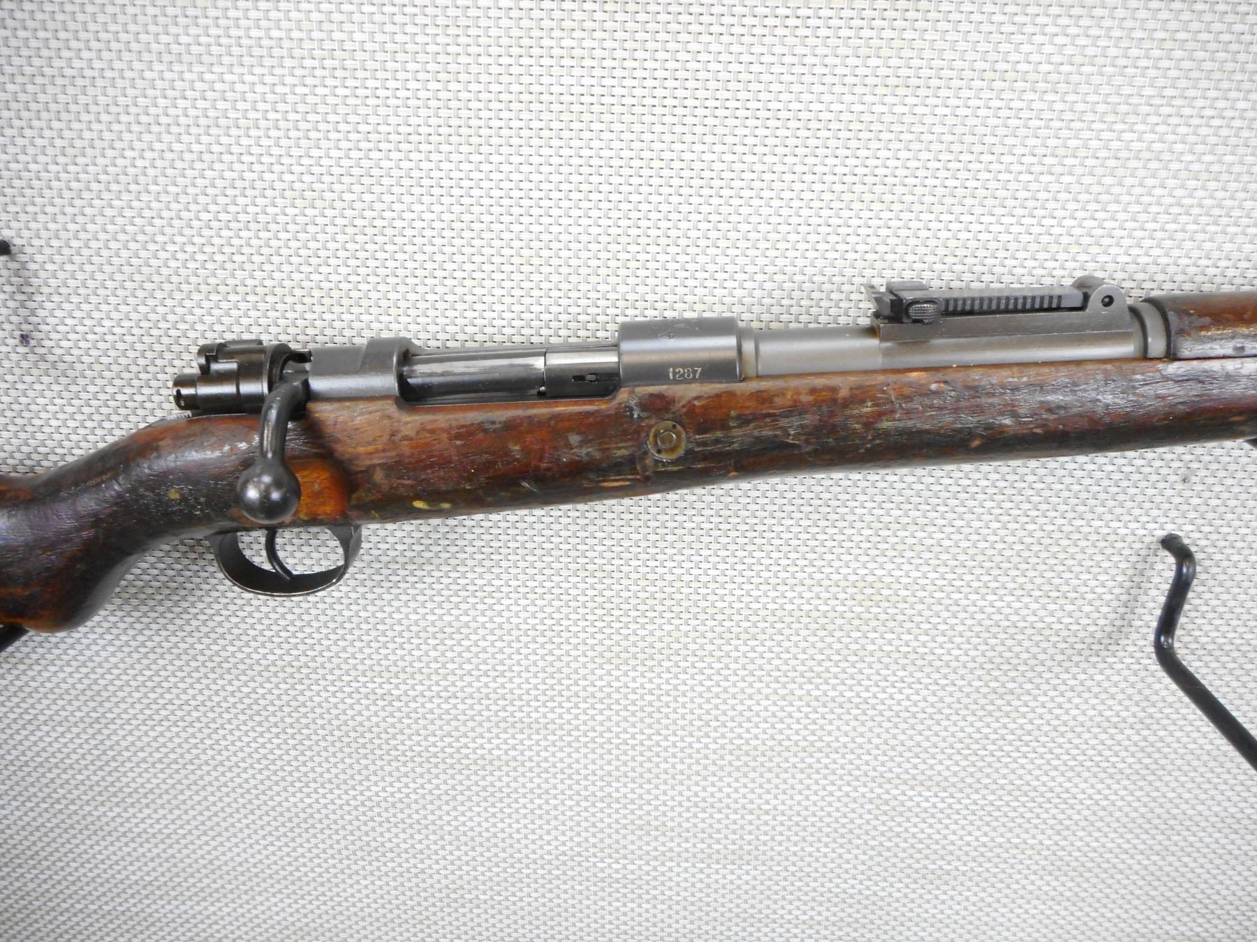 MAUSER, MODEL: 98, CALIBER: 22 LR, COMES WITH BAYONET AND SCABBARD, ISREALI MAUSER MADE IN BELGIUM BY FN, BOLT AND RECEIVER MATCH BY SERIAL # , CONVERTED TO 22 LR FOR MILLITARY TRAINING, EXCELLENT BORE, HOODED FRONT SIGHT AND ADJUSTABLE REAR SIGHT, SLING SWIVEL LOOPS, SHOWS SOME HANDLING MARKS, STEEL BUTT PLATE , ACTION: BOLT ACTION SINGLE SHOT RIFLE , BARREL LENGTH: 24" , CONDITION: 6/10 , STOCK # 9332 , SERIAL # 1287 , CLASS: CANADIAN NON RESTRICTED CLASS