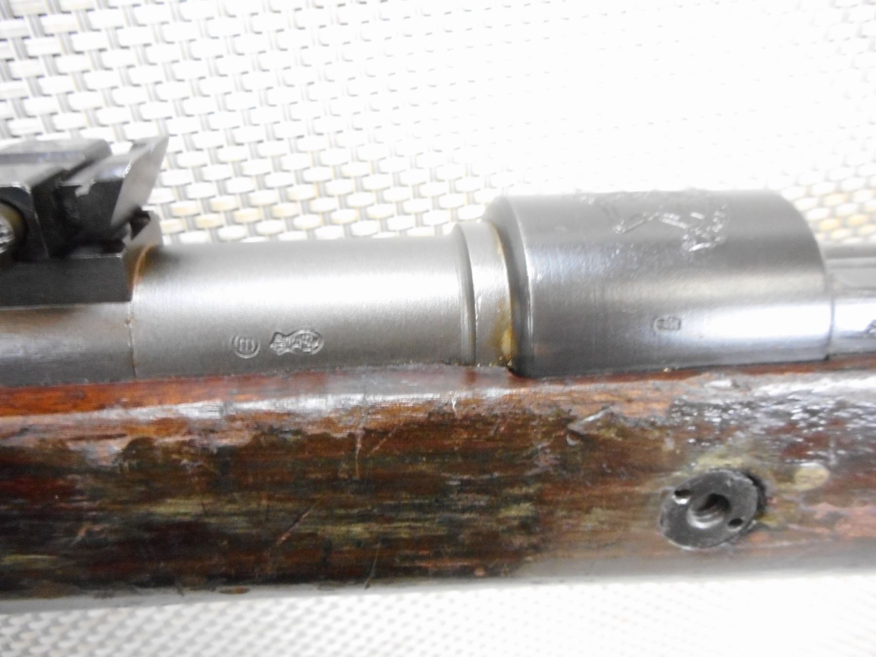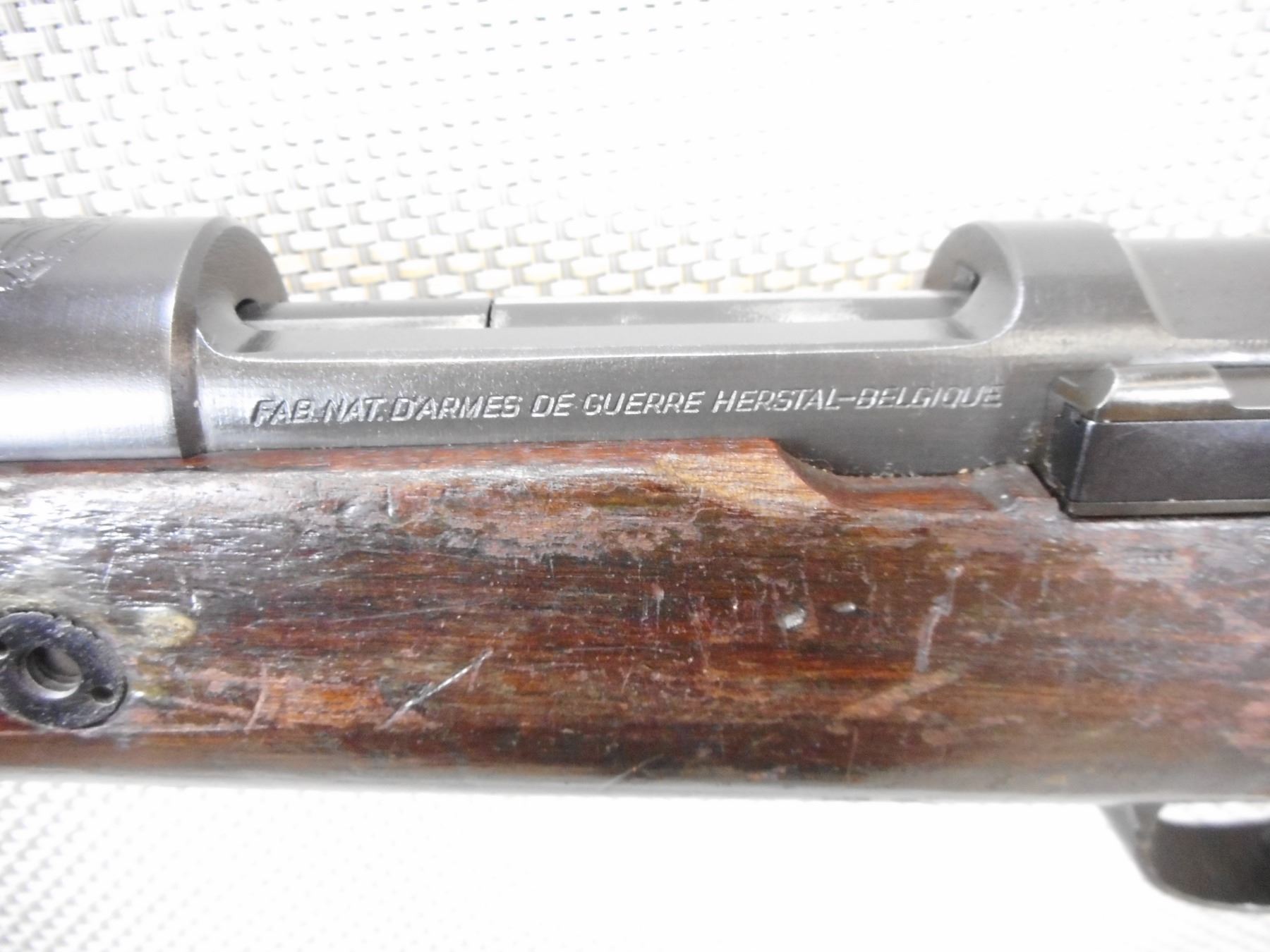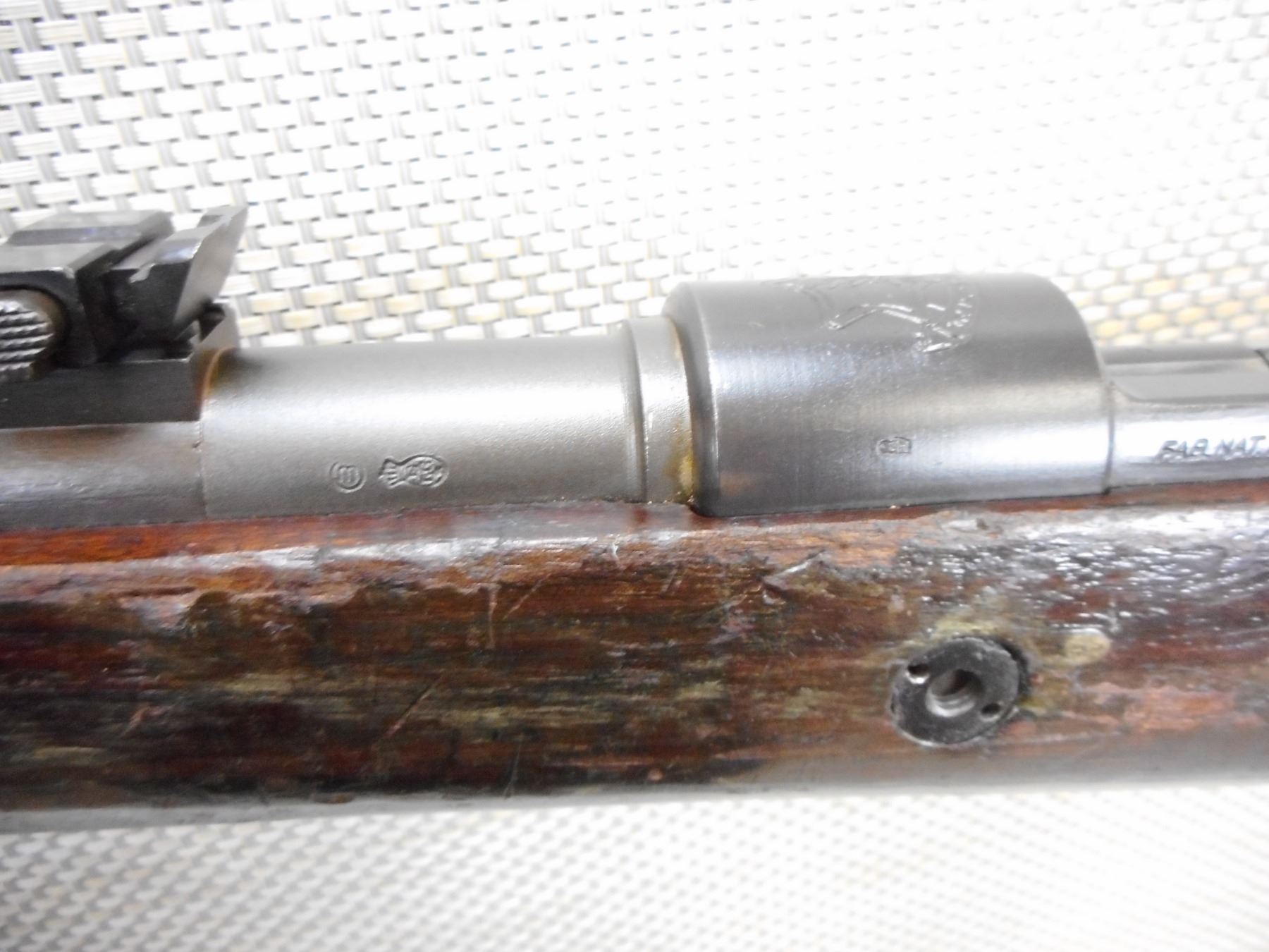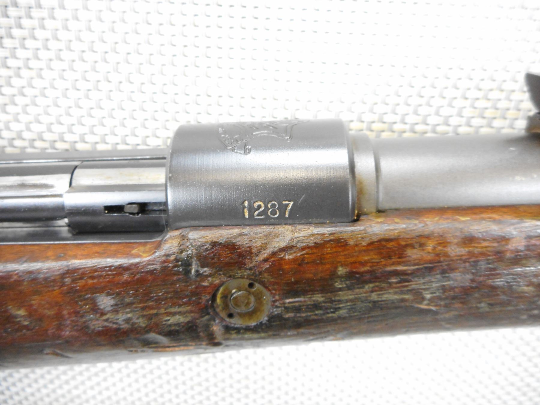 MAUSER, MODEL: 98, CALIBER: 22 LR, COMES WITH BAYONET AND SCABBARD, ISREALI MAUSER MADE IN BELGIUM BY FN, BOLT AND RECEIVER MATCH BY SERIAL # , CONVERTED TO 22 LR FOR MILLITARY TRAINING, EXCELLENT BORE, HOODED FRONT SIGHT AND ADJUSTABLE REAR SIGHT, SLING SWIVEL LOOPS, SHOWS SOME HANDLING MARKS, STEEL BUTT PLATE , ACTION: BOLT ACTION SINGLE SHOT RIFLE , BARREL LENGTH: 24" , CONDITION: 6/10 , STOCK # 9332 , SERIAL # 1287 , CLASS: CANADIAN NON RESTRICTED CLASS