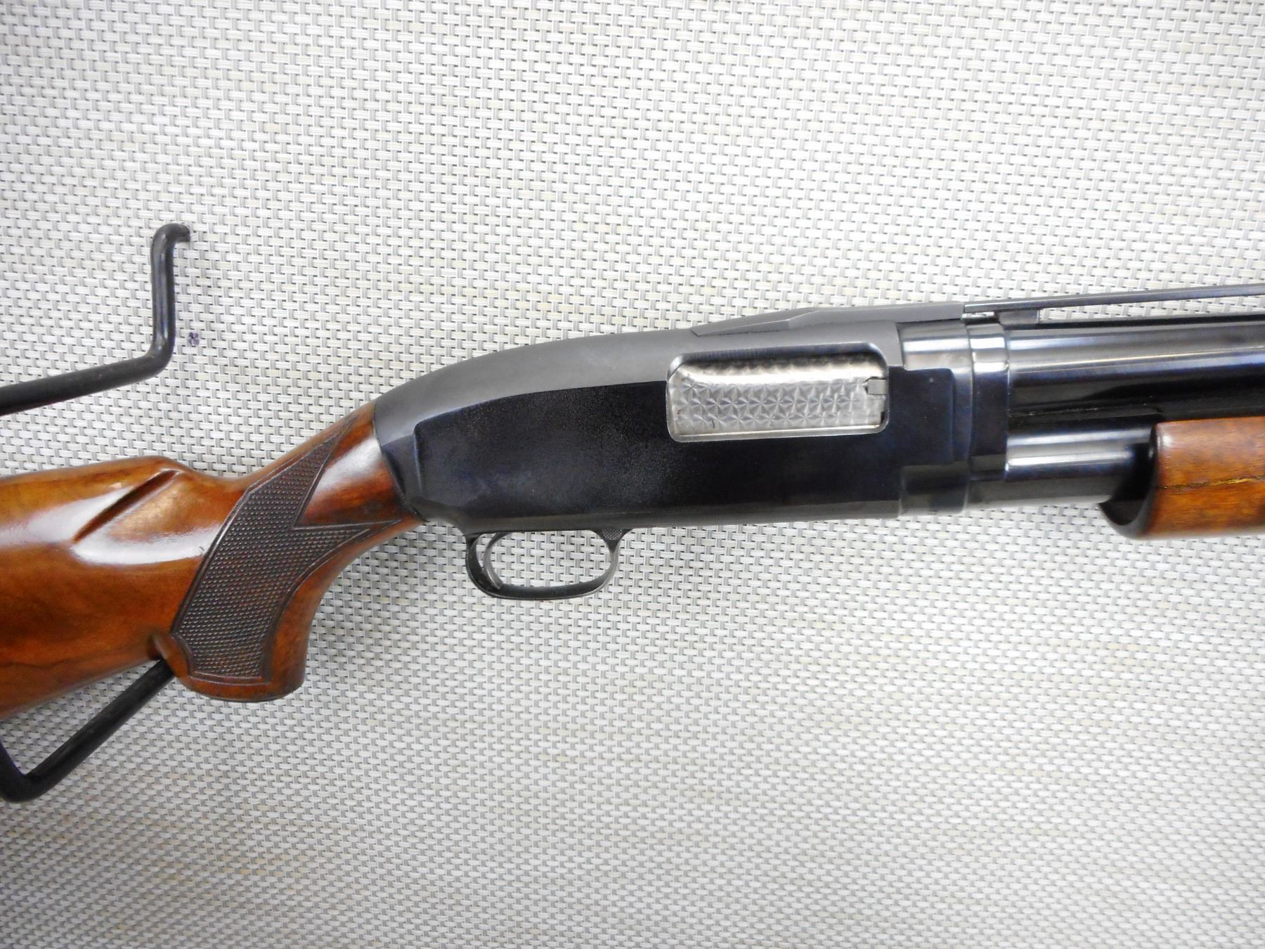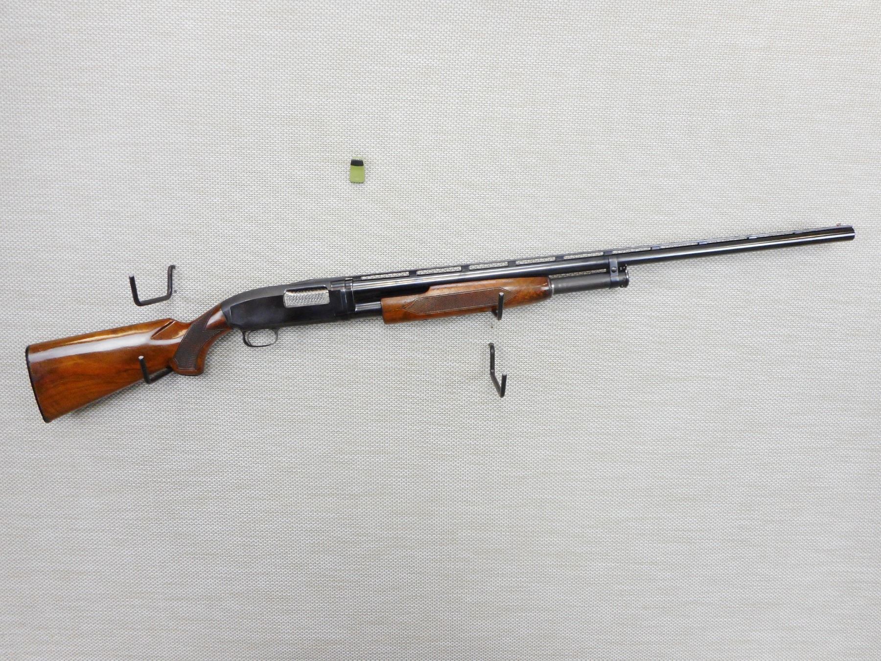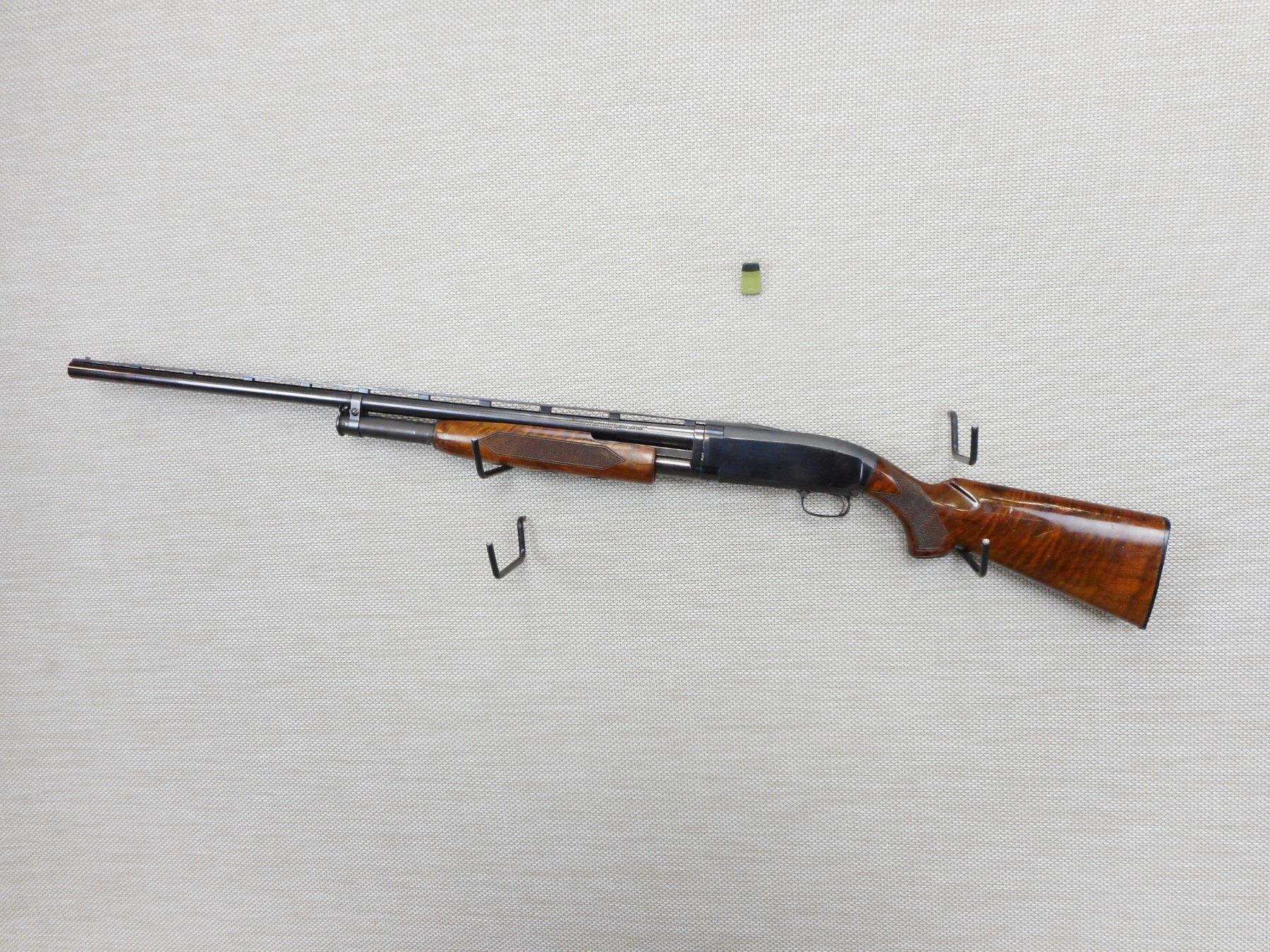 WINCHESTER, MODEL: 12, CALIBER: 12GGA X 2 3/4" , FIBER OPTIC FRONT AND BRASS MID BEAD SIGHTS WITH A VENTED RIB,EXCELLENT BORE, FIXED FULL CHOKE, CHECKERED FOREND AND CAPPED PISTOL GRIP BUTT STOCK, STOCK IS CRACKED AT THE WRIST, MANUFACTURED IN 1973, PLASTIC BUTT PLATE, SHOWS SOME HANDLING MARKS , ACTION: PUMP ACTION SHOTGUN , BARREL LENGTH: 30" , CONDITION: 7/10 , STOCK # 9350 , SERIAL # Y2019820 , CLASS: CANADIAN NON RESTRICTED CLASS